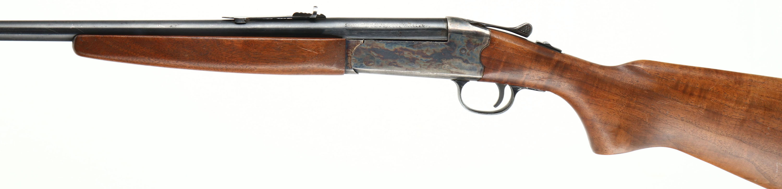Savage, Model 219, .30-30, MFG. 1938-65, SN: None, Break single shot, Take-down, 26'' barrels. The original flat pistol grip wood stocks are very good & solid, retaining most of the original finish with few minor handling marks & scratches. The right side of stock has previous owner's painted artwork of a standing elk. The original factory blue finish on barrel rates 95%. The receiver display muted & fading case-colors. Original buttplate. Barrel carries an adjustable rear & ramped front blade sights. Bore is excellent. FFL or C&R Req. - Value: 150 to 300