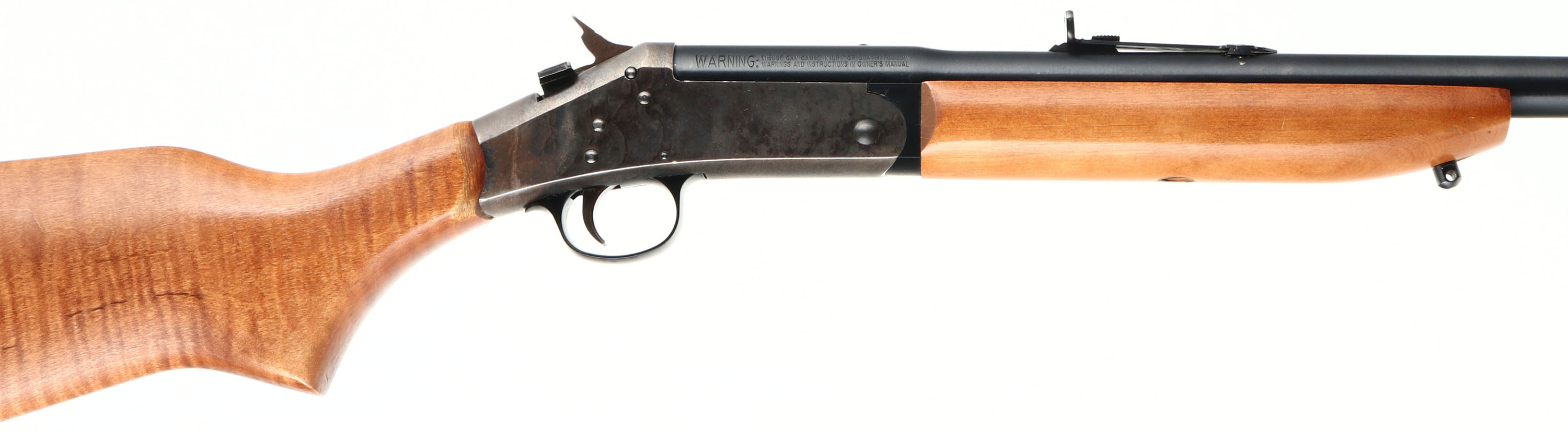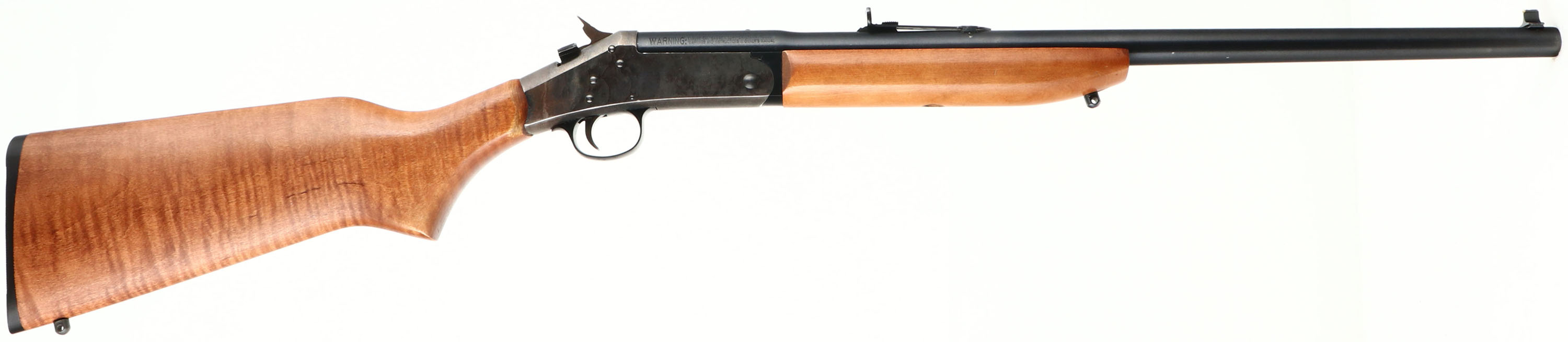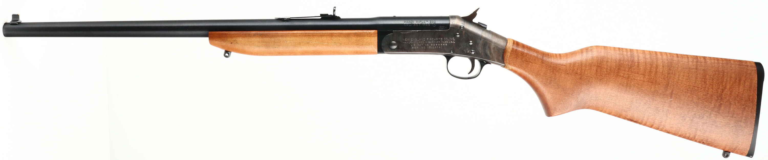 New England Firearms, Handi-Rifle SB2, CAL: .357 MAG, MFG: Modern, SN: NE218220, Break Action Single Shot Rifle, 22'' barrel. The flat pistol grip wood stock & forend are excellent, with light handling wear & minor scuffs at the wrist to the original finish. The metal blue finish on the barrel rates 98%. The receiver is case-hardened, retaining faint case-colors. Bore is excellent. The barrel is tapped & drilled for scope mounting, with two of the three screw holes open. The barrel holds factory iron sights. Sling studs. Stock carries a grooved plastic buttplate. FFL Req. - Value: 200 to 400