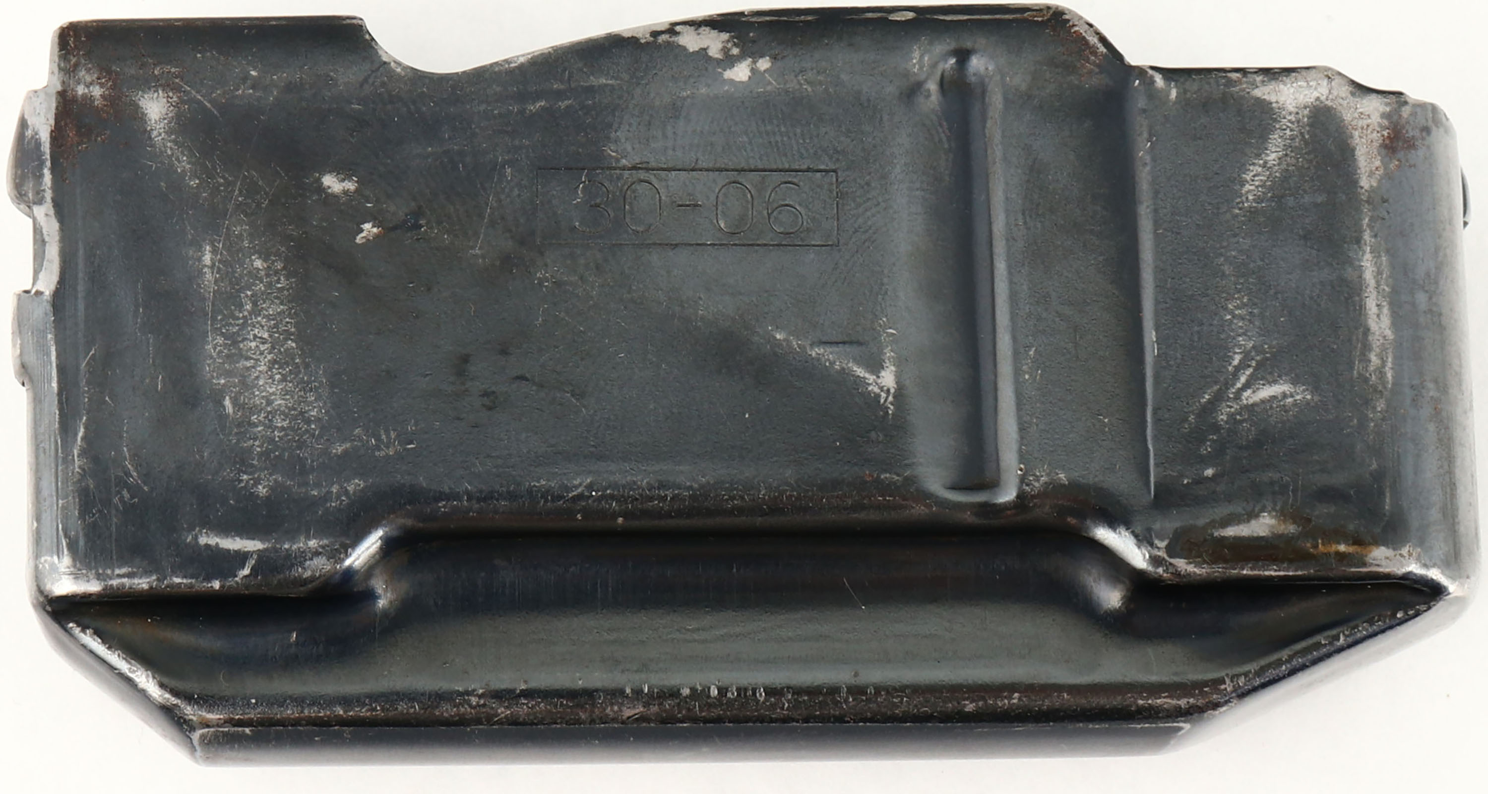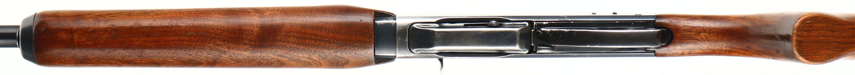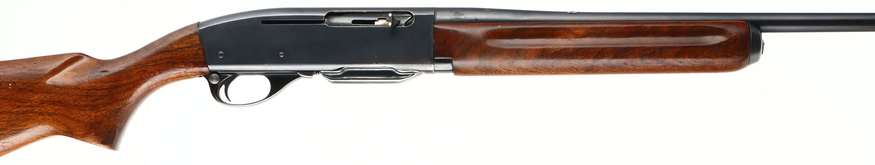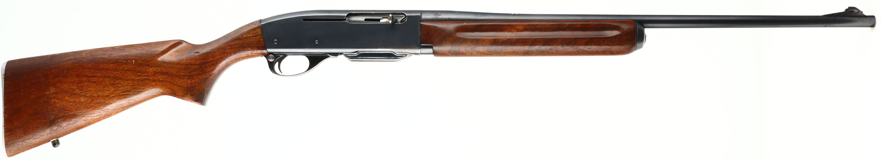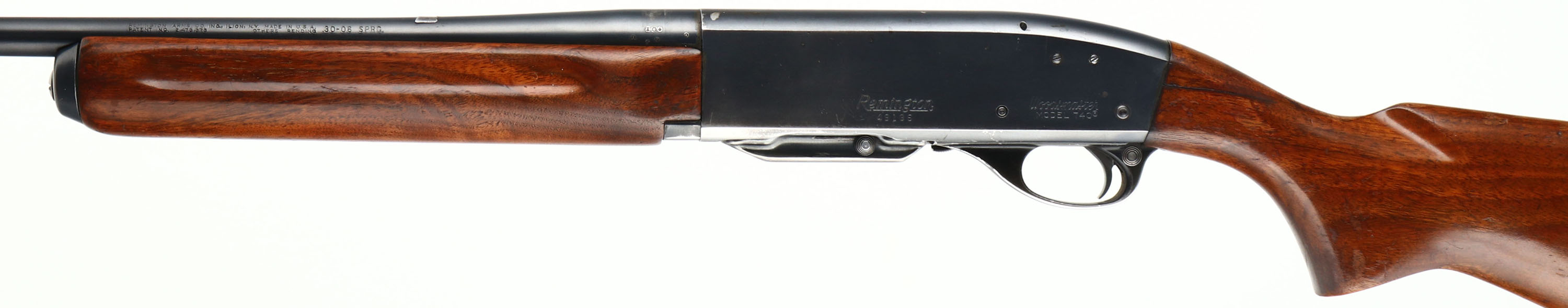 Remington Woodsmaster Model 740, CAL 30-06, MFG: 1956, SN: 49196, Semi-Auto Rifle, 22'' barrel. Second year rifle. The original flat pistol grip wood stocks are good & solid, despite 2'' stress cracks on each side of wrist emanating from the receiver. There is thinning & flaking of the original finish & some minor scrapes & contusions. The original metal blue finish rates 85% overall. Bore is very good & bright. The receiver carries four open holes on top from previous scope block mounting, an additional hole on the back left edge & two screw filled holes on the left side of receiver for side mount receiver sight mounting. The barrel holds a blank filled rear dovetail & blade front sight. Buttstock carries a Remington marked metal buttplate. Comes with a second removable mag. Single rear sling stud. FFL or C&R Req. - Value: 300 to 500