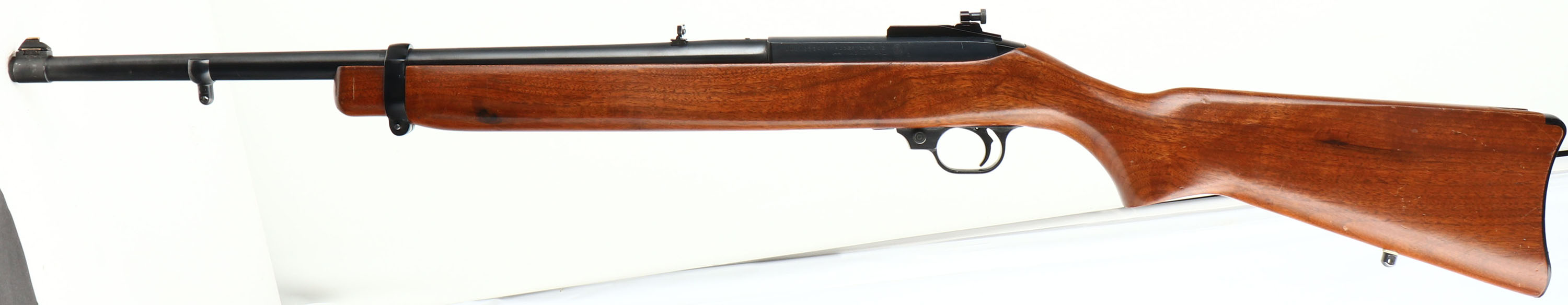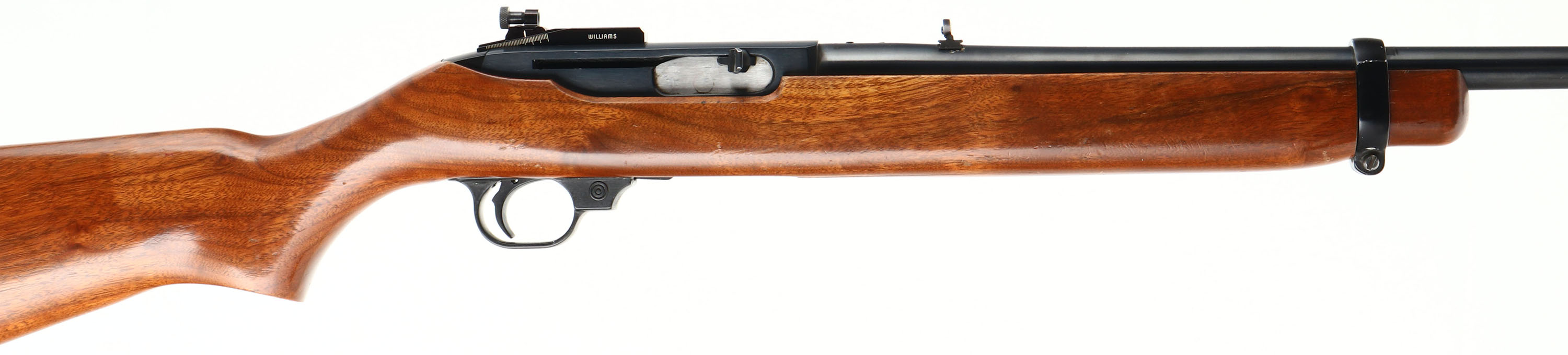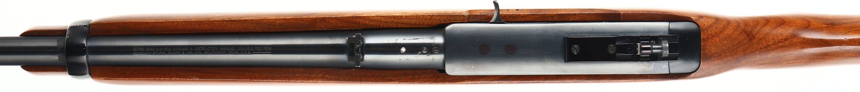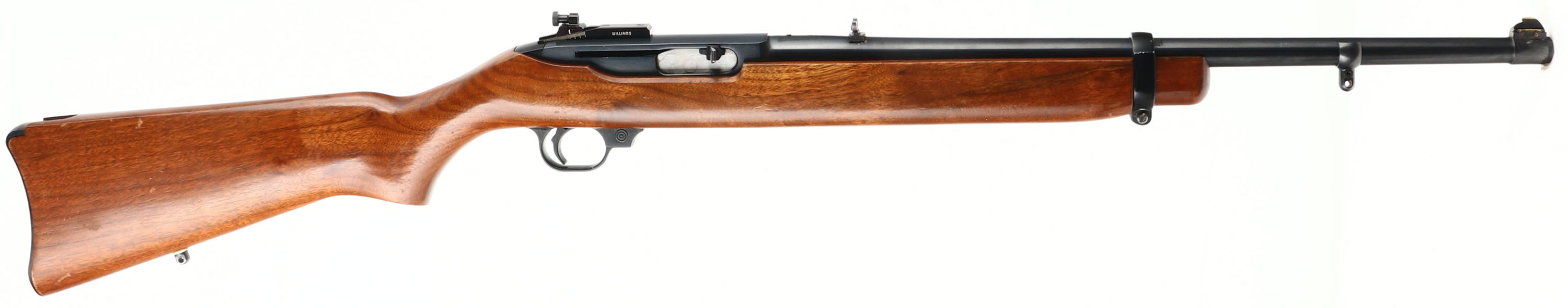 Ruger, Ruger Carbine .44 Magnum, CAL: .44 MAG, MFG: 1975-85, SN: 102-83848, Semi Auto Rifle, 18 3/4'' barrel. The original flat pistol grip stock is excellent, which minor contusions, scrapes & dings to the original finish. The is a tight 5'' grain crack in front of the mag loading port on the bottom of the forend. The metal blue finish on the barrel & receiver rates 97% overall. Bore is excellent. The chamber end of the barrel is tapped & drilled, with (2) filled screw holes & the front screw head is broken off. The receiver is tapped & drilled, with the two rear holes holding an adjustable Williams peep sight. The barrel holds a folding leaf rear sight & blade front sight. Factory rear sling stud & additional barrel band sling stud. Stock carries factory metal buttplate. Concealed within the stock is a tubular magazine that holds four rounds that are loaded shotgun style. FFL Req. - Value: 500 to 1000
