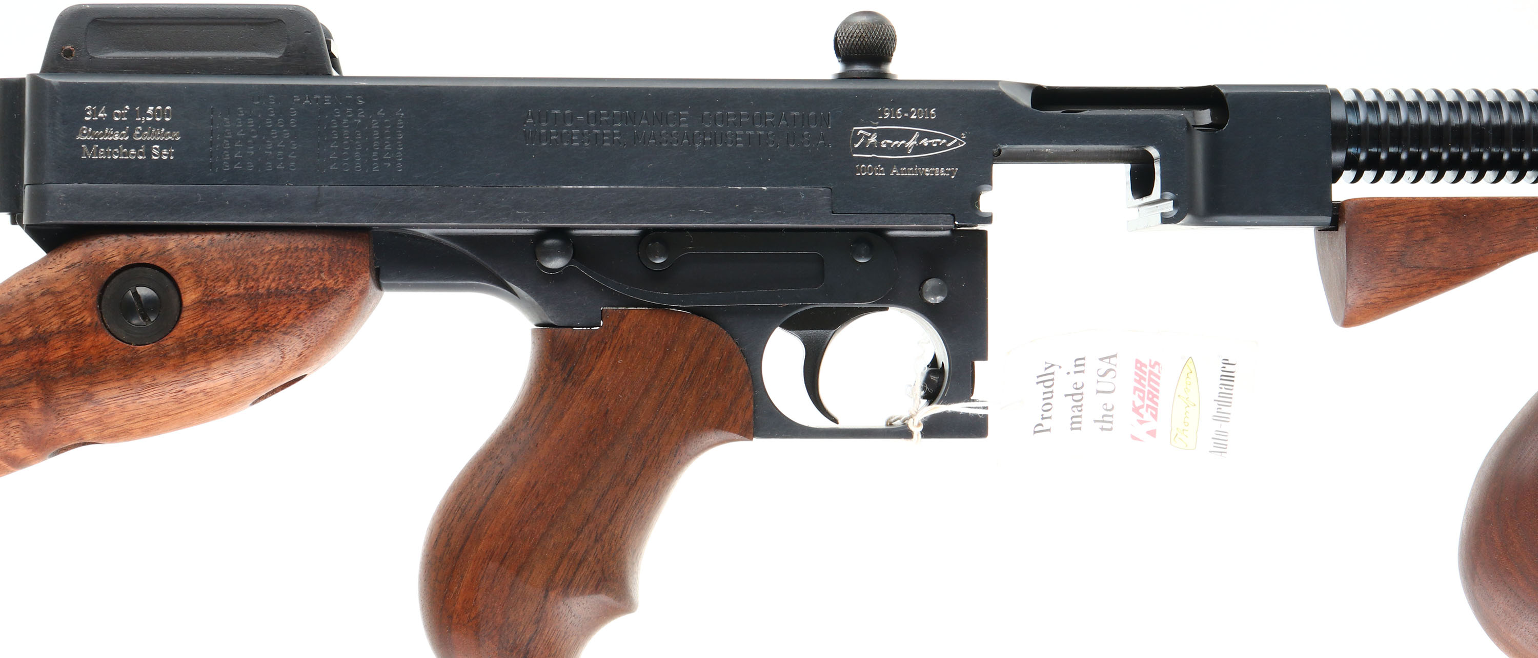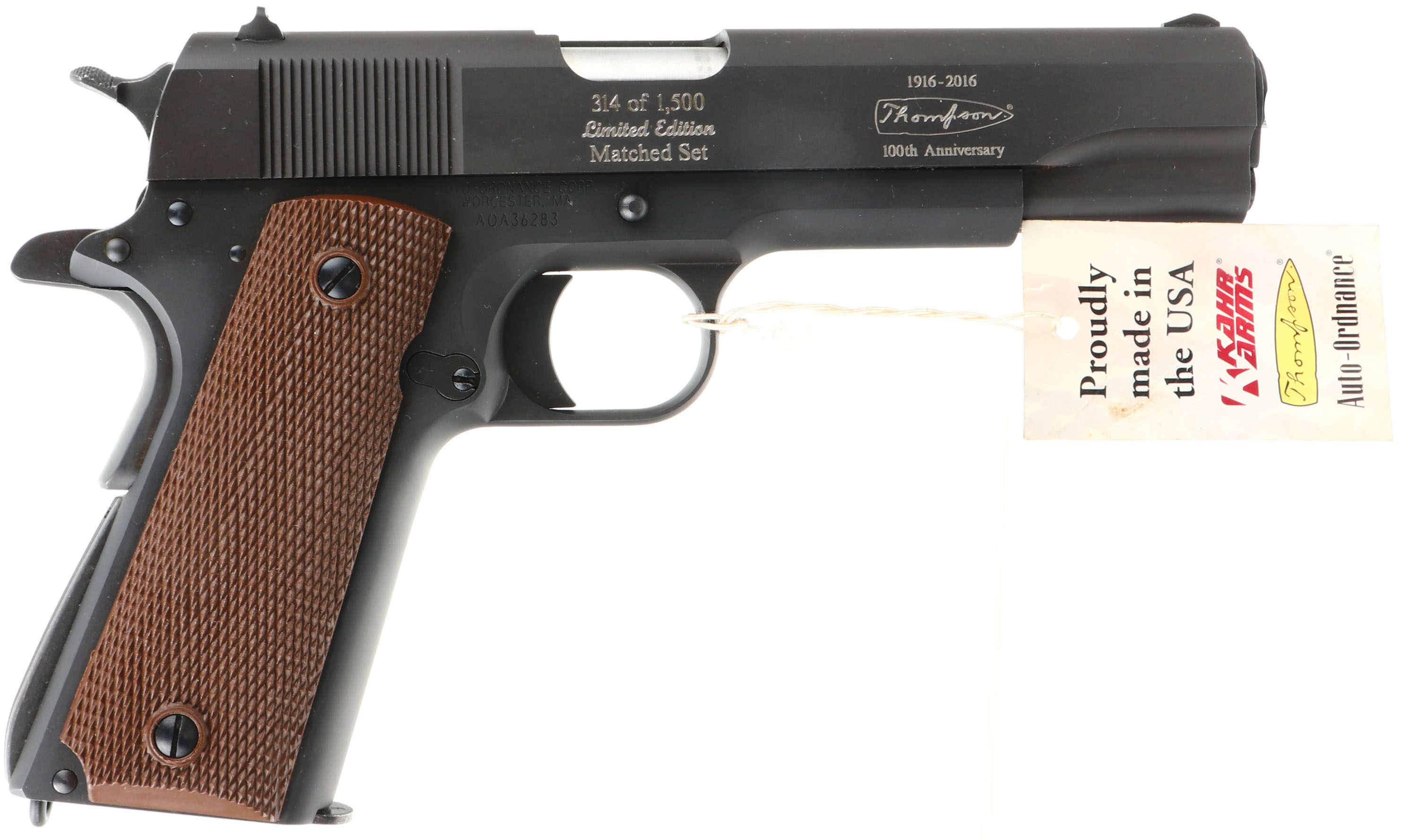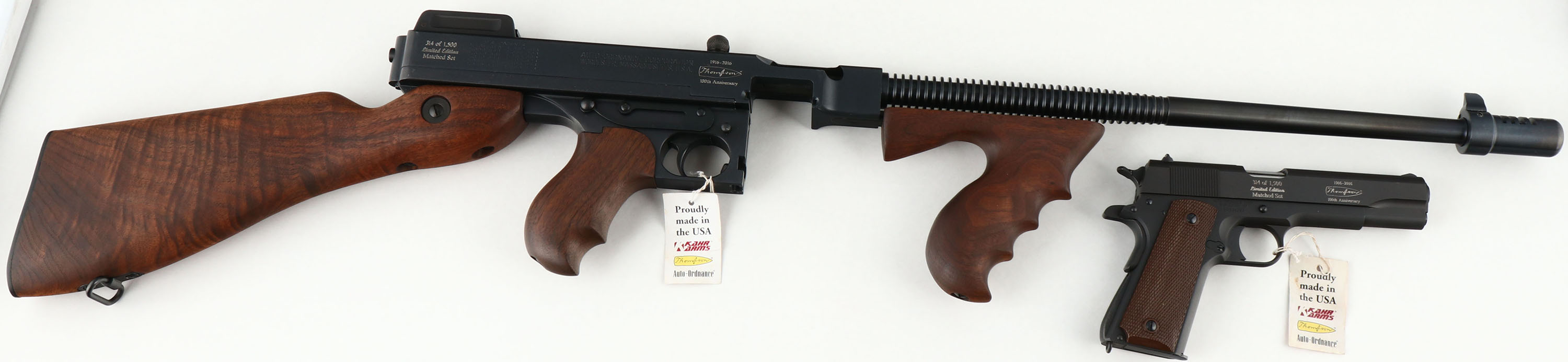 CASED & NEW Thompson Auto Ordnance Corporation, (Kahr Arms), 100 Year Anniversary Two Gun Set, Models Thompson 1927A-1 Rifle & Thompson 1911A1 GI Specs pistol., CAL: 45 ACP, MFG: 2016, SN's: A0A36283, KP2243, Semi Auto Rifle & Pistol, 16.5'' (18'' with compensator) & 5'' barrels. This is number 314 of 1500 sets produced to celebrate the 100 Year Anniversary 1916-2016 of the Thompson Auto Ordnance Corporation. Auto-Ordnance was a U.S. arms development firm founded by retired Colonel John T. Thompson of the United States Army Ordnance Department in 1916. Auto-Ordnance is best known for the Thompson submachine gun, used as a military weapon by the Allied forces in World War II, & also notorious as a gangster weapon used during the Roaring Twenties. Featured in the set is a deluxe replica of a Thompson 1927A-1 Carbine (Tommy Gun) & a Thompson 1911A1 GI Specs pistol. The deluxe American walnut vertical foregrip, pistol grip & fixed stock on the Tommy gun are mint, displaying beautiful wood grain & factory finish. The factory metal blue finishes are 99%+. The receiver is prominently engraved with the classic Thompson logo, limited edition numbers, & displays the words ''100th Anniversary'' on the matte black steel frame. The gun weighs 13 lbs. & has an overall length of 41''. Features include a pinned in front blade & an open rear adjustable sight. Bore is mint. Has the stick mag.
