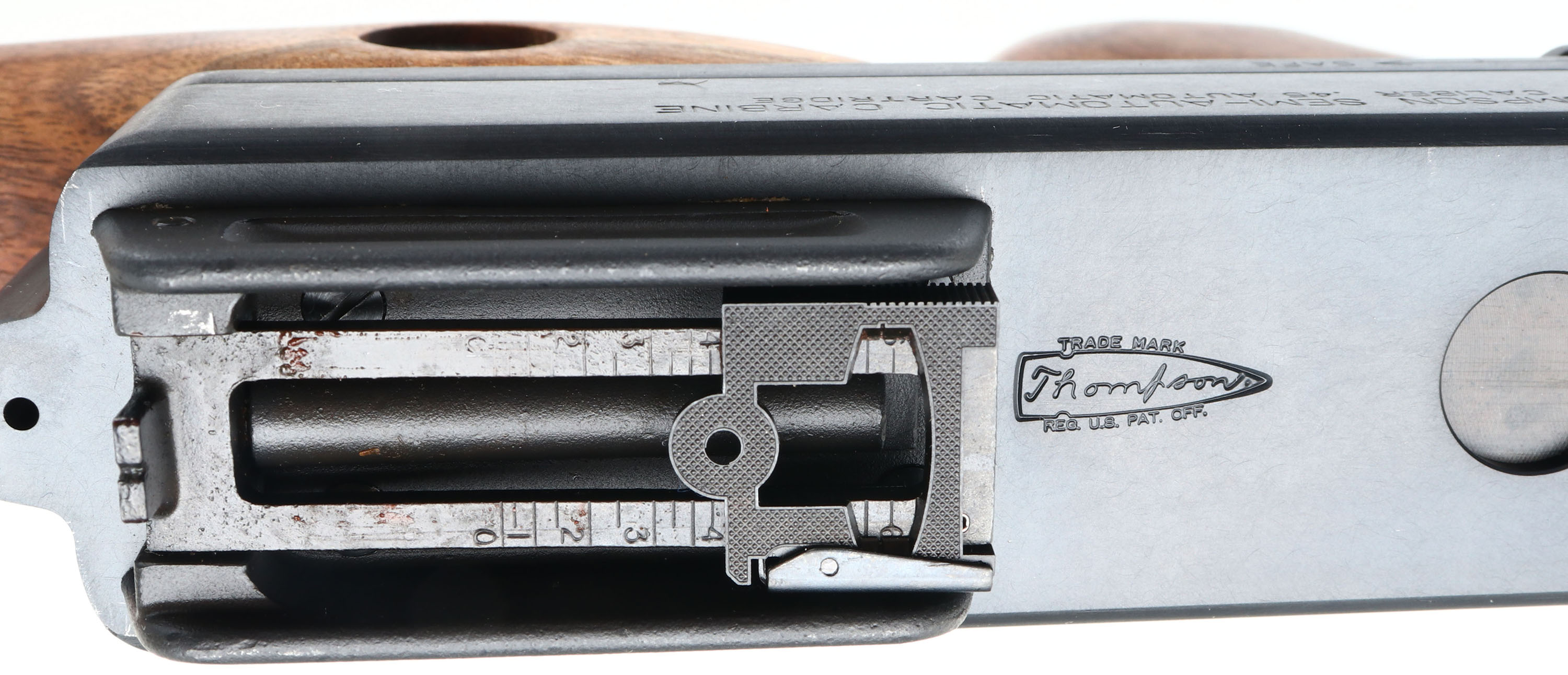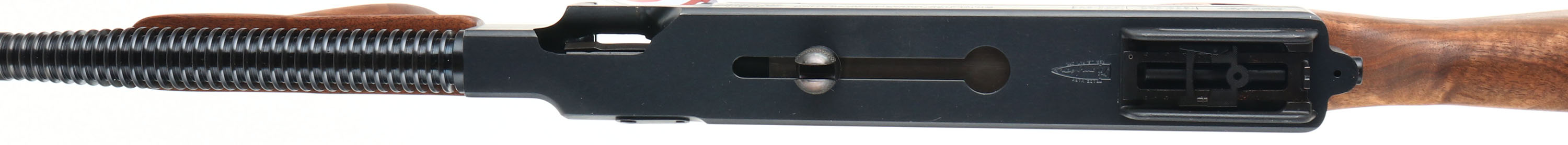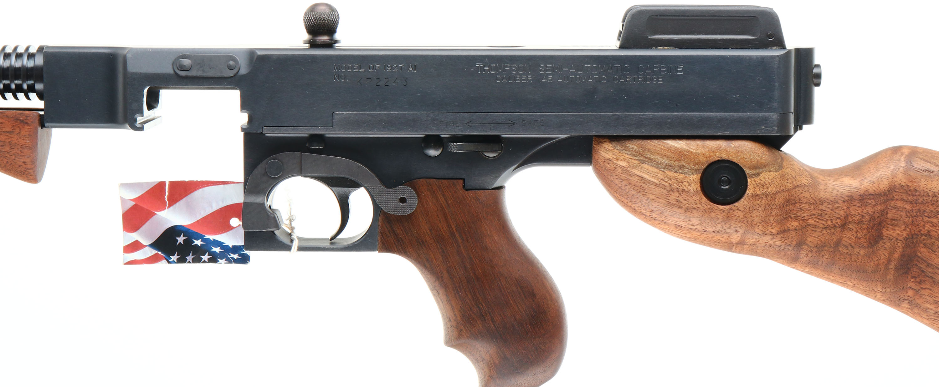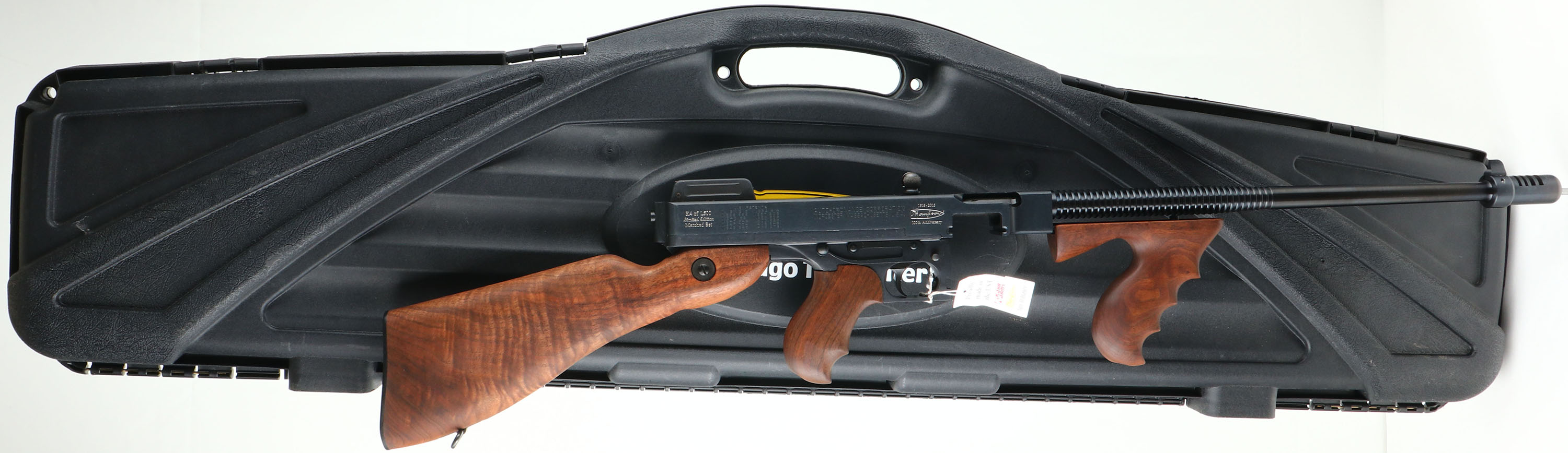CASED & NEW Thompson Auto Ordnance Corporation, (Kahr Arms), 100 Year Anniversary Two Gun Set, Models Thompson 1927A-1 Rifle & Thompson 1911A1 GI Specs pistol., CAL: 45 ACP, MFG: 2016, SN's: A0A36283, KP2243, Semi Auto Rifle & Pistol, 16.5'' (18'' with compensator) & 5'' barrels. This is number 314 of 1500 sets produced to celebrate the 100 Year Anniversary 1916-2016 of the Thompson Auto Ordnance Corporation. Auto-Ordnance was a U.S. arms development firm founded by retired Colonel John T. Thompson of the United States Army Ordnance Department in 1916. Auto-Ordnance is best known for the Thompson submachine gun, used as a military weapon by the Allied forces in World War II, & also notorious as a gangster weapon used during the Roaring Twenties. Featured in the set is a deluxe replica of a Thompson 1927A-1 Carbine (Tommy Gun) & a Thompson 1911A1 GI Specs pistol. The deluxe American walnut vertical foregrip, pistol grip & fixed stock on the Tommy gun are mint, displaying beautiful wood grain & factory finish. The factory metal blue finishes are 99%+. The receiver is prominently engraved with the classic Thompson logo, limited edition numbers, & displays the words ''100th Anniversary'' on the matte black steel frame. The gun weighs 13 lbs. & has an overall length of 41''. Features include a pinned in front blade & an open rear adjustable sight. Bore is mint. Has the stick mag.
