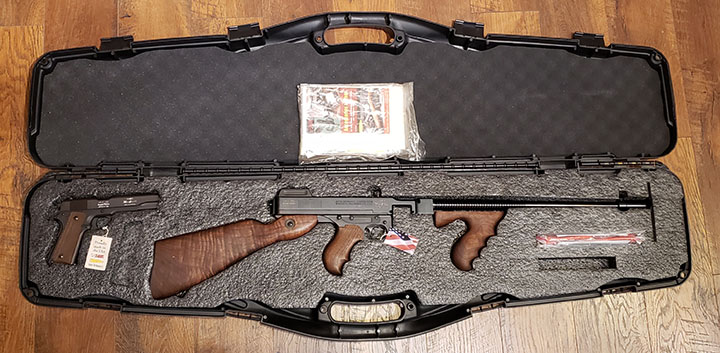 The 1911A1 carries original checkered, brown plastic grips which are mint. The original matte black metal finish is 100%. Bore is Mint. Overall length is 8.5'' & it weighs just 39 oz. The iron sights are front & rear dovetail cut low profile. Engraved with the iconic Thompson logo, the words 100th Anniversary, & lists the limited edition numbers on the frame. Hanging tags on both guns. The guns come stored together in a polymer hard case with the yellow Thompson Bullet logo & the words ''Chicago Typewriter'' in white stamped on the black case cover. Factory owner's manuals, booklets & locks are included in case. Frank Harris, VP of Sales & Marketing, Kahr Firearms Group wrote, ''We are proud to honor the name & the legacy of General John T. Thompson with this special 100th Anniversary matched set. There is a rich historical past attached to the Tommy Gun, & we feel General Thompson would be proud to see that what started as a research project in 1915 has served the military, law enforcement & shooting enthusiasts around the world so prominently for over 100 years.'' This set is NOS from a gun shop & not previously sold to the public. It is a fantastic & high quality set, which have risen in value & has become very collectible. MSRP in 2016 was $1,971. FFL Req. - Value: 2000 to 3000