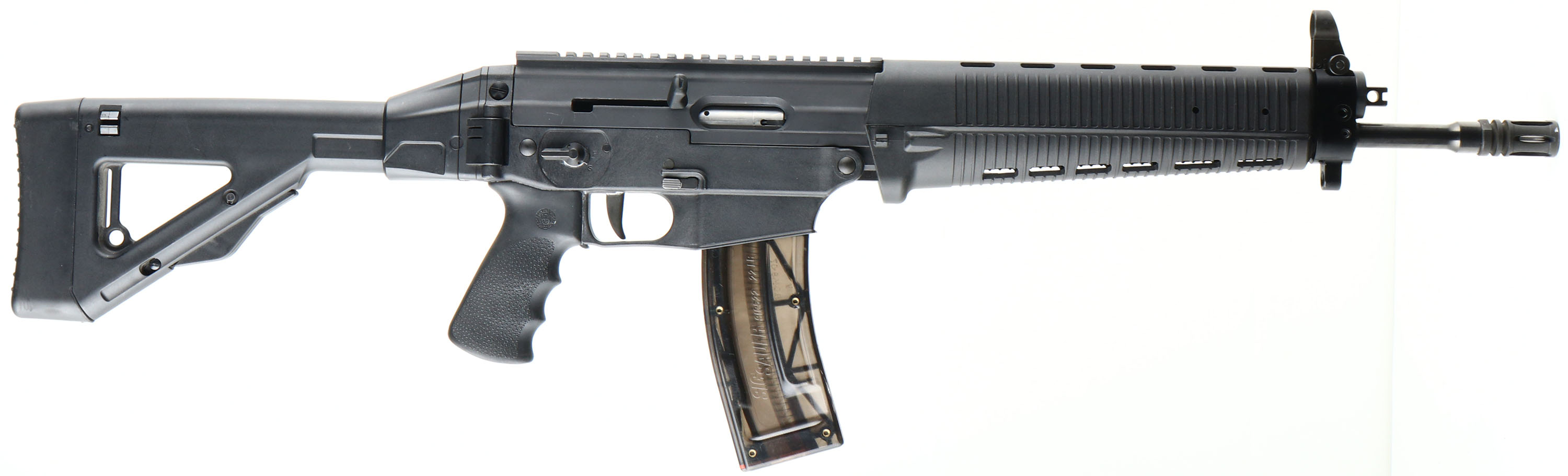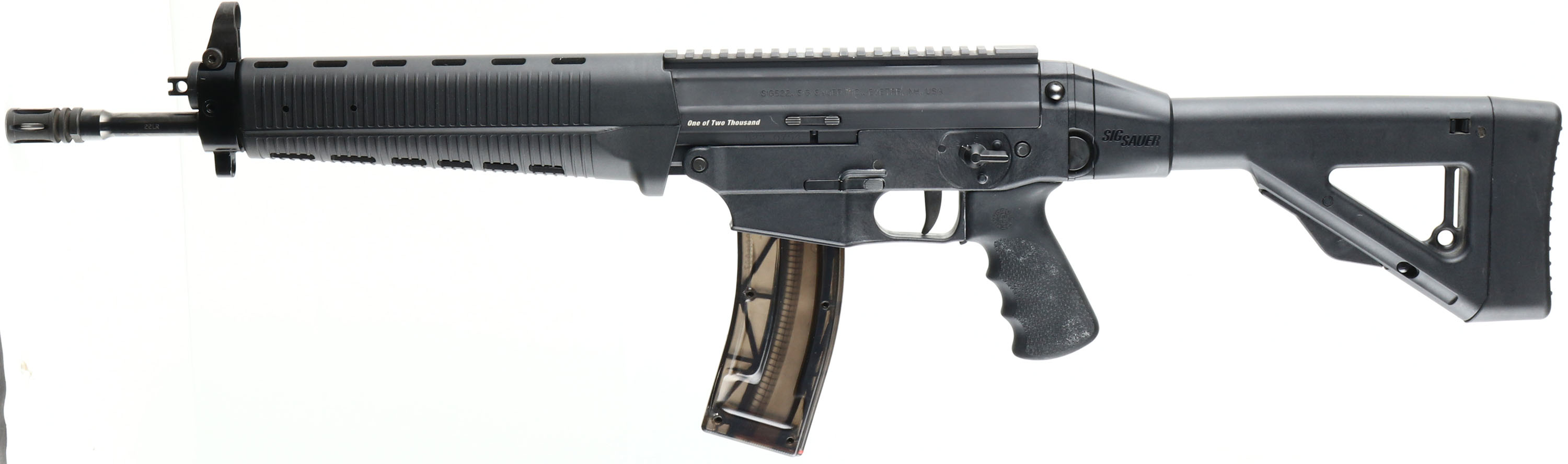 Sig Sauer, SIG522, CAL: 22 LR, MFG: Modern, SN: 522-0754, Semi Auto Rifle, 16'' barrel. The synthetic 3-pt adjustable stock, Hogue rubber grip & grooved forend are excellent. The matte black finish on the receiver rates 99%. The metal blue finish on the barrel rates 99%. Bore is excellent & minty. The rifle has the factory front sight. Bird cage flash suppressor. This rifle features SIG556 parts including a collapsible folding/locking stock, polymer forend & durable metal receiver with an integral picatinny rail. This rifle has the look & feel of the SIG556, in a more affordable .22 caliber option. FFL Req. - Value: 400 to 600