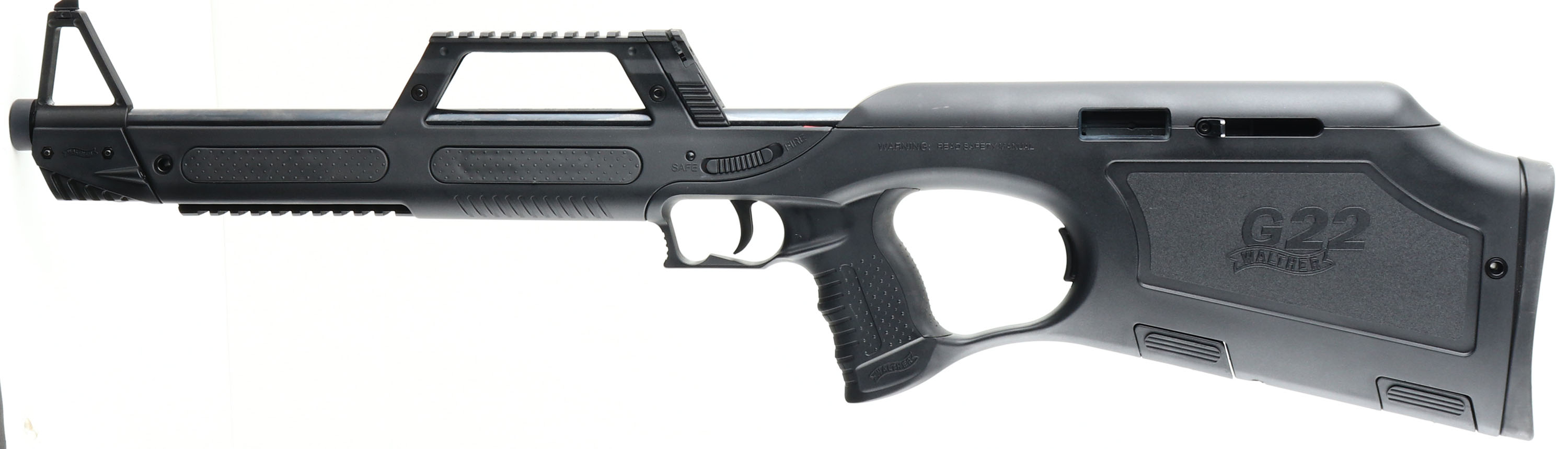 Walther, G22, CAL: 22 LR, MFG: Modern, SN: PW013419, Semi Auto Rifle, 20'' barrel. The one-piece synthetic stock, with textured rubber grip & forend panels are excellent. The metal blue finish on the barrel rates 97%. Bore is excellent & minty. Factory sights. The front of the stock has a factory laser. Upper & lower picatinny rails for accessories & optics. A spare magazine is stored inside the polymer stock behind the magazine well. This rifle can be configured for both left & right hand shooters. The stock is designed so that the ejection port & cocking handle can be relocated to either side. An interesting design for a bullpup .22 rifle. FFL Req. - Value: 300 to 600