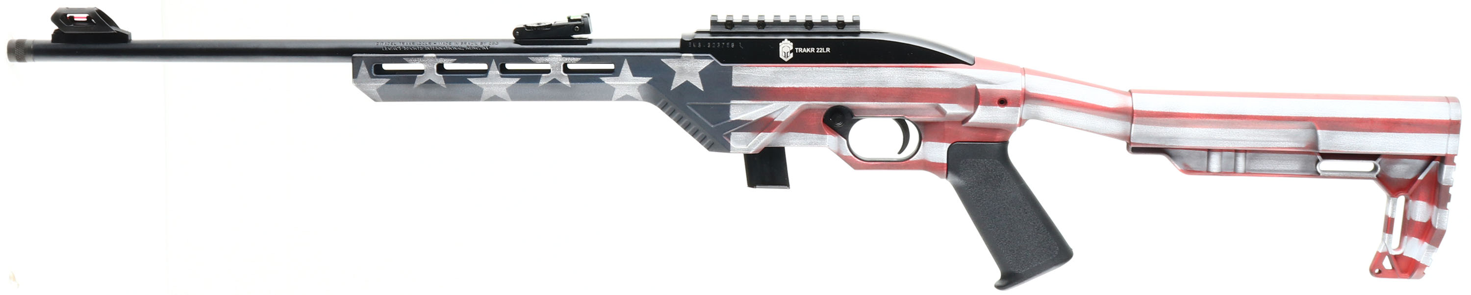 BOXED & NEW Citadel, Trakr, CAL: 22 LR, MFG: Modern, SN: EWB4823758, Semi Action Rifle, 18'' Threaded barrel. The molded, one-piece non-adjusting American Flag motif synthetic stock is mint. The factory black finish on the barrel & receiver rates 99%+. Bore is minty. The top of the receiver features a Picatinny rail making it easy to mount a scope or optics. The rifle also carries an adjustable green fiber optic rear, & red fiber optic hooded front sights. Detachable 10 round mag. A great little inexpensive shooter, with a cool American look. FFL Req. - Value: 200 to 300