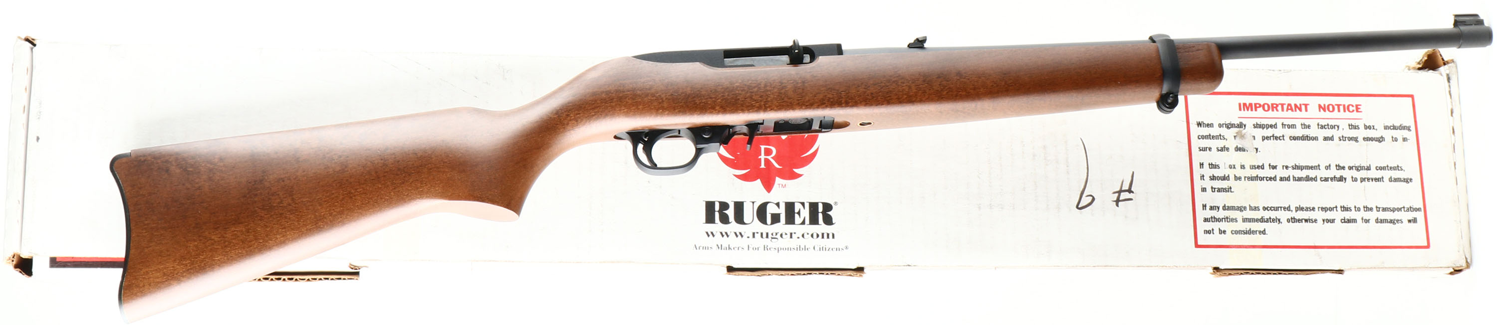 BOXED, Ruger, Model 10/22 Carbine, CAL: 22 LR, MFG: 2009, SN: 353-82708, Semi Auto Rifle, 18 1/2'' barrel. The factory flat pistol grip stock is excellent. The factory metal finish on the barrel & receiver rates 99%+ overall. Bore is excellent & minty. Factory sights. Stock has a smooth metal buttplate. Comes in factory box. A NIB Ruger 10/22. FFL Req. - Value: 350 to 450