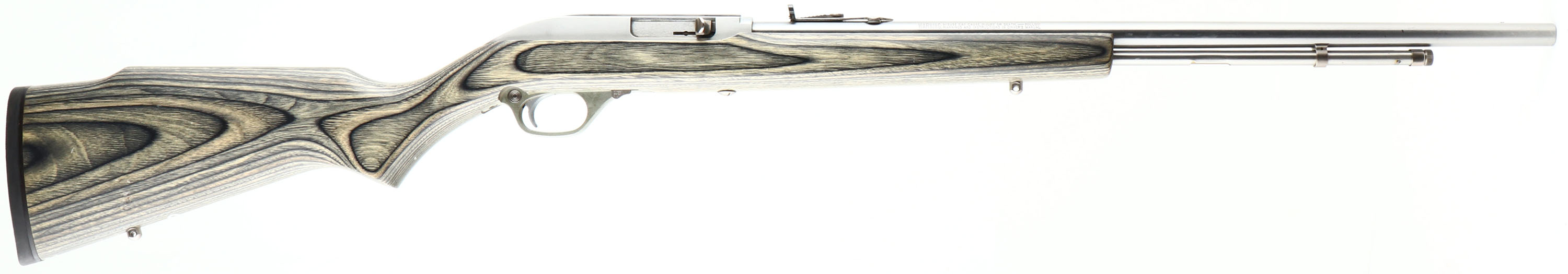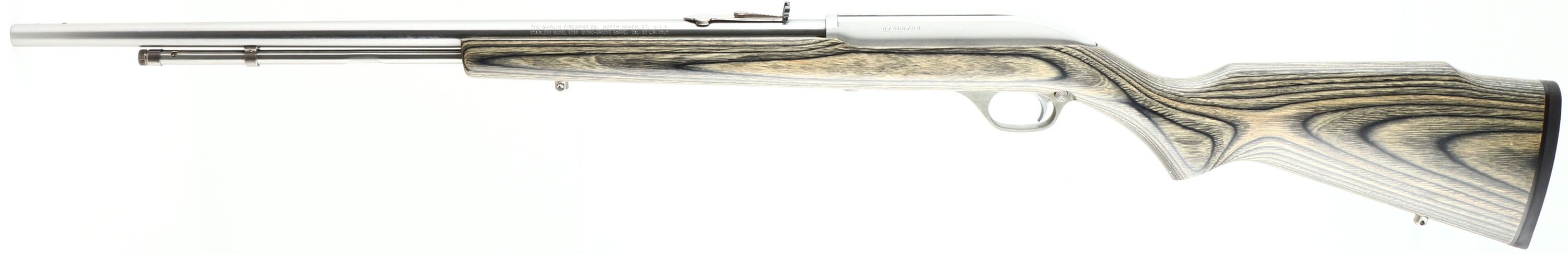 Marlin Firearms Co., Stainless Model 60SS, CAL: 22LR, MFG: 1993, SN: 07460789, Semi Auto Rifle, 22'' barrel. The gray Monte Carlo laminated flat pistol grip stock is excellent. There are light scrapes, nicks & dings to the clear coat finish. The stainless steel finish on the barrel & tube is excellent, with minor scuffs. The factory gray finish on the receiver rates 99%. Bore is excellent & minty. The barrel holds an adjustable rear sight & there are (2) filled screw holes ready for a front sight. Stock carries the factory Marlin recoil pad. FFL Req. - Value: 300 to 500