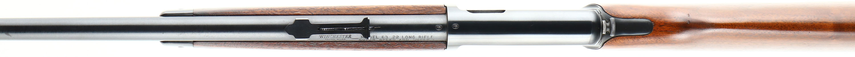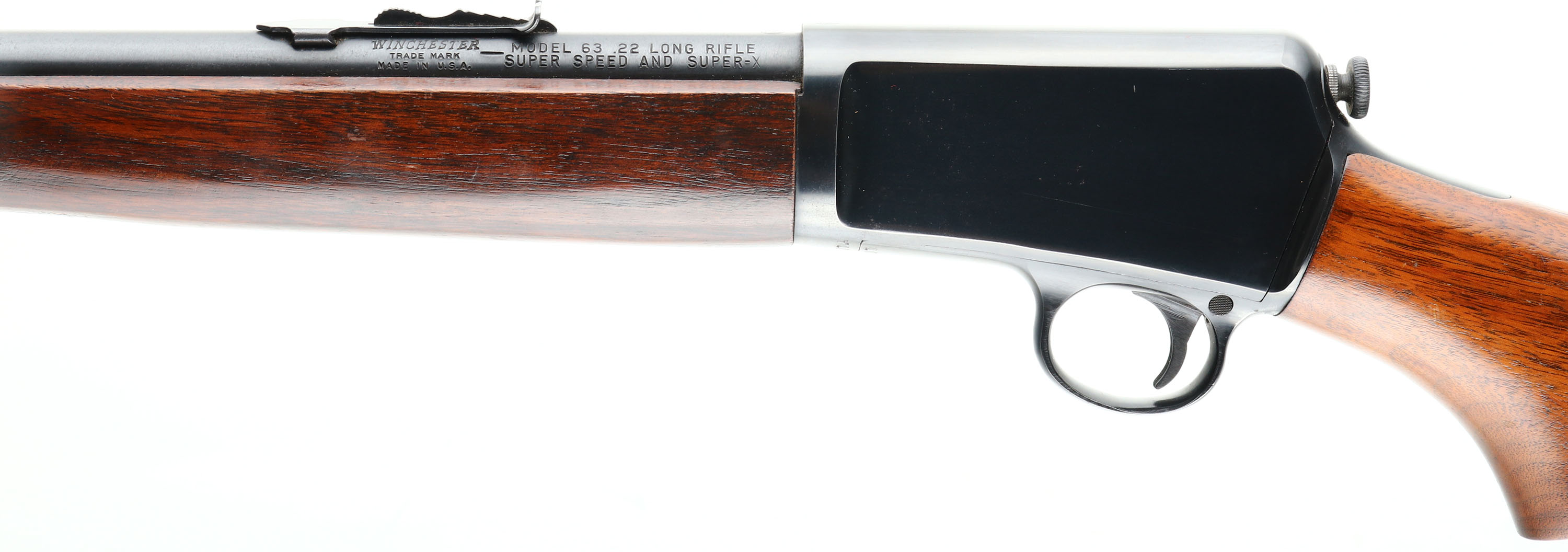 Winchester, Model 63, Marked .22 LONG RIFLE SUPER SPEED & SUPER-X Cal., MFG: 1953, SN: 119217A, Semi-Auto Action Rifle, 23'' Tapered round barrel. The original flat pistol grip wood stocks & finish are excellent, with a few minor handling marks, rubs or tiny contusions. The original metal blue finish is 99% overall. Bore is excellent. Factory sights. Checkered metal buttplate. An overall excellent, original & collectible semi-auto .22. FFL or C&R Req. - Value: 1200 to 2000