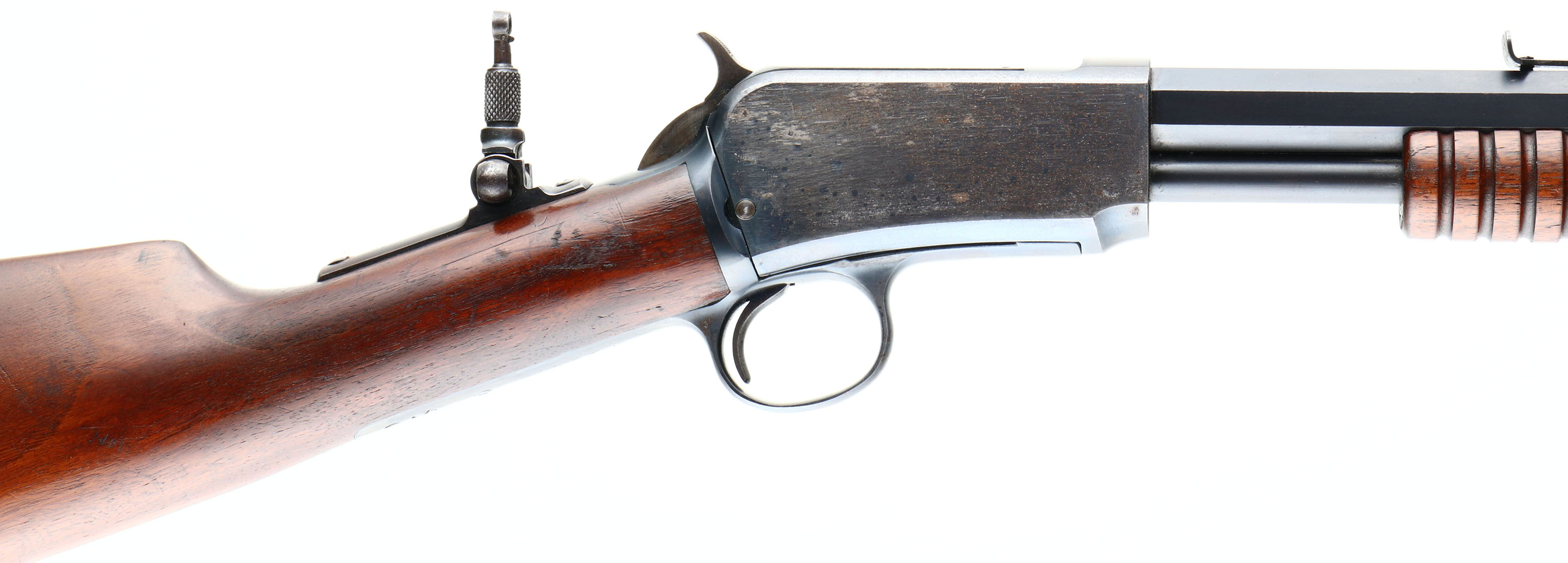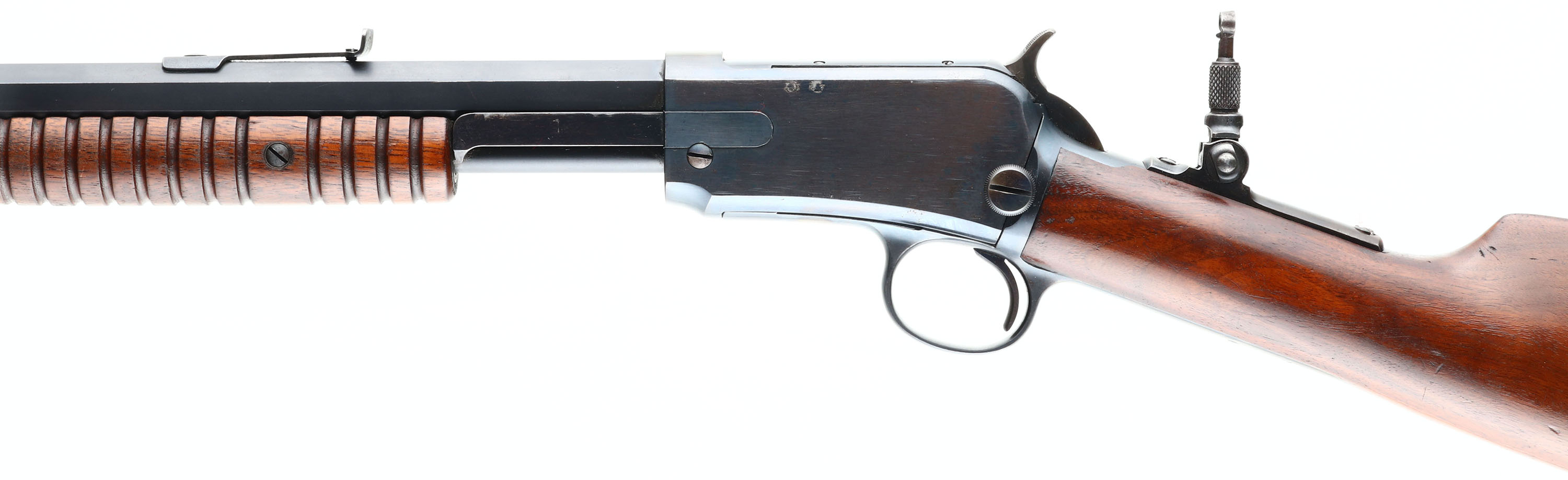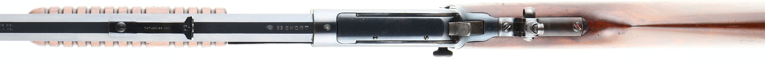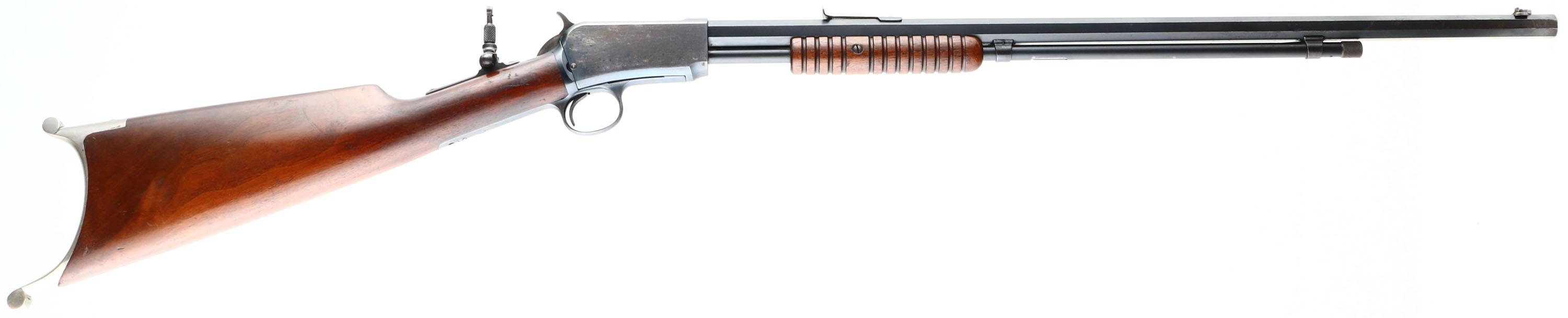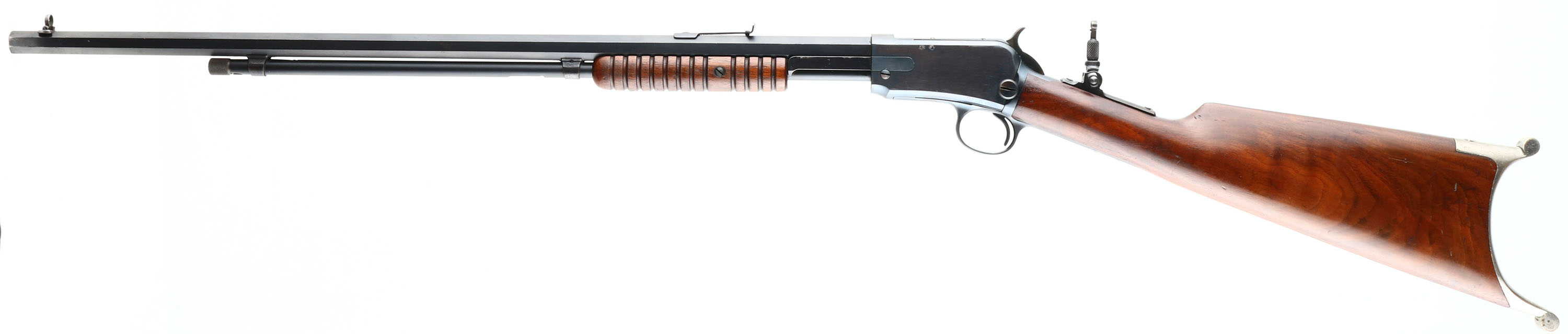 RARE Winchester, Model 90, NICKELED SWISS BUTTPLATE, 2nd variation, .22 SHORT, Cal., MFG. 1902, SN: 145092, Pump Action Rifle, 24'' Octagon barrel. This is a special order 1890 as they are rarely found with NICKELED SWISS BUTTPLATES. According to the consignor, only 22 1890 rifles were produced with the rare Swiss buttplate & most of those are deluxe models. The original straight grip wood stocks are excellent. The stocks carry the original finish, with minor handling marks & light contusions. The factory metal blue finish 95% on barrel & mag, with some light pitting on a single barrel flat on the right side near the muzzle end. The receiver blue rates 85%, with some speckled loss on the right side toning some as it thins. The rifle is fitted with an upgraded sight package, with a Lyman tang sight, adjustable rear & flip up globe sight, with ivory bead. Bore is very good, with some light wear or abrasions. This is a rare configuration & a highly desirable special order rifle.* FFL or C&R Req. - Value: 3500 to 5500