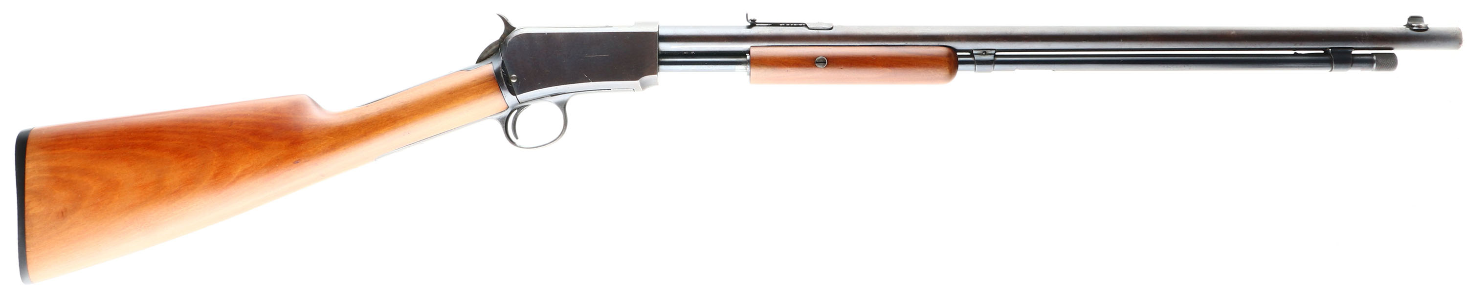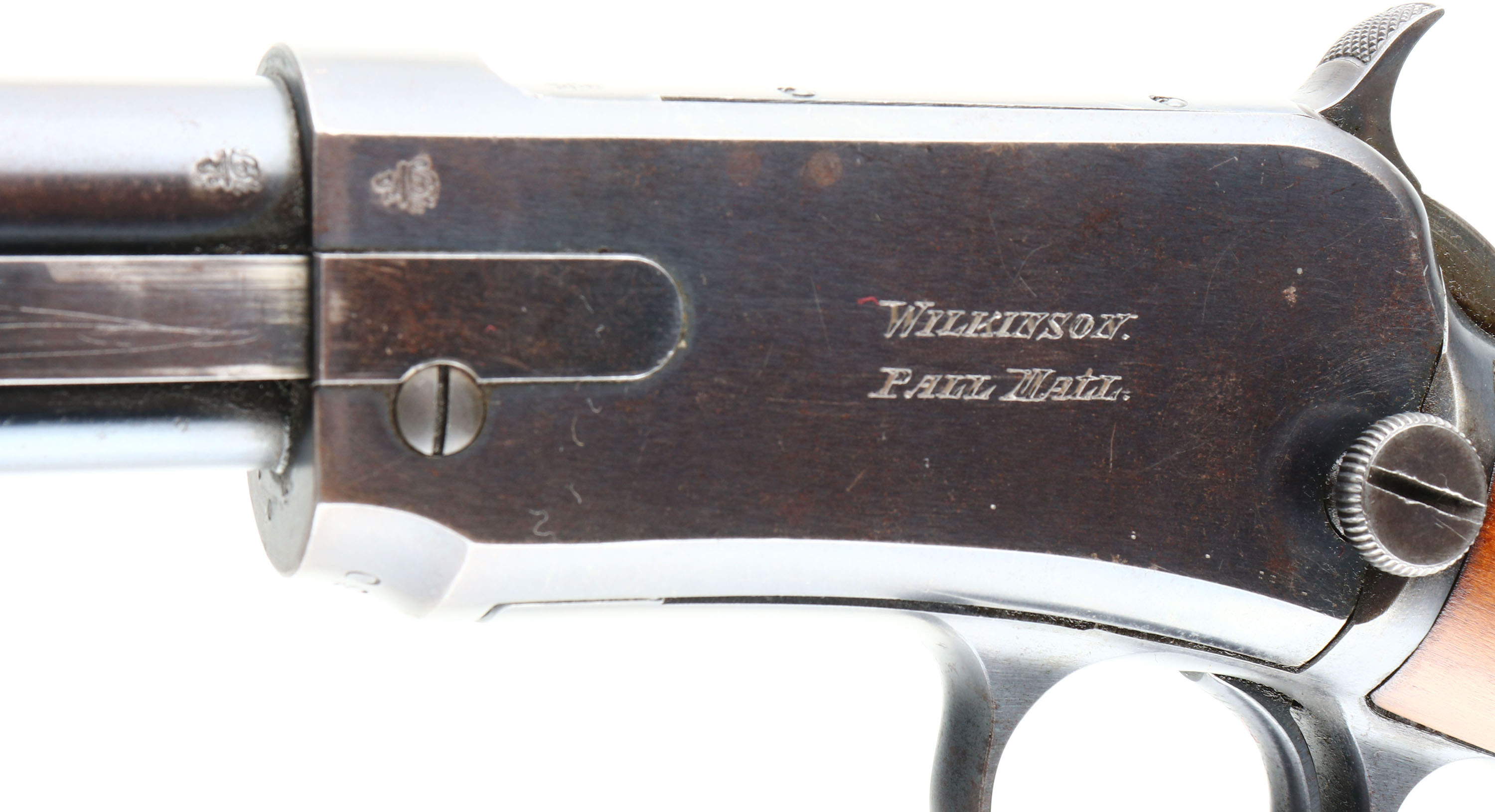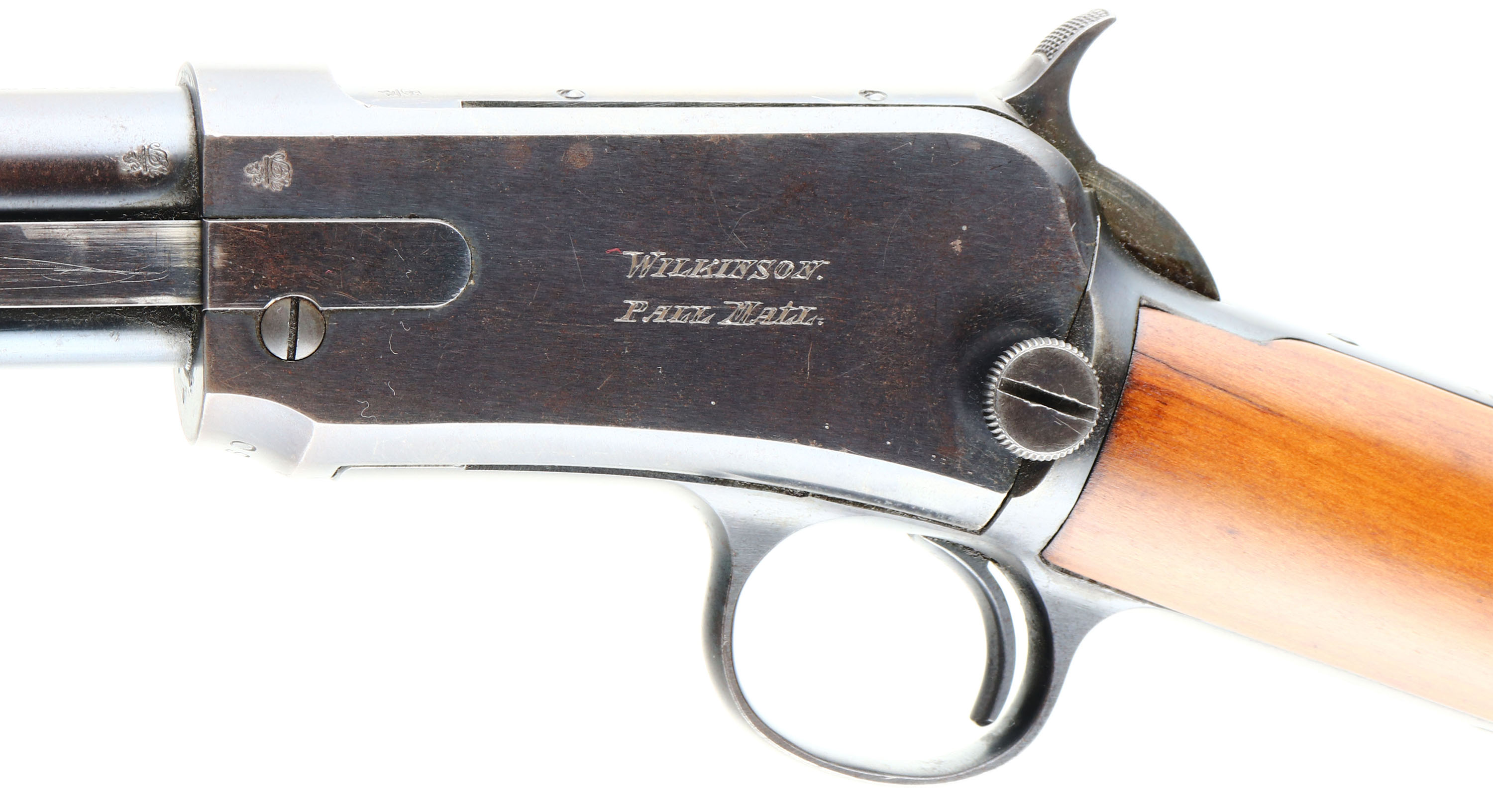 UNIQUE Winchester, Model 1906 , .22 SHORT., MFG: 1906, SN: 13760, Pump Action Rifle, 20'' Round barrel, This is a first year rifle, with British proof stampings on the barrel, bolt & receiver. It also carries the professional engraving of ''WILKINSON PALL MALL'' on the left side of the receiver. The original straight grip wood stocks are excellent. The forearm is the smooth style. The original finish is excellent, with virtually no rubs or handling marks. The original metal blue finish rates 85% overall, despite full coverage simply due to some thinning loss & barrel starting to tone slightly brown. Bore is good, but with areas of worn roughness amongst good rifling. Fitted with standard barrel sights. Winchester plastic buttplate, with engraved screws. Another truly excellent, original & collectible condition example. FFL or C&R Req. - Value: 2000 to 3000