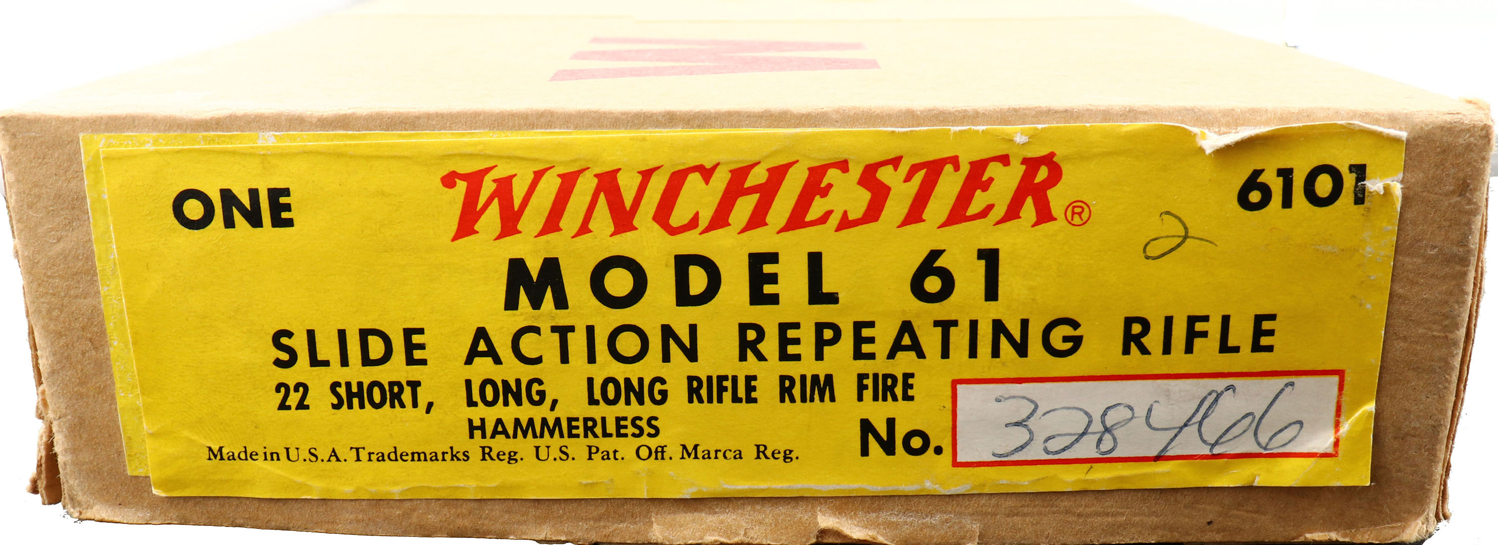 RARE SEALED BOXED Winchester, Model 61, CAL: .22 S, L or LR , MFG: 1962, SN: 328466, Pump Action Rifle, 24'' Tapered round barrel, Do the gun being SEALED IN THE ORIGINAL BOX, the gun should be NIB, with maybe light storage marks. Box is neat mint, with only one edge of sealed box tape broken & a great label, Wonderful Collector Grade.* FFL or C&R Req. - Value: 6500 to 10000