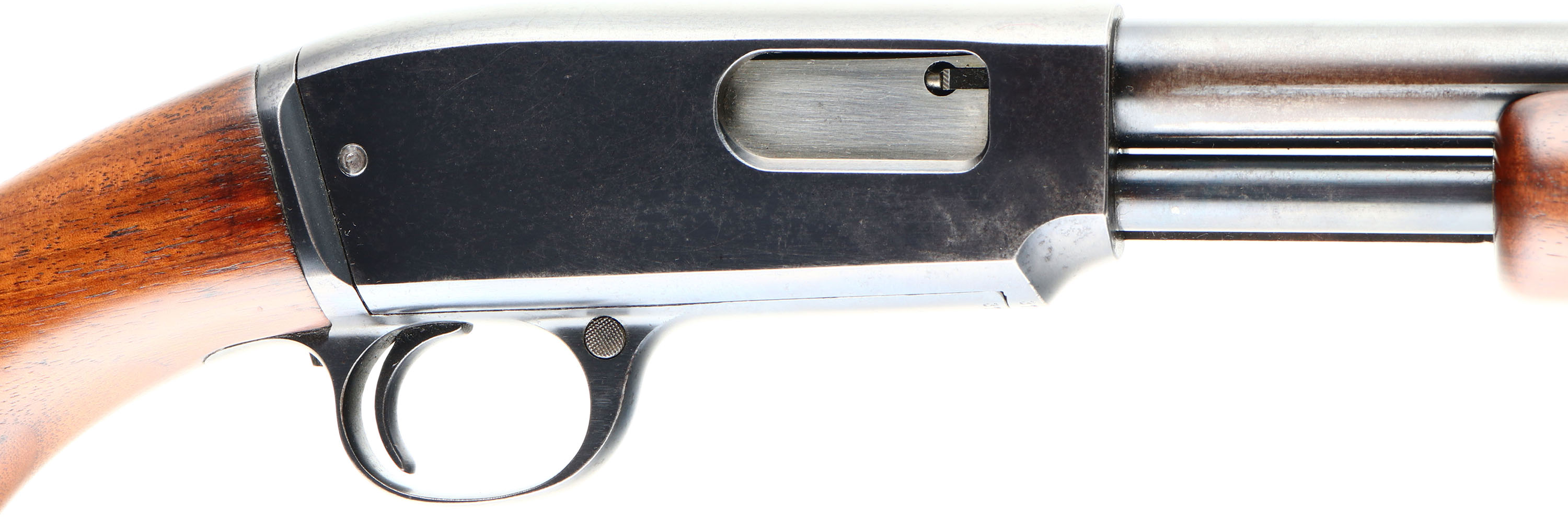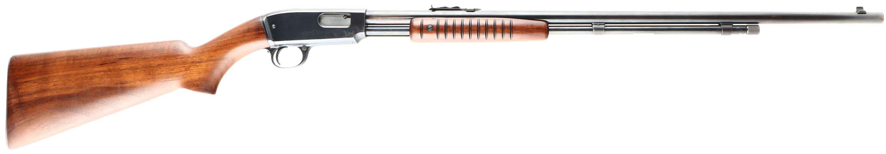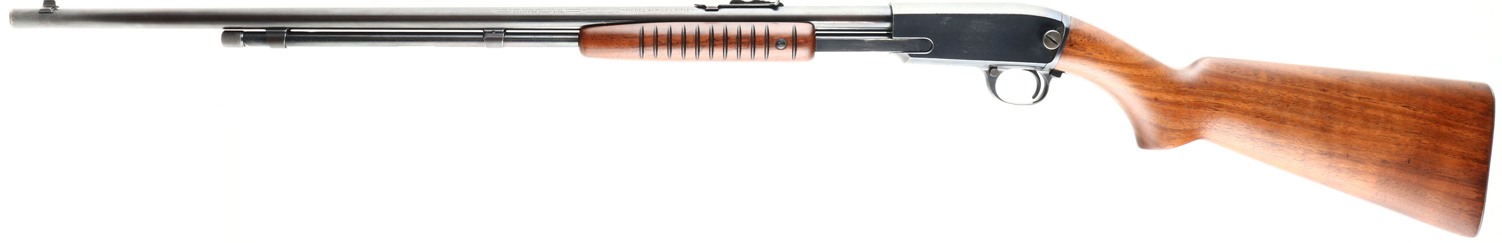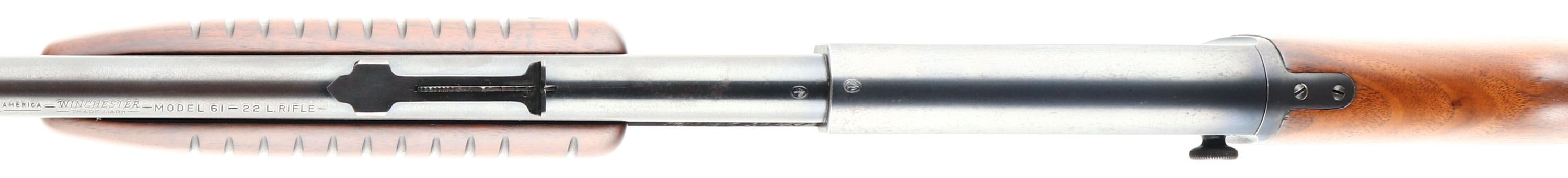 Winchester, Model 61, CAL: .22 L. RIFLE, MFG: 1938, SN: 37589, Pump Action Rifle, 24'' round barrel. Rare single caliber marked 61 with the early pre-war small forend & pre-war rust blue finish. The original flat pistol grip wood stock & grooved forend are excellent, having been cleaned, possibly lightly sanded & very nicely refinished. There are very few minor contusions, scrapes & scratches. The original metal finish rates 70% on barrel toning a bit gray & toned to a thin brown patina in areas of loss. The finish on receiver & mag rates 80%, with some speckled haze developing on the receiver. Bore is excellent. The barrel holds an adjustable rear sight & small blade front sight. Buttstock carries the earlier checkered metal buttplate. FFL or C&R Req. - Value: 1000 to 2000