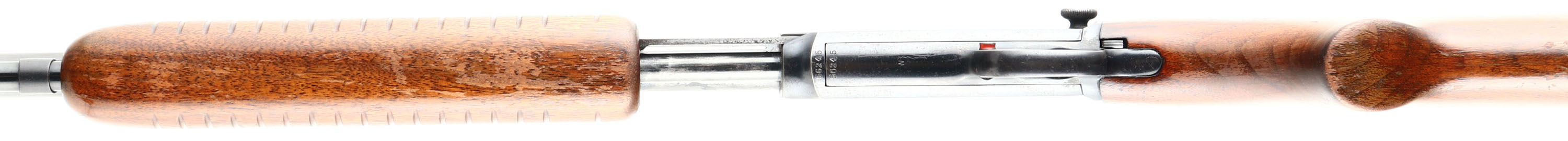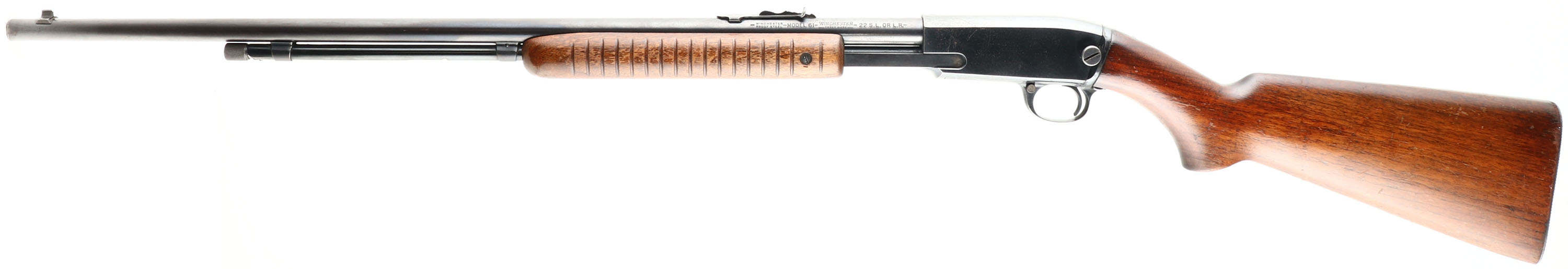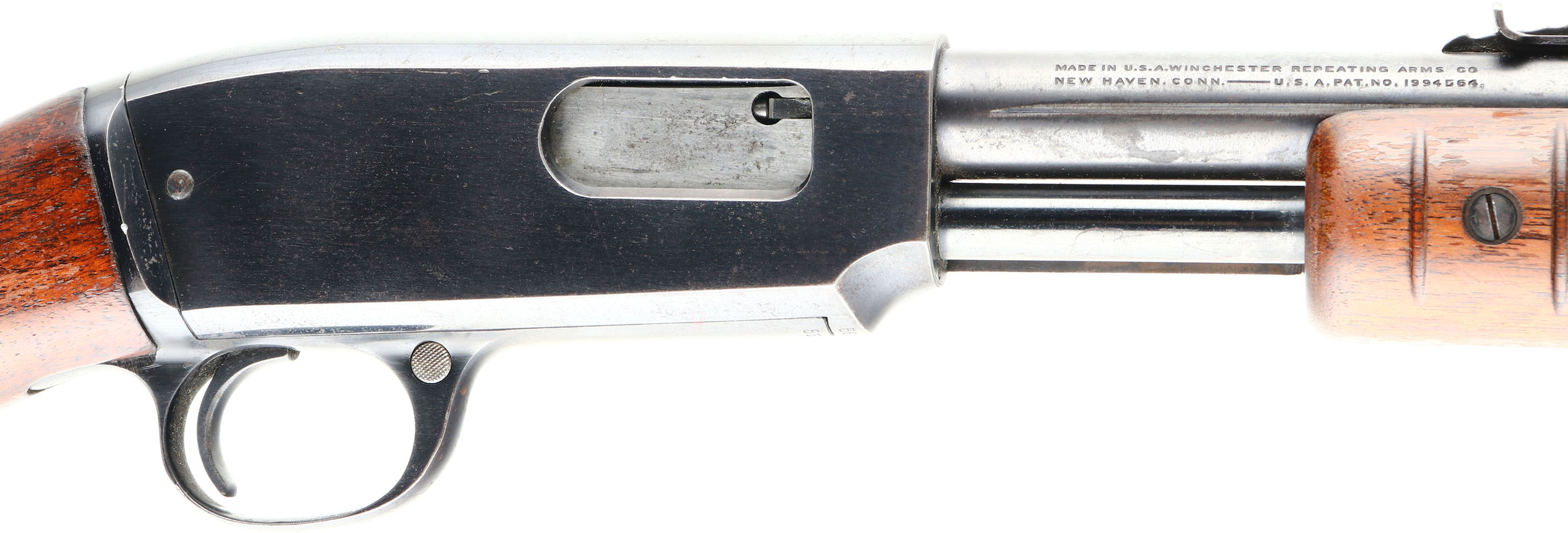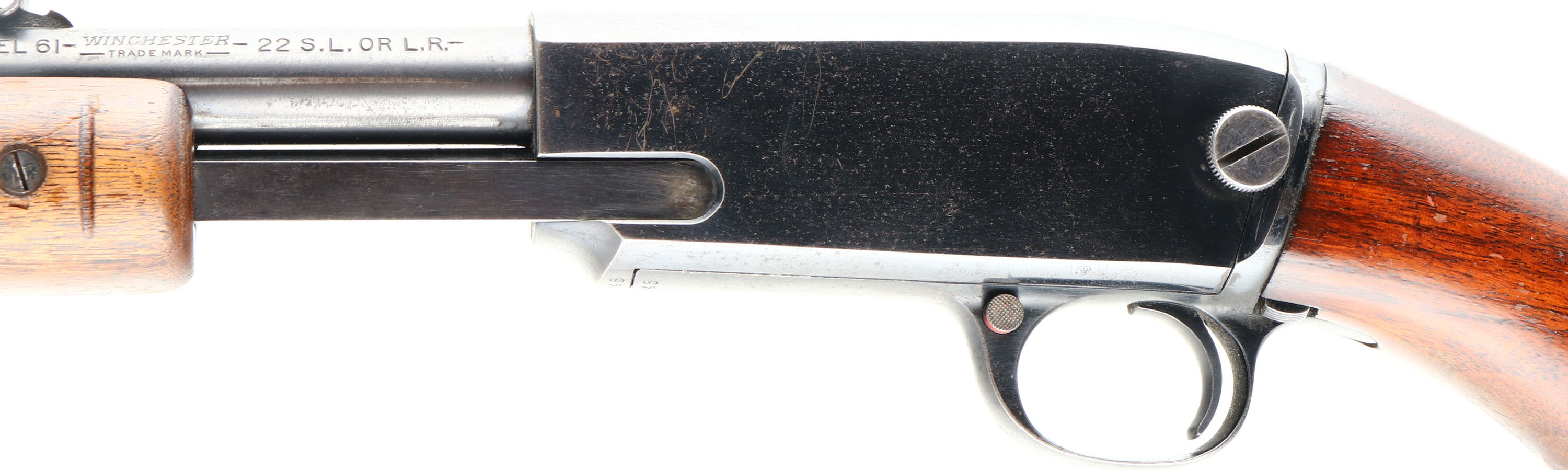 Winchester, Model 61, CAL: .22 S. L. or L.R., MFG: 1941, SN: 56245, Pump Action Rifle, 24'' Round barrel. The original flat pistol grip wood stock & grooved forend are Very good, with several minor scratches, a small gouge on the right side of the stock & thinning or flaking to the original finish. The original metal blue finish rates 85% overall. Bore is excellent. The barrel holds the original adjustable rear & small blade front sights. Buttstock carries the earlier checkered metal buttplate. Smooth action. A very nice & original example. FFL or C&R Req. - Value: 400 to 800