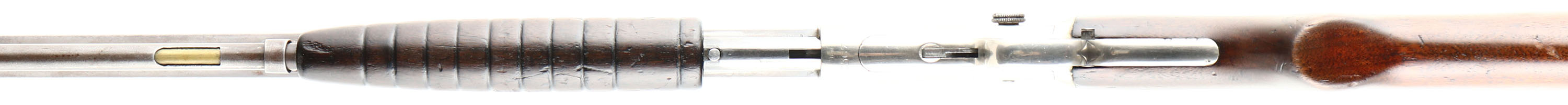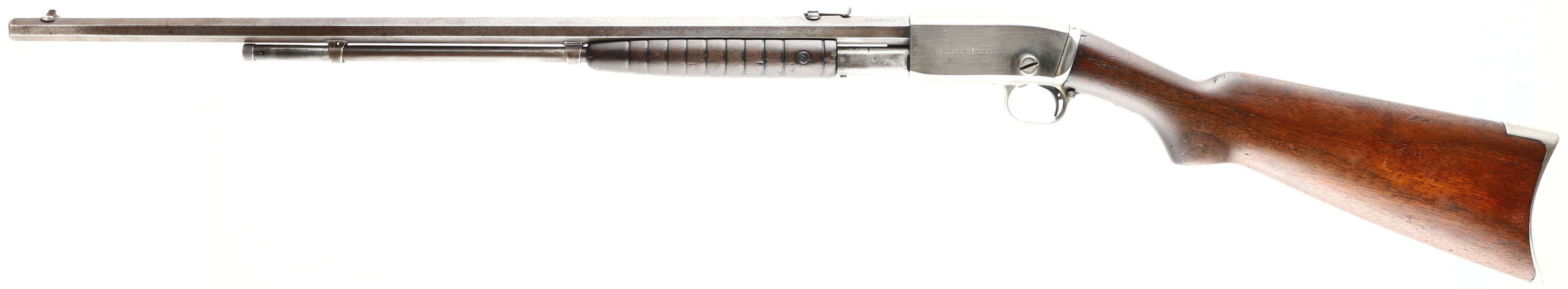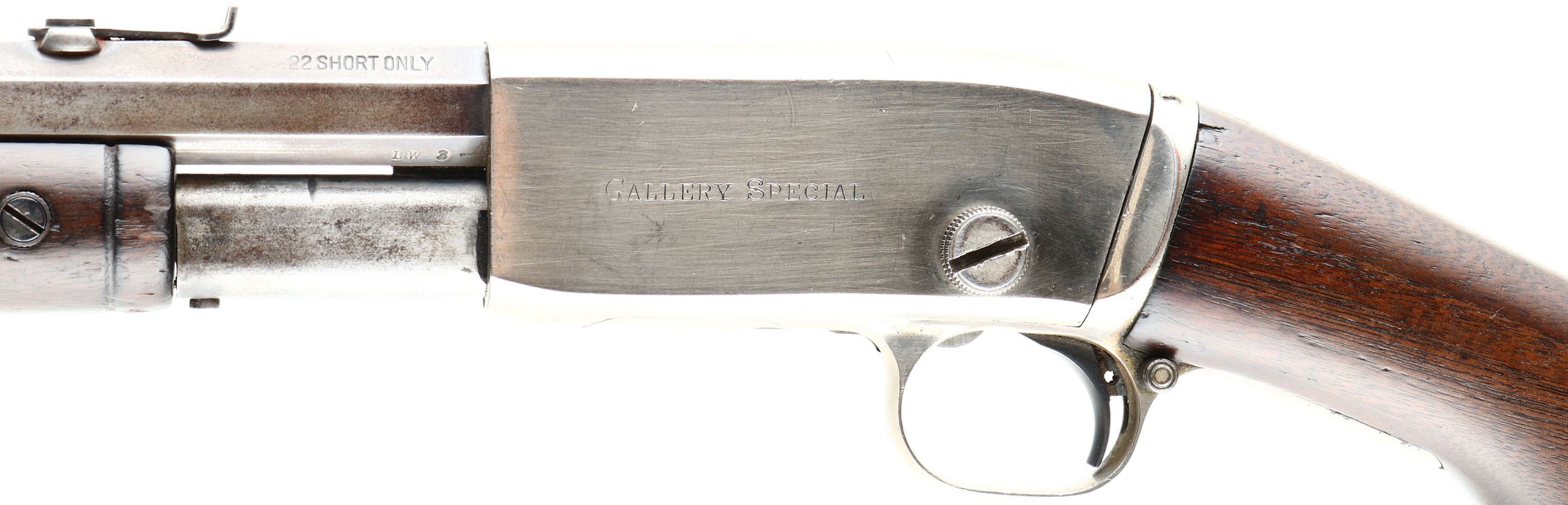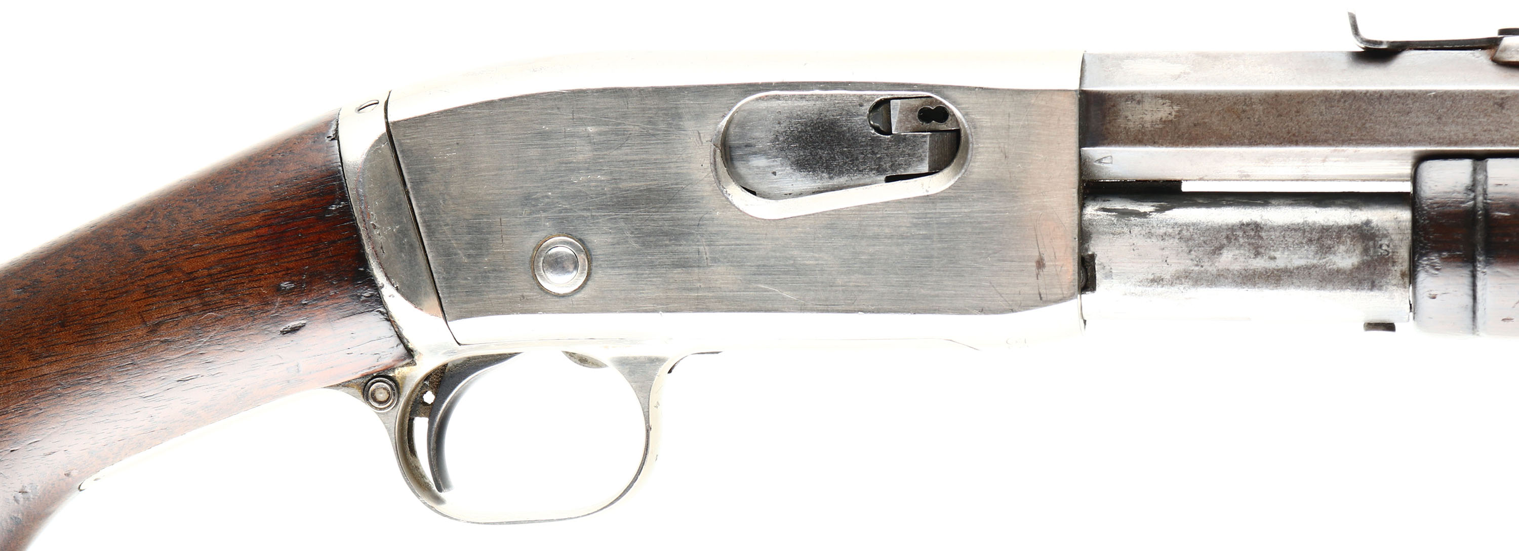 RARE NICKELED Remington, Model 12 B GALLERY SPECIAL, .22 SHORT ONLY Cal., MFG. 1910, SN: 33670, Pump Rifle, 24'' Tapered Octagon barrel, 2/3 rds mag. The Remington Model 12 is a slide-action rifle designed by John Pedersen & produced by the Remington Arms Company from 1909 to 36. The Model 12 is chambered in .22 Caliber Rimfire & accepts Short, Long, & Long Rifle cartridges, with a tubular magazine capacity of 14, 11, & 10 rounds respectively. The Model 12B ''Gallery Special'' was designed for use in shooting galleries, & can only fire .22 Short cartridges. These shooting galleries were extremely popular in the first half of the 20th century & Remington Model 12 rifles where amongst the favorites used due to their quality & reliability. This 2nd year of production ''GALLERY SPECIAL'' rifle is fairly rare. While over 800,000 Model 12 rifles were produced in it's four variations, A, B, C & CS, the model 12B saw the lowest production & is subsequently encountered far less often today. Even rarer are the half nickeled examples like this rifle. Due to their use in shooting galleries, most saw heavy use. The original factory, flat knob wood stock & honeycomb forend are very good & solid. Finish has darkened & thinned with age & use, with several minor contusions & light scratches. The original metal blue finish on the barrel & mag have worn to a thin brown patina. The NICKEL finish on receiver & crescent buttplate is excellent, retained at 98%, with a spot of thinning on the top of the receiver. All stampings & markings are crisp. Original front & rear sights. Bore is good & clean, with some cleaned roughness amongst solid rifling. A fairly rare & highly sought after popular amongst collectors grade, rare rifle. FFL or C&R Req. - Value: 1500 to 2500