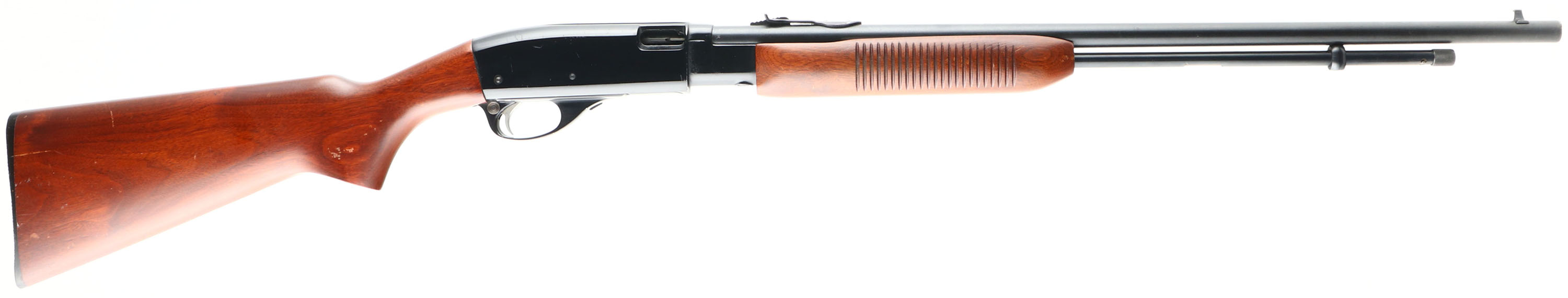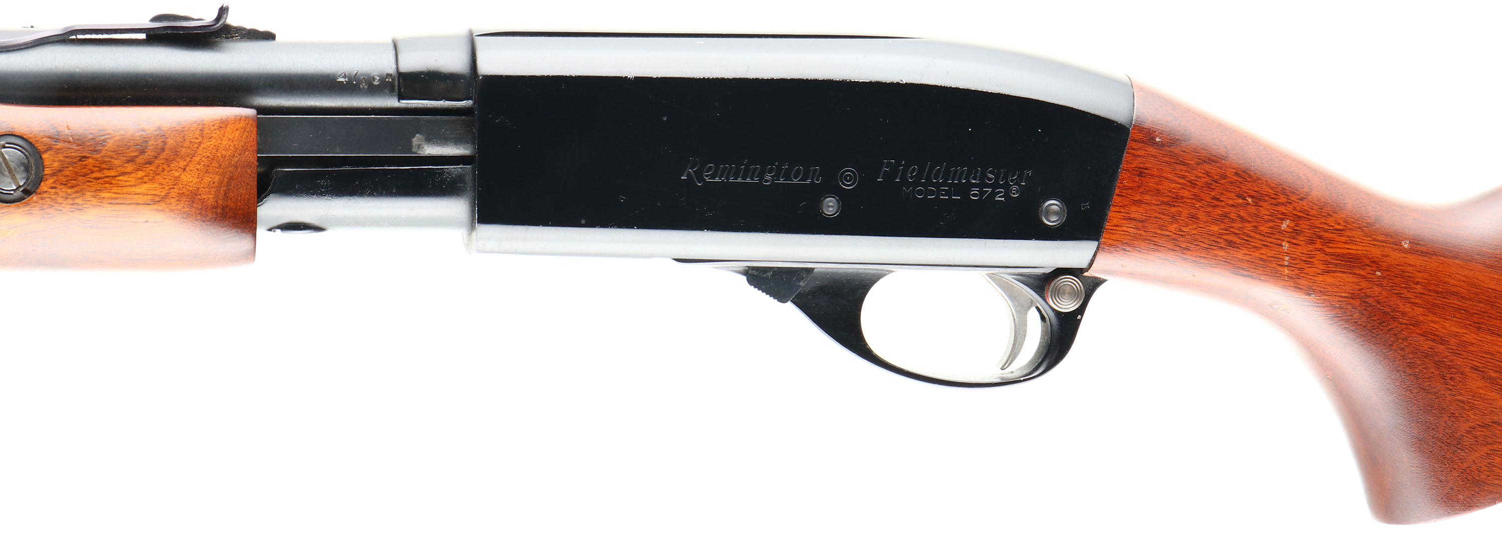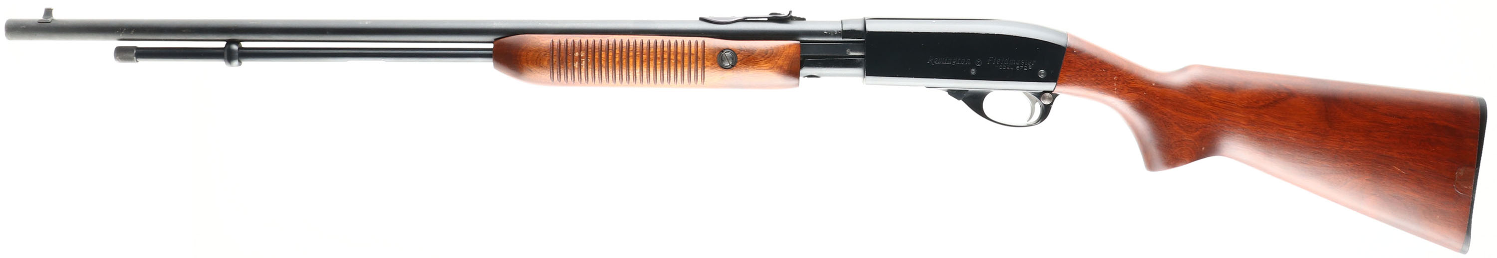 Remington, Model 572 Fieldmaster, .22 S. L. & LR. Cal., MFG. 1960, SN: None, Pump Rifle, 23 1/2'' Tapered round barrel, 3/4 mag. The original factory wood stocks are excellent, with some minor finish level handling marks or scuffs. The stock has a blemish repair on the left side of stock against the buttplate. The original metal blue finish on the barrel & mag rates 98%. The Japan black finish on the receiver is excellent, with a few minor scratches or handling mark. Bore is excellent. The barrel carries the original sights. Stock carries a Remington plastic buttplate. Shooter condition. FFL or C&R Req. - Value: 250 to 500