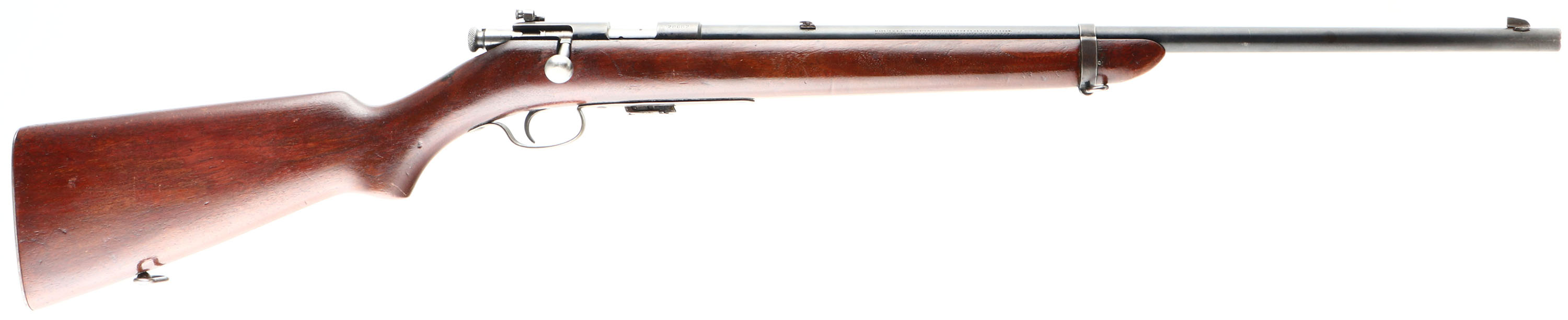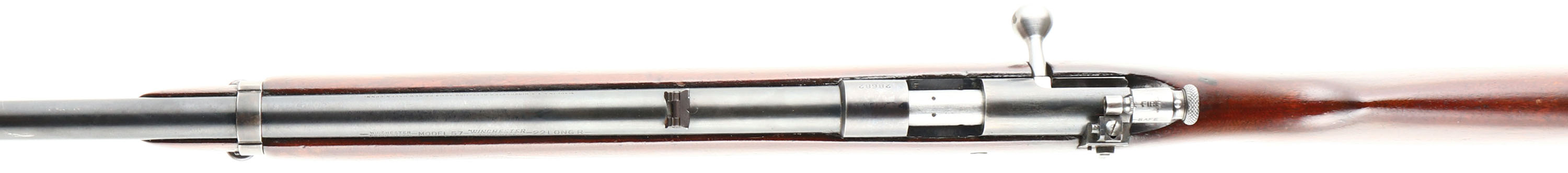 Winchester, Model 57 Target, .22 LONG R. Cal., MFG: 1927-36, SN: 28682, Bolt Action Rifle, Mag fed, 22'' barrel, with barrel band. The original flat pistol grip wood stock is very good & solid. It carries an added layer of finish over the original finish, with minor handling marks, scratches & contusions. The original metal blue finish rates 90% on the barrel, 80% on the receiver, with additional loss on the barrel band & trigger guard which are toning to a brown patina. Bore is excellent. Military style target rifle, with correct Lyman peep sight, factory sling swivels & ''Winchester'' stamped mag. Barrel fitted with a standard blade front & folding leaf rear sights. Stock carries a checkered steel buttplate. A nice condition rifle & still very collectible. FFL or C&R Req. - Value: 400 to 800