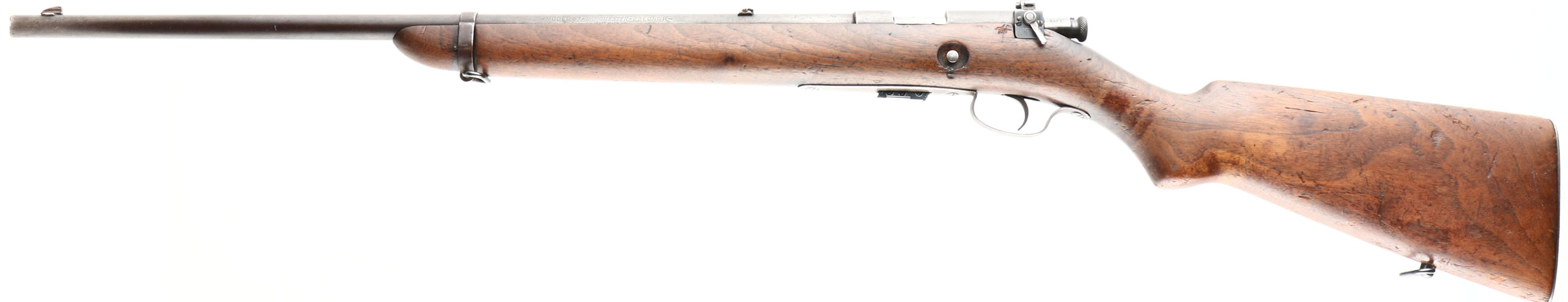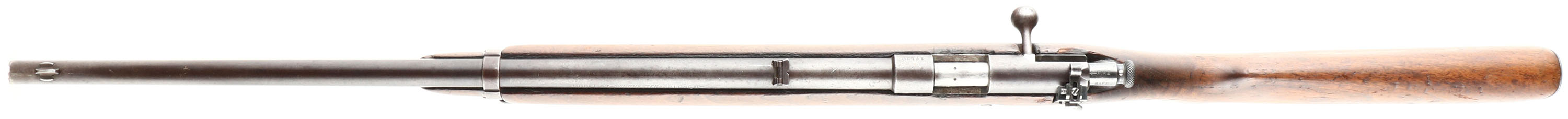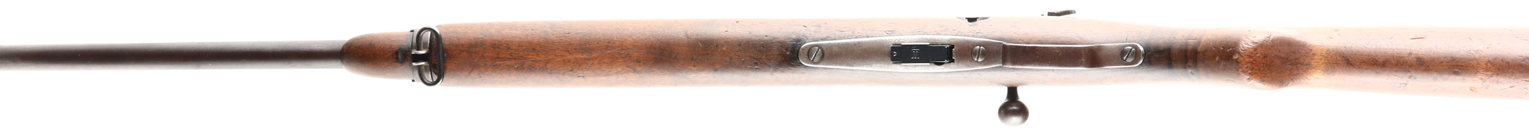 Winchester, Model 57 Target, .22 LONG R. Cal., MFG: 1927-36, SN: 17129, Bolt Action Rifle, Mag fed, 22'' barrel, with barrel band. The original flat pistol grip wood stock is very good & solid. but with numerous small handling marks, scratches, contusions & gouges to the thinned original finish. There is a small missing edge chip at the right side of forend tip The metal blue finish has worn, thinned & toned to about 40% coverage of a brown patina. Bore is very good & bright. Military style target rifle, with correct Lyman peep sight, factory sling swivels, & ''W'' stamped mag. Barrel fitted with a small blade front & folding leaf rear sights. Stock carries a checkered steel buttplate. A well used, but still original & collectible rifle. FFL or C&R Req. - Value: 300 to 600