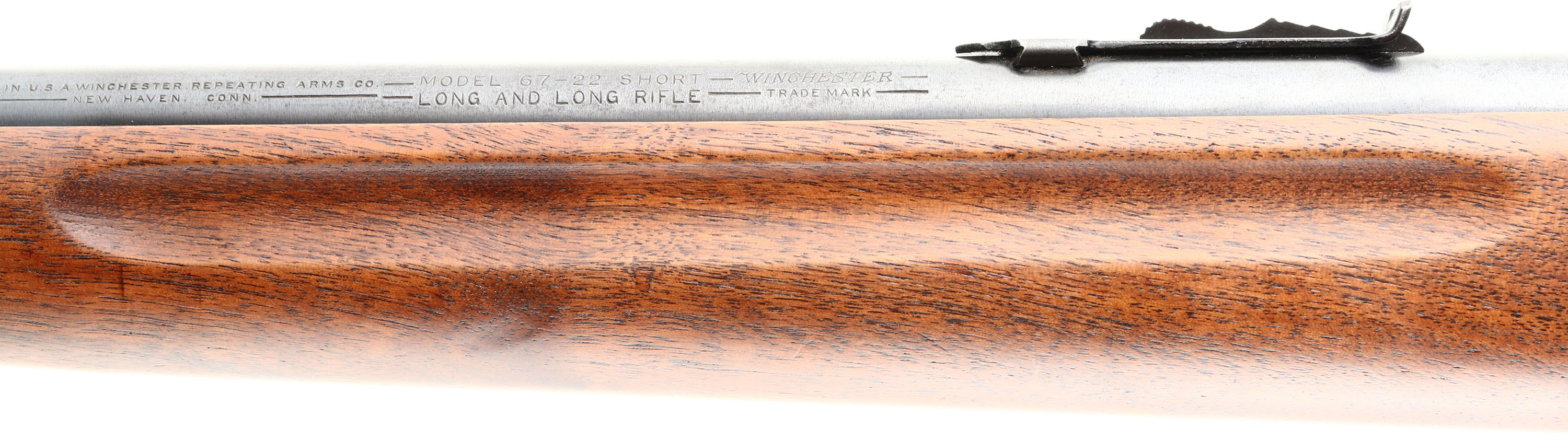 VERY RARE Winchester, Model 67 Boys Rifle or Junior Variation, 22 SHORT, LONG, AND LONG RIFLE Cal., MFG. 1934, First year production. SN: None, Bolt Action Rifle, 20'' Round barrel. This is the very rarer & most desirable of the rare ''Boys Rifle'' as it is a 1st year, 1st issue model 67 with the shorter factory 20'' barrel, nickeled trigger, exposed take-down screw, one year only grooved forend & having the factory 1'' shorter stock. The original flat pistol grip stock is excellent, with very few tiny contusions to the excellent finish. The original metal blue finish has 95% coverage. Bore is excellent. Mounted with the original sights. Winchester plastic buttplate. An investment quality, 1st year, Rare Boys Rifle. FFL or C&R Req. - Value: 1200 to 2000