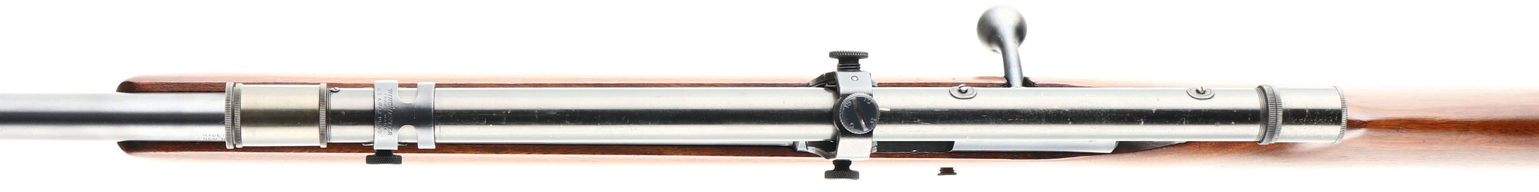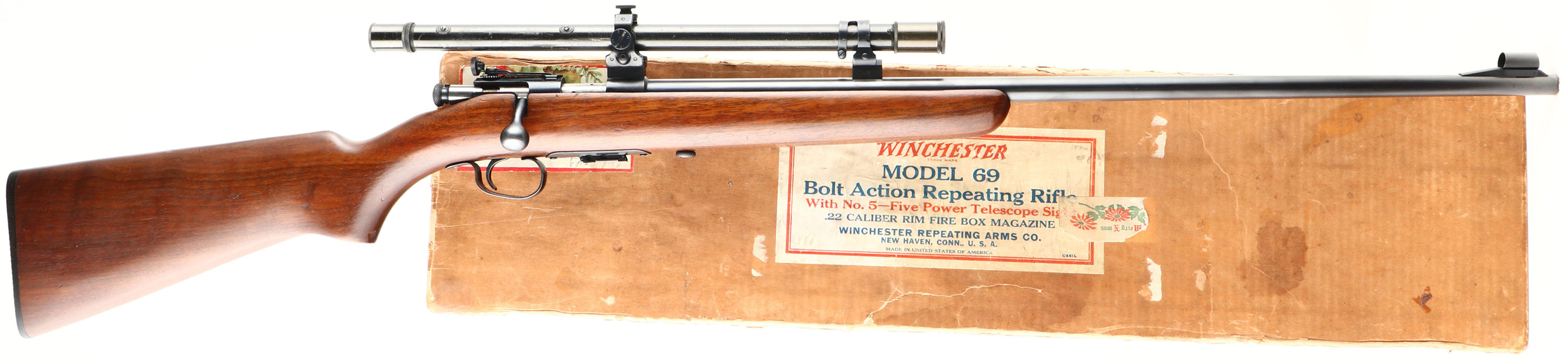RARE & BOXED Winchester, Model 69, FACTORY SCOPED, .22 SHORT, LONG & LONG RIFLE Cal., MFG: 1935-63, SN None, Box magazine, bolt action rifle, 25'' round barrel, Model 69 rifles are not in & of themselves rare, but a factory telescoped & factory peep sight example in high collectors condition & in the original factory box, with label confirming factory configuration of scope & peep, is exceptionally rare!! The original flat pistol grip factory stock & original finish is excellent, with a few finish level scratches & a few small contusions. The original metal blue finish is 98% overall. Factory mounted with a Winchester No. 5, Five Power Telescope, on Winchester raised & open scope rings. This allows for the alternative use of the factory mounted receiver peep sight & hooded front ramp sight. Bore is excellent. Black plastic Winchester buttplate. Has the side push button mag release, with the original, correct & rare ''Winchester'' & ''69'' marked magazine. Comes in the original early production brown factory box, with beige Top & end labels, with red & blue lettering. This rifle was originally a 1937 Christmas gift to a father from his children. The box carries two Christmas label on the top of the box, one of which has a hand written note which reads ''From: your only son and his sister, For: a true friend when on the ''warpath'' take this and our best wishes.'' Box contains padded paper wrap, & an envelope dated Dec 25 1937 which contains a trimmed original Model 69 brochure & a very rare original instruction sheet for Telescoped Sight, which was only added to the box at the factory when rifles carried original factory scopes. No serial number written on label which is correct for non-serialized gun. Box is very good, but with a few broken corners, tears, tape, & tattering to edges. Very desirable & extremely collectible in this rare special ordered configuration, high condition & with its correctly labeled original box.* FFL or C&R Req. - Value: 5000 to 10000