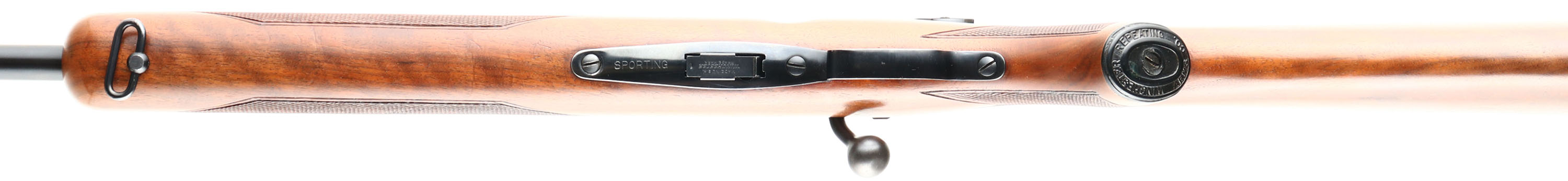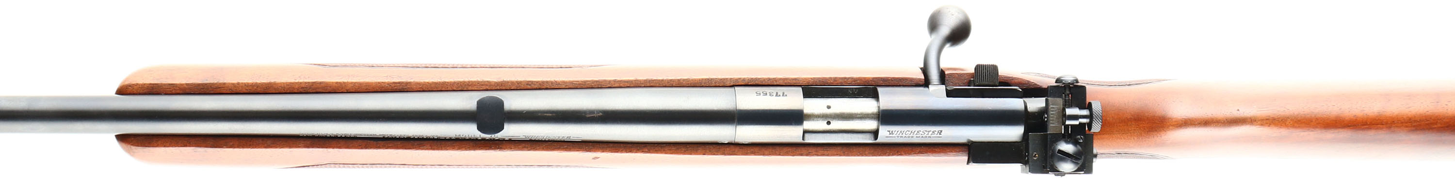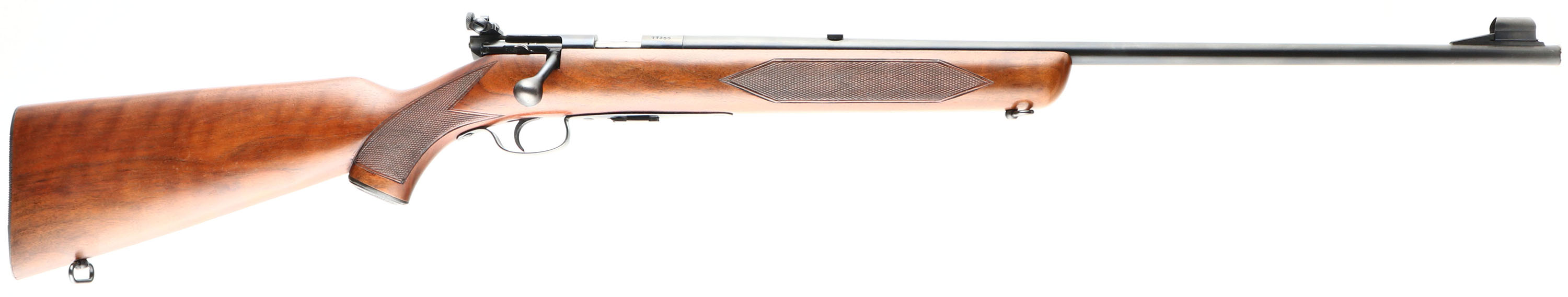 Winchester, Model 75 Sporter, .22 LONG RIFLE Cal., MFG. 1951, SN: 77355, Bolt Action Rifle, 23 3/4'' Tapered round barrel, Only 88,715 produced during the production years of 1938-58. The factory checkered & capped pistol grip, select walnut stock is excellent & original. Original factory finish is excellent, with sharp checkering & few tiny handling marks. The factory original metal blue finish is 99%. Bore is excellent. Mounted with the correct Lyman 57e adjustable receiver sight, blank filled rear dovetail & hooded front blade sight. Side push button mag release & correct Winchester marked detachable mag. Winchester metal serrated buttplate. Sling swivels. Collectible & overall excellent, original condition Sporter example. FFL or C&R Req. - Value: 1500 to 2500