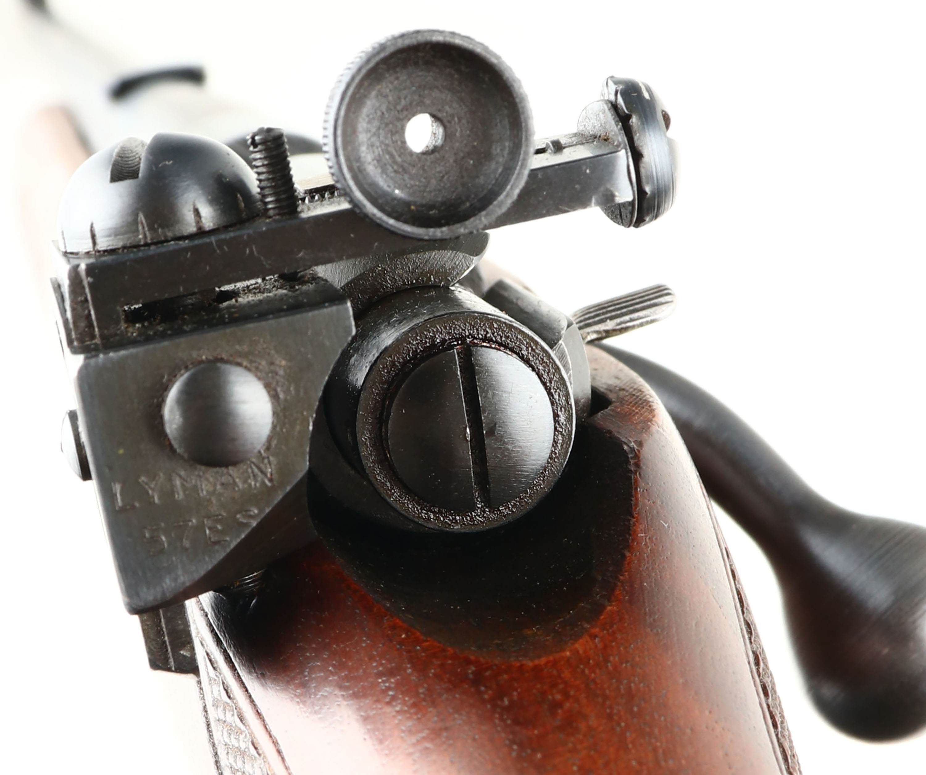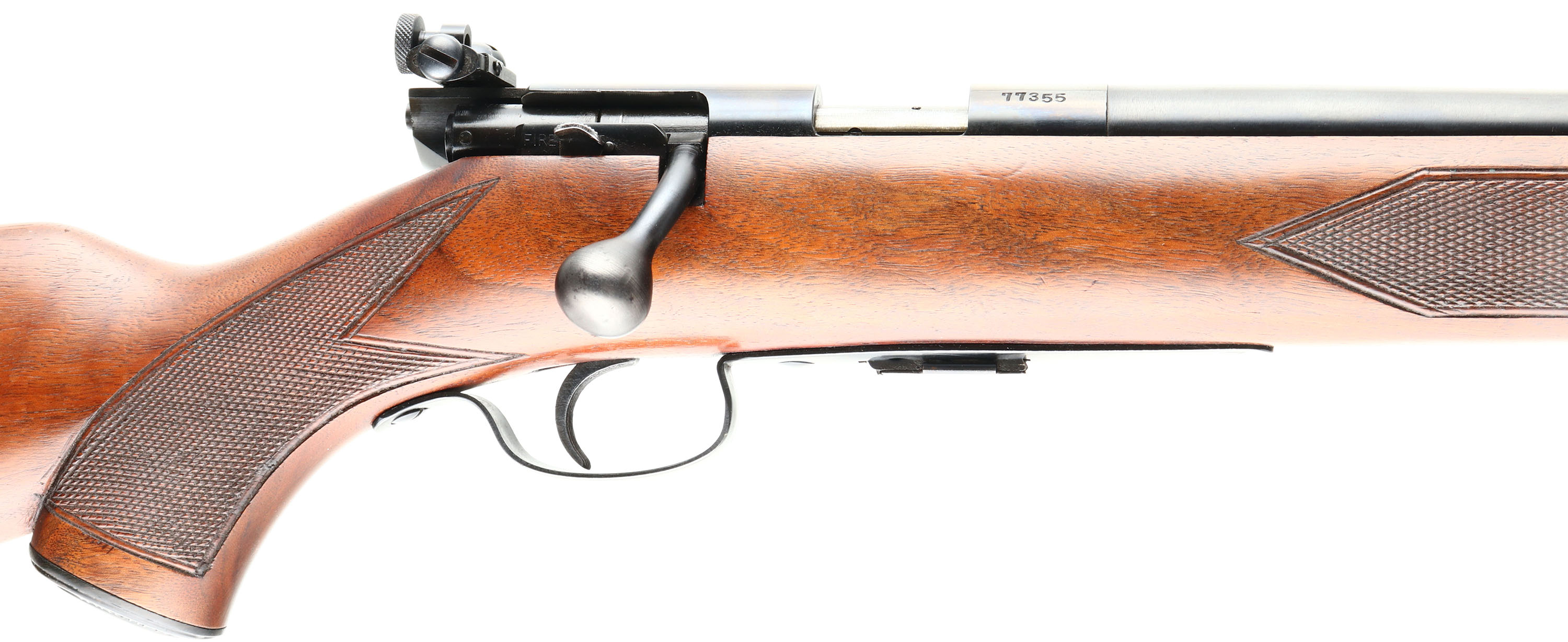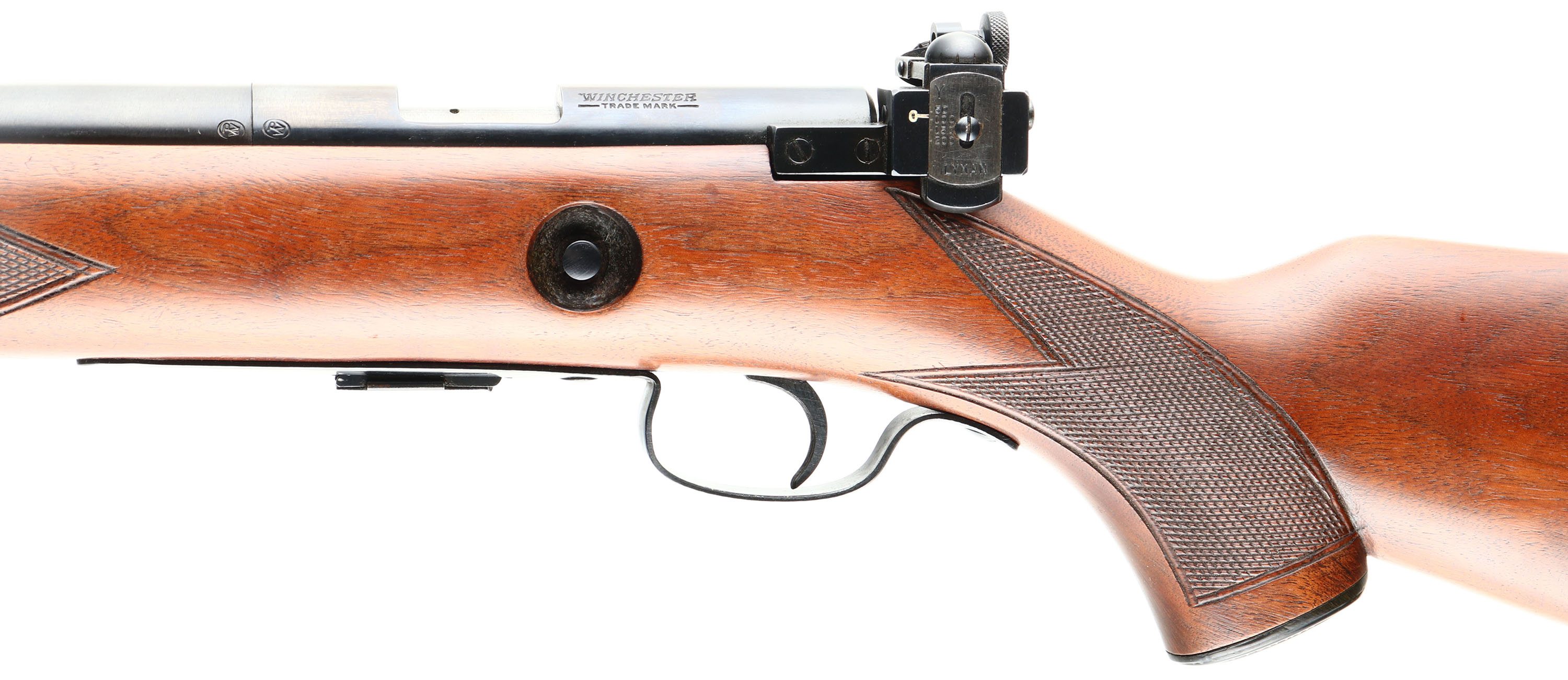 Winchester, Model 75 Sporter, .22 LONG RIFLE Cal., MFG. 1951, SN: 77355, Bolt Action Rifle, 23 3/4'' Tapered round barrel, Only 88,715 produced during the production years of 1938-58. The factory checkered & capped pistol grip, select walnut stock is excellent & original. Original factory finish is excellent, with sharp checkering & few tiny handling marks. The factory original metal blue finish is 99%. Bore is excellent. Mounted with the correct Lyman 57e adjustable receiver sight, blank filled rear dovetail & hooded front blade sight. Side push button mag release & correct Winchester marked detachable mag. Winchester metal serrated buttplate. Sling swivels. Collectible & overall excellent, original condition Sporter example. FFL or C&R Req. - Value: 1500 to 2500