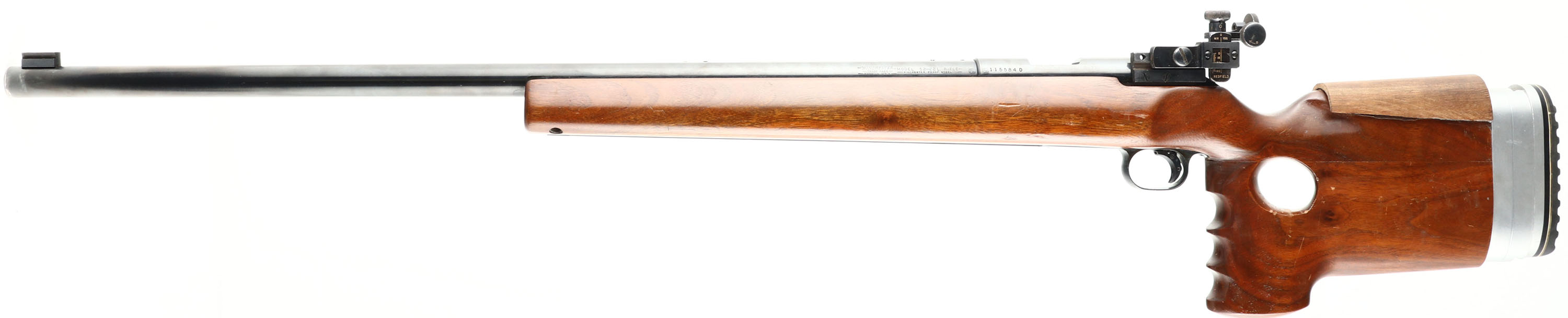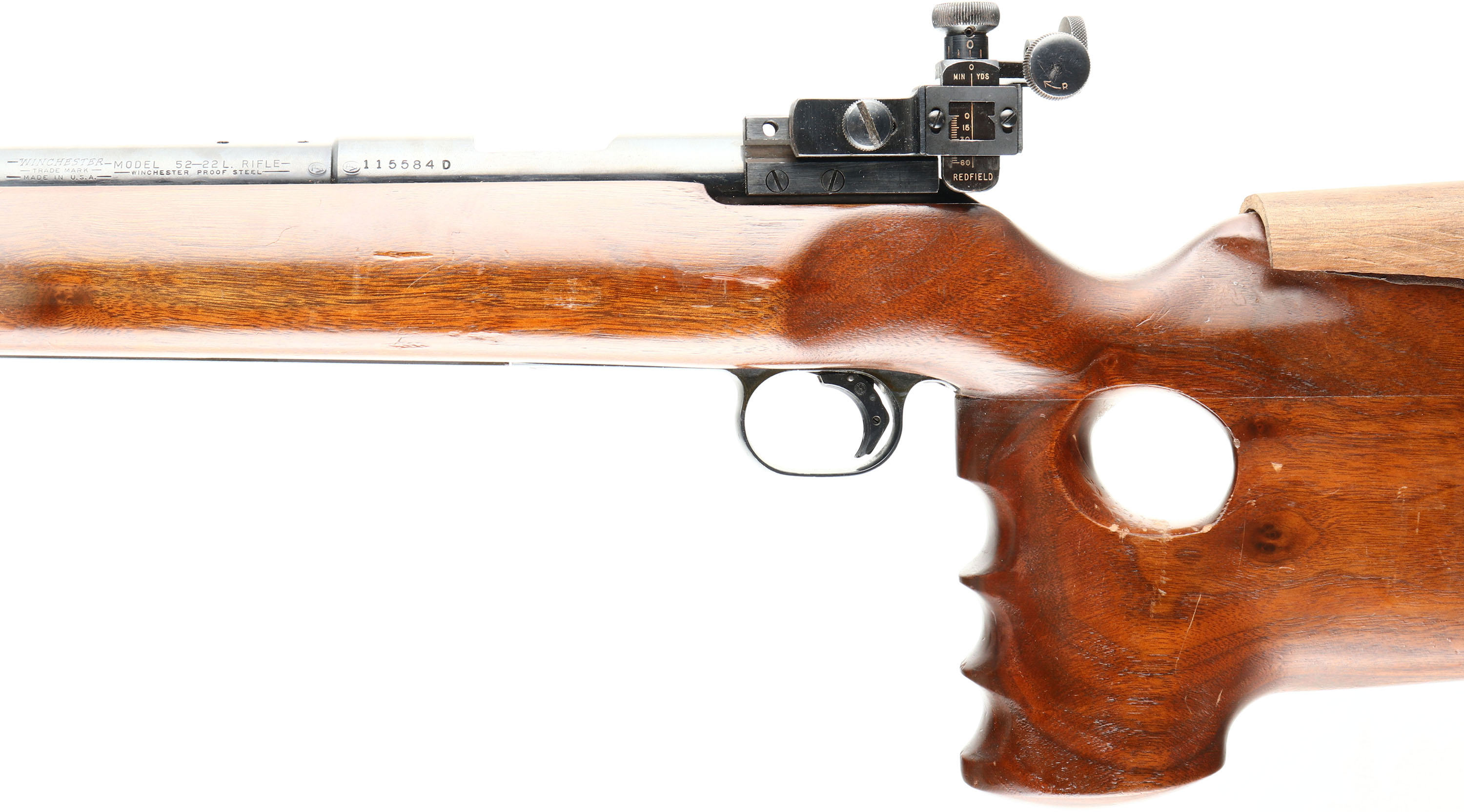 Winchester, Model 52 Target gun, marked 22 L.Rifle, MFG. 1963, SN: 115584D, Bolt action rifle, 28'' Round Heavy Barrel. The custom, finger grooved & thumbhole pistol grip wood target stock is very good. The original finish is very good, but with numerous light contusions & scratches. There is an added piece of wood attached to the top of the comb to add additional height. The original metal blue finish rates 95% on barrel, receiver & trigger guard, but the trigger guard has been modified on the right rear portion. Fitted with a Redfield International Match receiver sight. The front of the barrel carries a sight or scope block, with four screw filled holes in the barrel for possible sight or scope mounting. Bore is excellent. Stock carries a Sure Grip muti-adjustable buttplate system, while the underside of the stock has an inlaid attachment rail. A unique & quality custom target rifle. FFL or C&R Req. - Value: 400 to 800