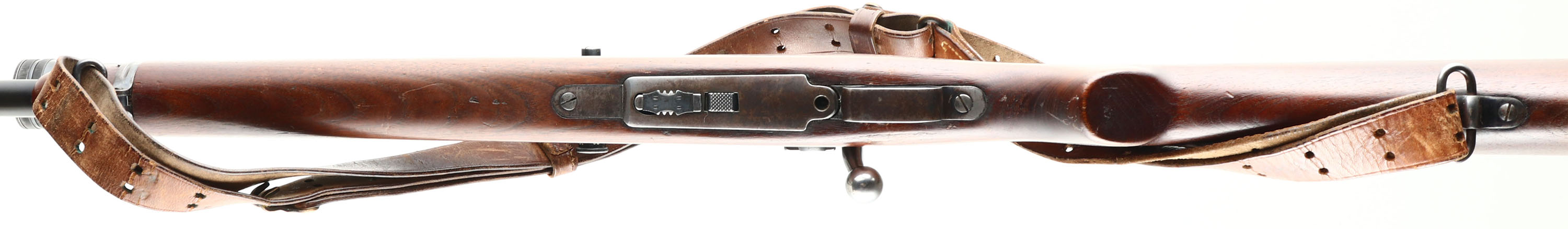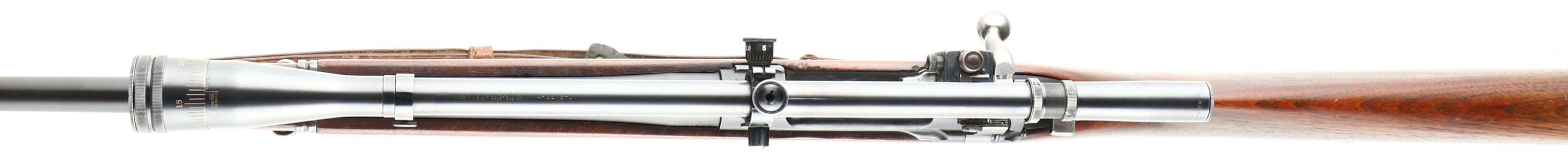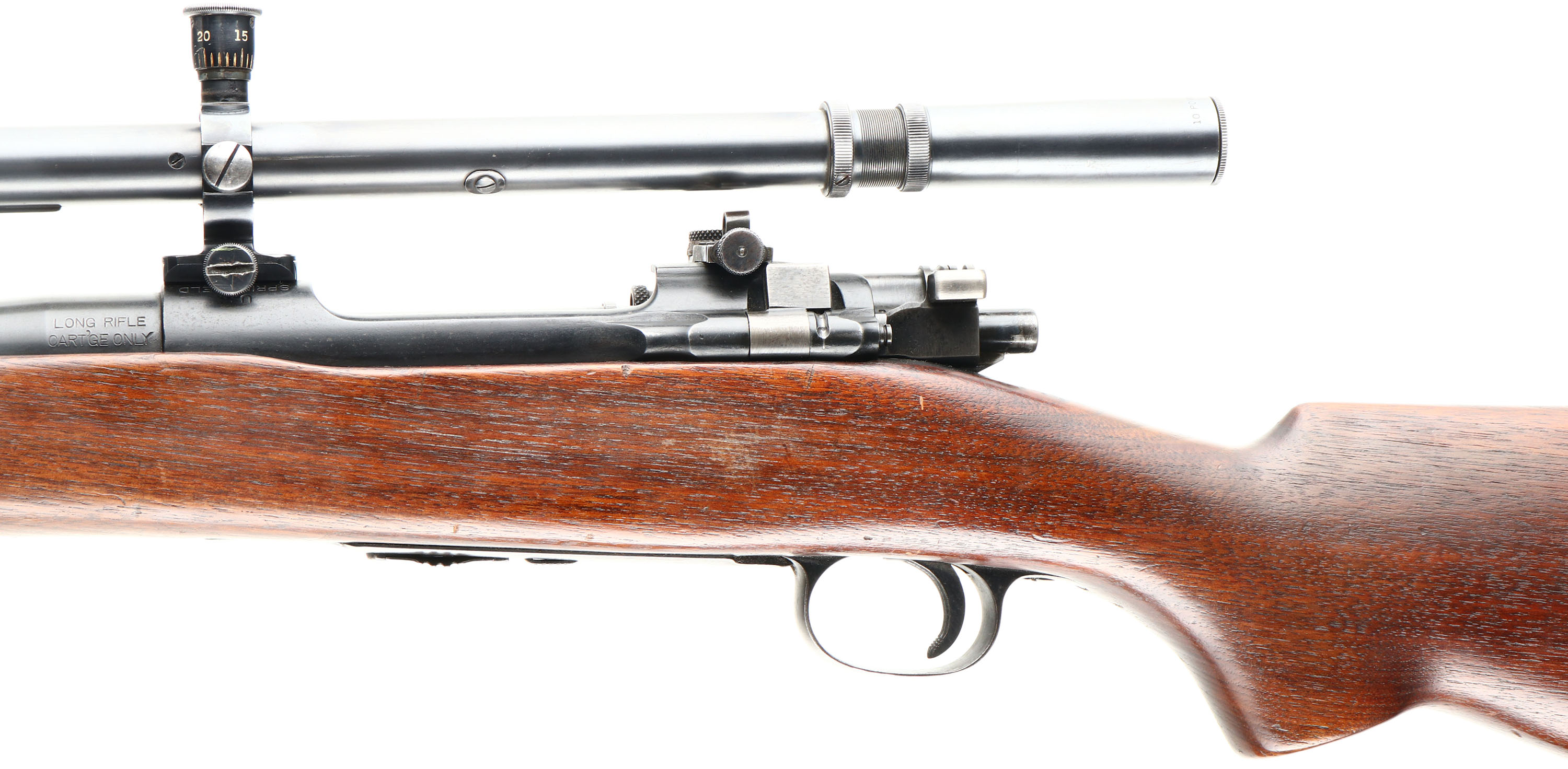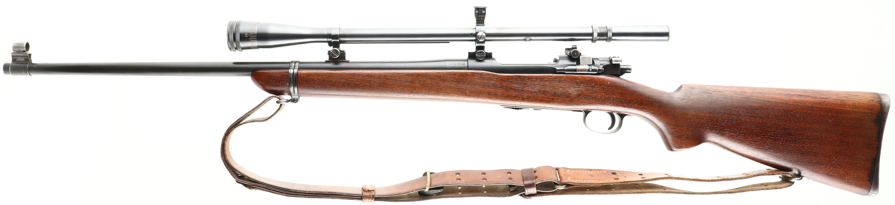 U.S Springfield, M1922M1 Training Rifle, CAL: 22, MFG: 1929 (barrel date), SN: 18754, Bolt Action Rifle, 24 1/2'' barrel. The original flat pistol grip wood stock is excellent. There are minor handling marks to the finish. The military style metal finish rates 97% overall, with light speckling on the receiver. The top of the receiver is marked '' U.S. SPRINGFIELD ARMORY M1922M1 CAL.22 18754 ''. The muzzle end of the barrel is marked in three lines ''S.A. (Flaming Bomb) 8-29''. Bore is excellent. The rifle is fitted with the original Lyman 48 adjustable rear target sight & a elevated hooded post front sight. Additionally, this rifle holds a Lyman Targetspot 10 Power scope on dovetail blocks. Stock holds the original thick checkered metal buttplate. The rifle still carries the original leather sling, connected to the front barrel band & rear sling loop. A very nice example of a 1922M1 Training Rifle. FFL or C&R Req. - Value: 1000 to 1500