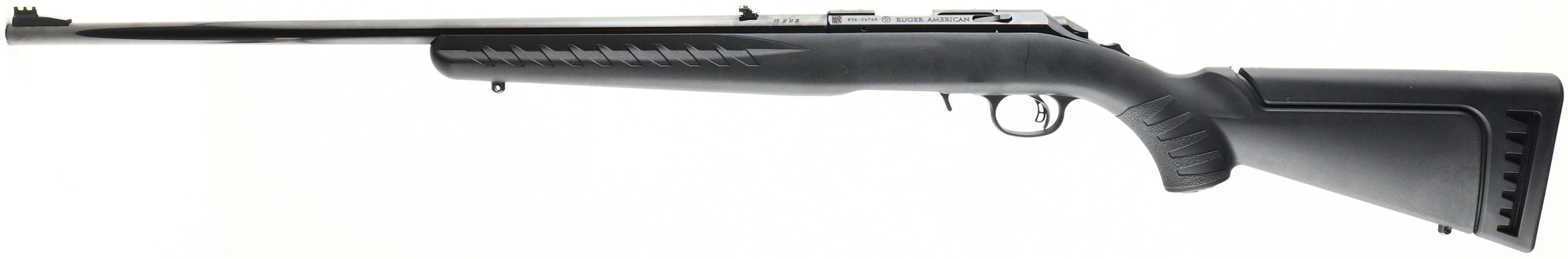 BOXED & NEW Ruger, American, Cal. 17 HMR, Bolt Action Rifle, Mfg: modern, SN: 836-04749, 22'' barrel, The flat pistol grip black synthetic stock is mint. The factory metal blue finish is 99%. Bore is minty. Barrel fitted with factory rear folding sight & green fiber optic bar front sight. Comes with a second factory buttend, with raised comb to be swapped according to buyers preference. Comes in the original box, with second stock option, lock & paperwork. Gun shop inventory, never sold to public, NIB old stock. FFL Req. - Value: 350 to 450