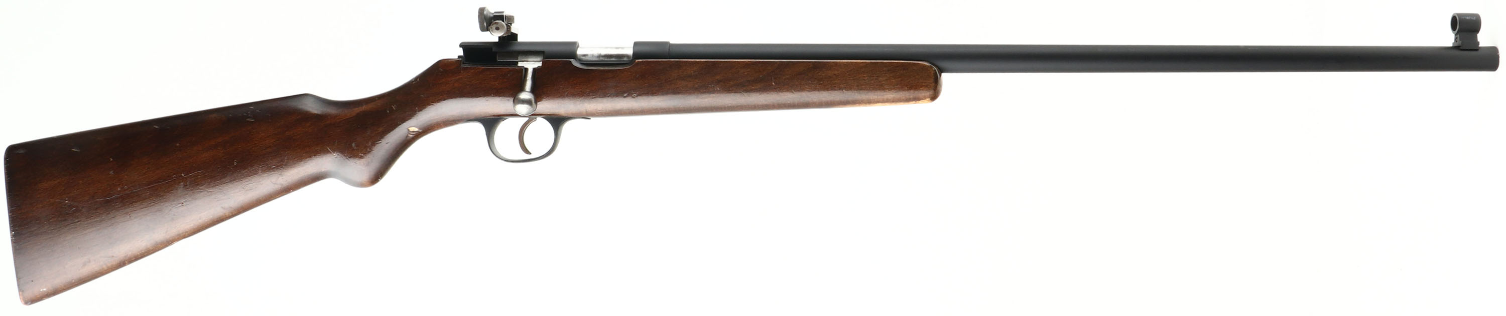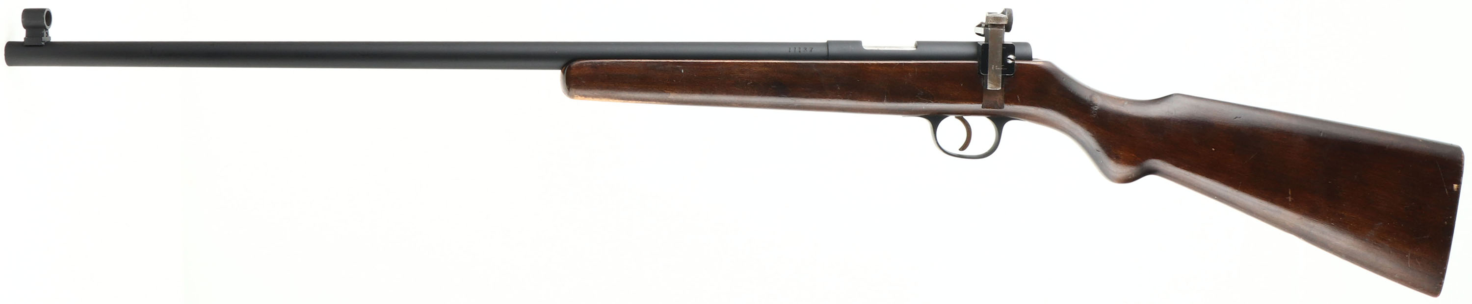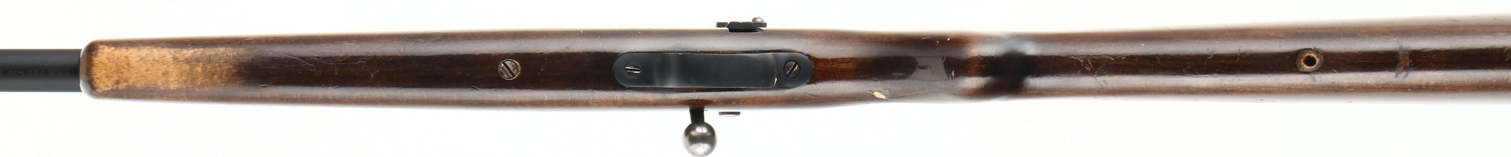 Schultz & Larsen, Model Unknown Bolt Rifle, CAL: 22 LR, MFG: N/A, SN: 11137, Bolt Action Rifle, 23 5/8'' barrel. The company is known for producing competitive target shooting rifles. The round knob wood stock is very good. There are scrapes, scratches, dings & areas of thinning to the high gloss finish. There's a large worn area of finish at the forend belly. The barrel & receiver have been refinished with a matte black finish which is excellent, with handling & usage marks. Bore is excellent. There is a side mounted fully adjustable aperture receiver sight & an elevated hooded silhouette front sight. Stock has open holes from previously mounted sling studs in belly & forend tip. Manufactured without buttplate, smooth buttend. FFL Req. - Value: 150 to 300