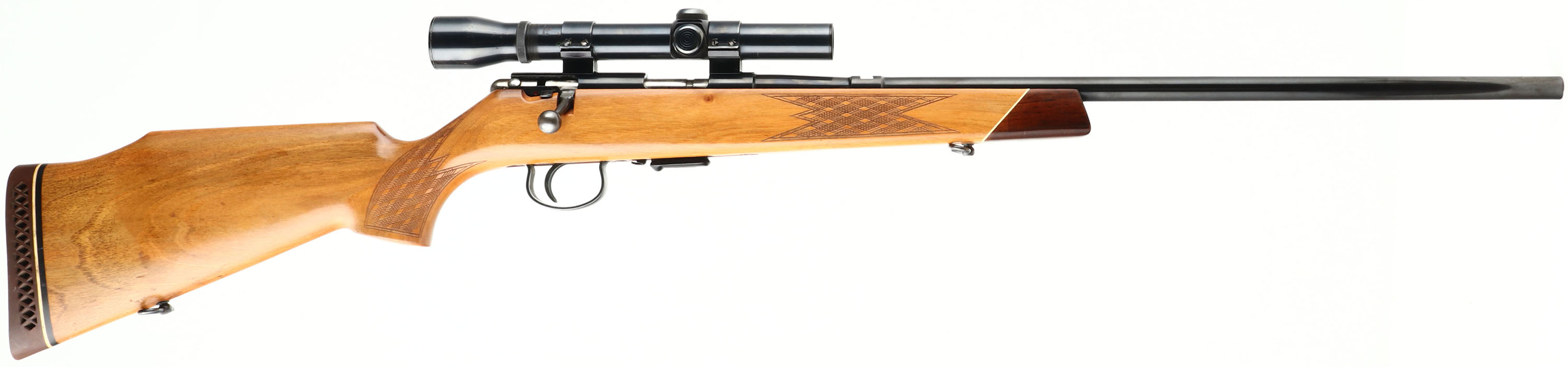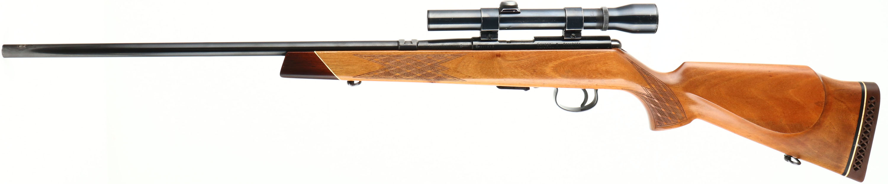 Savage Anschutz, Model 141M, CAL: 22 Win Mag, MFG: 1964, SN: 467818, Bolt Action Rifle, 22'' barrel. The original checkered & beaded cheek Monte Carlo wood stock is excellent. There are handling marks & minor dings to the high gloss finish. The original metal blue finish rates 98% overall. Bore is excellent, but possibly with a ring appx 10'' from the muzzle, but not a bulge visible from outside. The rifle carries a Weaver K3 scope, held by Weaver rings. The rear open sight provision is open & the lead filled front dovetail. Stock carries a Browning ventilated brown rubber recoil pad. Sling loops. Anshutz detachable mag. FFL or C&R Req. - Value: 200 to 400