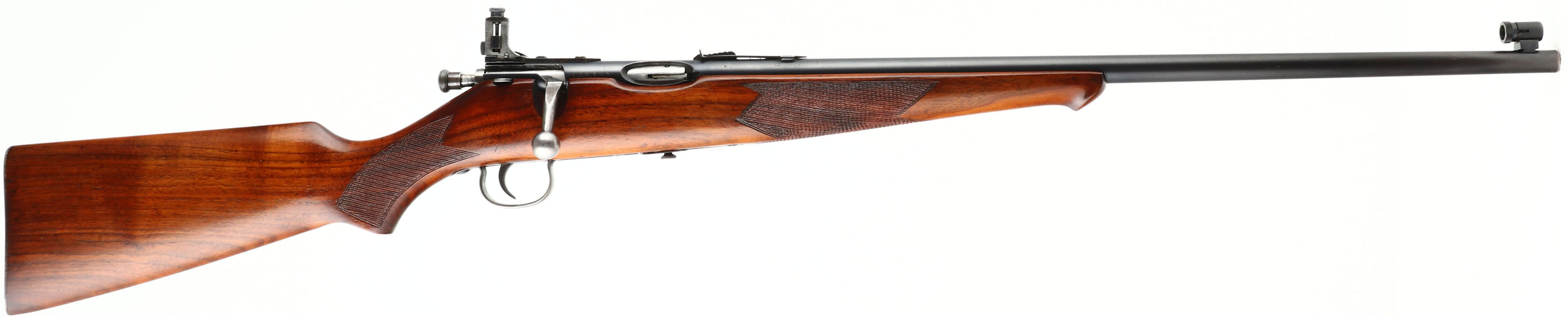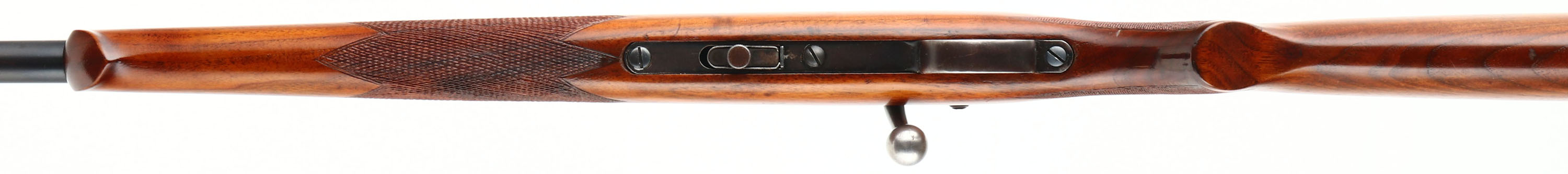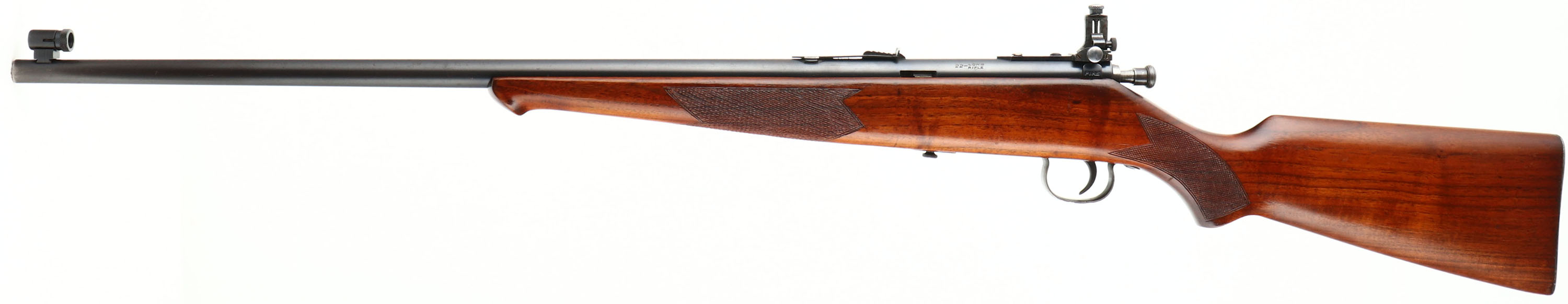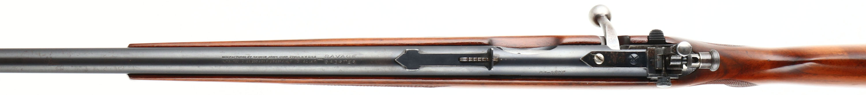 Savage, Model 23A Sporter, CAL: 22LR, MFG: N/A, SN: 126280, Bolt Action Rifle, 23 1/4'' barrel. The checkered flat pistol grip wood stock, with schnabel forend, is excellent. We believe this is actually a Model 23AA sinch checkered, as the 23A came with a plain pistol grip stock. There is an added layer of finish or varnish, which is excellent. The restored metal blue finish rates 90%. Bore is excellent. The receiver holds an adjustable aperture sight, while the barrel holds an adjustable rear sight & an elevated globe front sight. Stock carries a Savage smooth metal buttplate. FFL or C&R Req. - Value: 200 to 400