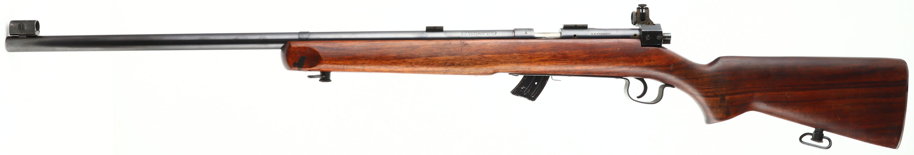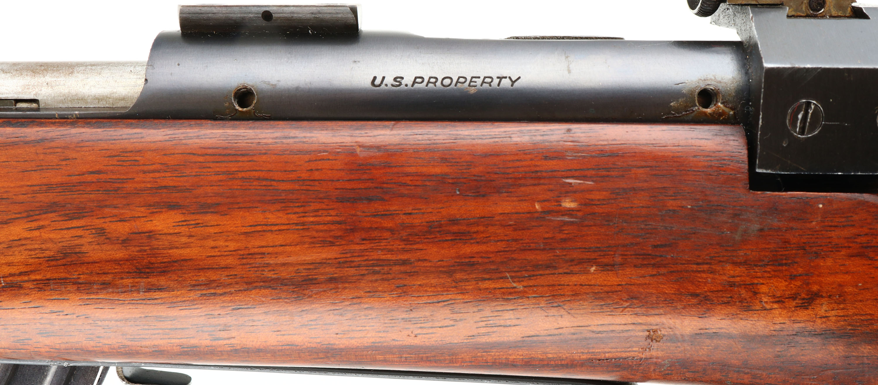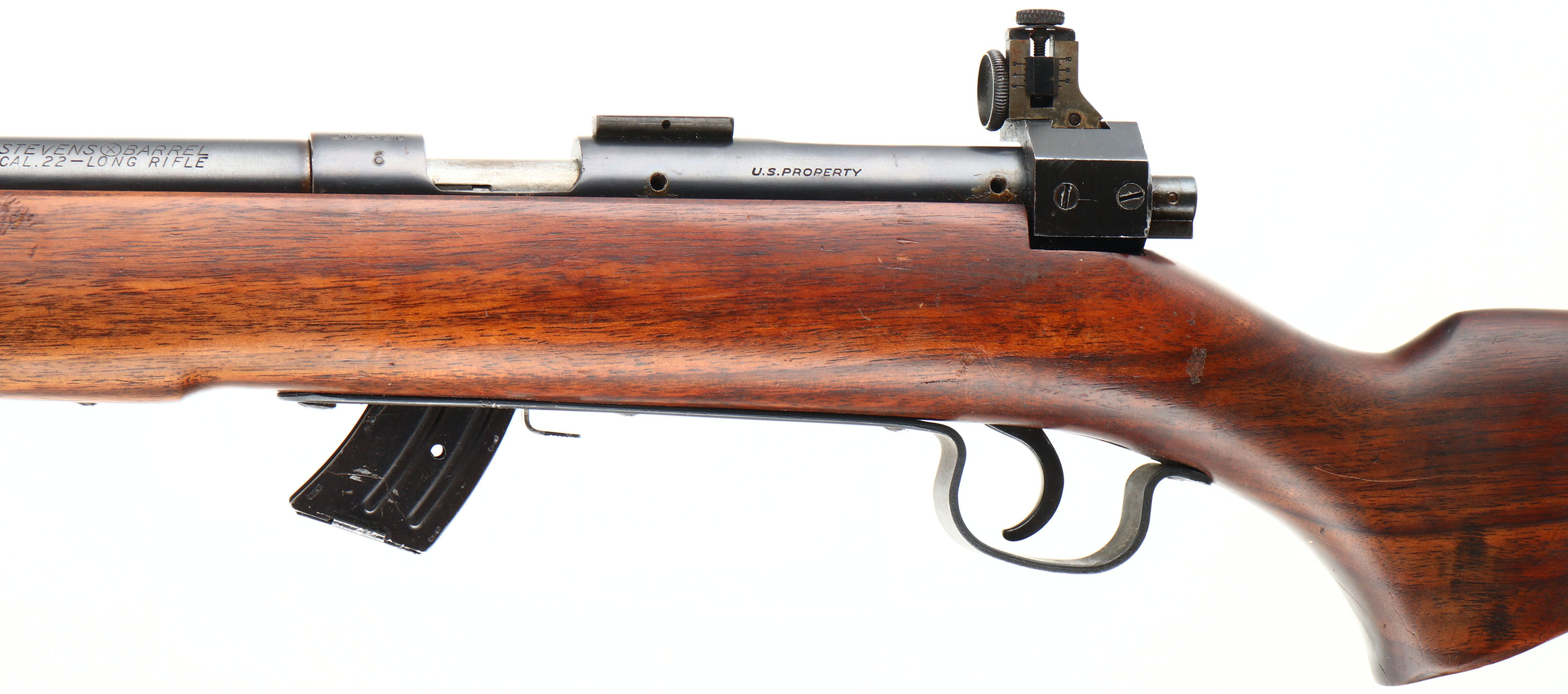 Stevens, Model 416 U.S Training Rifle, CAL: 22LR, MFG: 1941-43, SN: 202620, Bolt Action Rifle, 26'' barrel. This gun was part of a 10,000 rifle contract that the United States military ordered for use in basic firearms training. It's marked ''U.S. Property'' on the left side of the receiver along with a Flaming Bomb. The original flat pistol grip target stock is excellent & solid, with minor contusions, scrapes & light staining. The original metal blue finish rates 95% overall. Bore is excellent & minty. The receiver holds the original side mounted fully adjustable rear aperture sight & the barrel holds the original hooded post front sight. There are factory scope bases on the receiver & barrel. The left side of the receiver is tapped & drilled, with (2) open screw holes. Sling sloops. Stock has a grooved metal buttplate. Original detachable magazine. A seldom seen WWII U.S training rifle. FFL ort C&R Req. - Value: 400 to 800