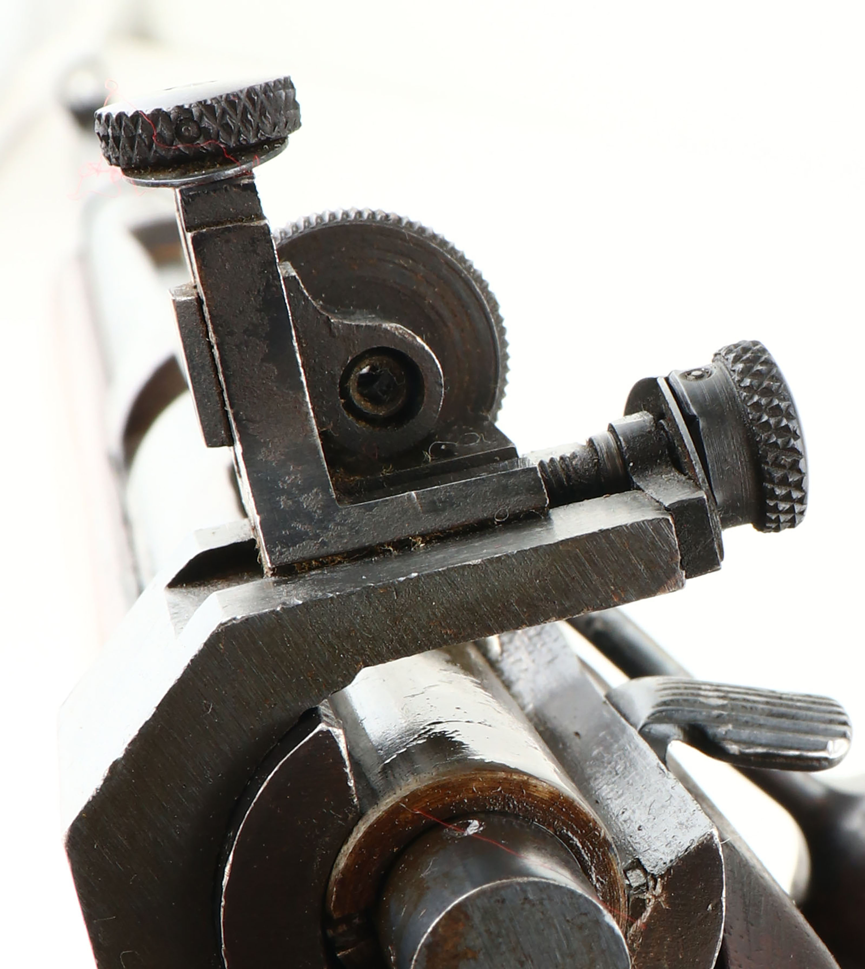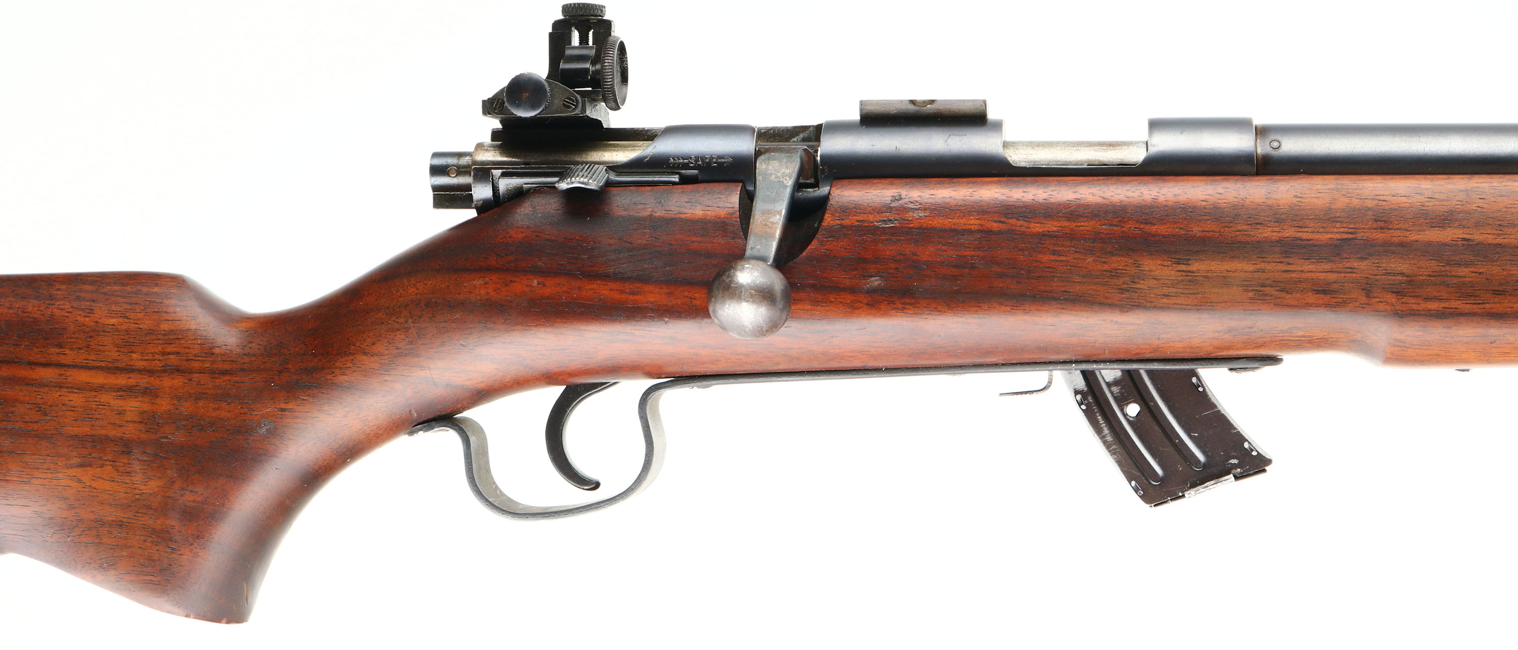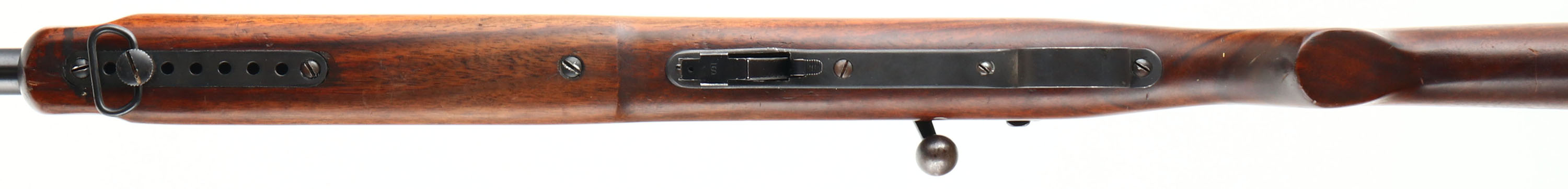 Stevens, Model 416 U.S Training Rifle, CAL: 22LR, MFG: 1941-43, SN: 202620, Bolt Action Rifle, 26'' barrel. This gun was part of a 10,000 rifle contract that the United States military ordered for use in basic firearms training. It's marked ''U.S. Property'' on the left side of the receiver along with a Flaming Bomb. The original flat pistol grip target stock is excellent & solid, with minor contusions, scrapes & light staining. The original metal blue finish rates 95% overall. Bore is excellent & minty. The receiver holds the original side mounted fully adjustable rear aperture sight & the barrel holds the original hooded post front sight. There are factory scope bases on the receiver & barrel. The left side of the receiver is tapped & drilled, with (2) open screw holes. Sling sloops. Stock has a grooved metal buttplate. Original detachable magazine. A seldom seen WWII U.S training rifle. FFL ort C&R Req. - Value: 400 to 800