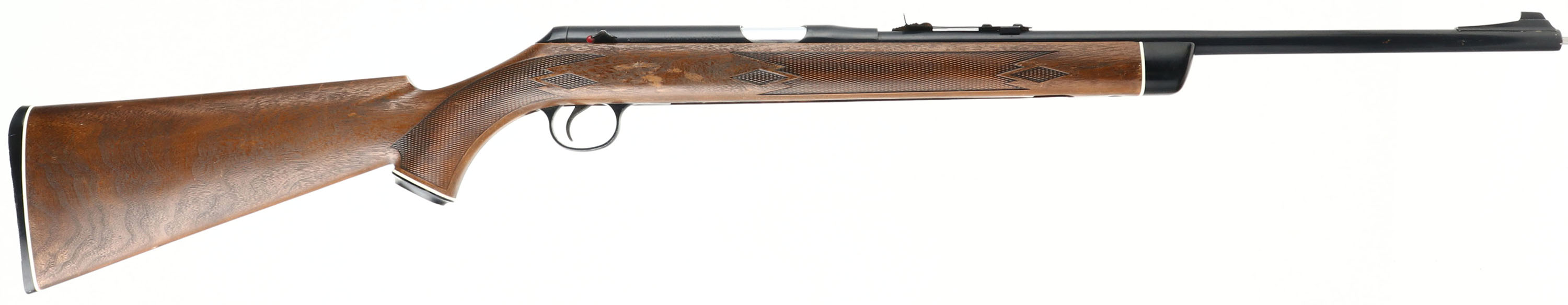 Daisy & Heddon, VL Rifle, CAL: .22 Cal. Caseless VL Ammo, S/N: A036033, 18'' barrel. The original checkered & capped pistol grip wood grain plastic stock, with ebony forend tip is excellent & solid. There are scratches, scrapes & a few thinning areas of the high gloss finish. The metal blue finish rates 97% overall, with a couple areas of flaking revealing metal grey that's toned to a brown patina. Bore is fair, dark & rough. The barrel holds an adjustable rear sight & ramp elevated blade front sight. Stock carries a VL grooved plastic buttplate. FFL Req. - Value: 200 to 400