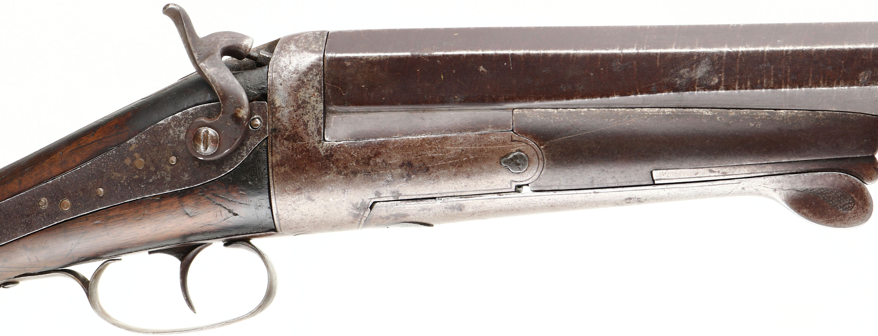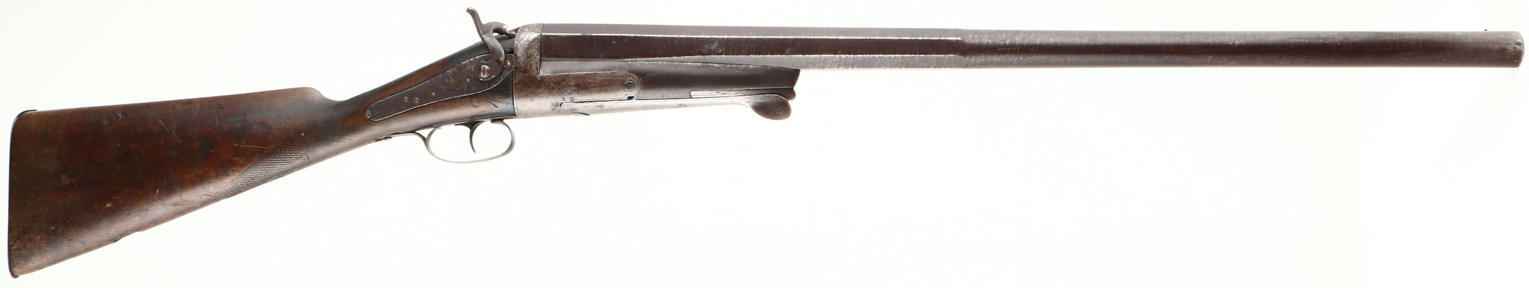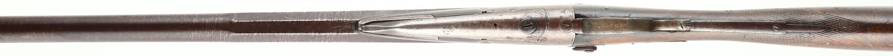 W. Richards, 8 Ga, MFG: Pre 1898, S/N: 12, Break Single Shotgun, 30'' Laminated steel half octagon half round barrel. The checkered straight wrist stock is very good with nicks, dings, dents, scratches, & wear from use/age, worn checkering, hole in belly of stock for pendent, stock shows signs of well use out in the field. The metal on the barrel has toned to a brown patina with spots of gun metal gray, laminated steel patten still present, the metal on the receiver has mostly toned to a brown patina with big spots of gun metal gray, no visible marking on the outside of the gun. Bore is good with roughness & light pitting. Barrel holds a bead front sight. Stock carries a metal buttplate with wear & brown patina. Hammer has some play, Lockup is tight & has no play. LOP: 14 1/2'', DAH: 2 7/8'', DAC: 2 1/16''. Laminated steel barrels are not safe to shoot smokeless loads or steel shot out of. Antique No FFL Req. - Value: 1000 to 3000