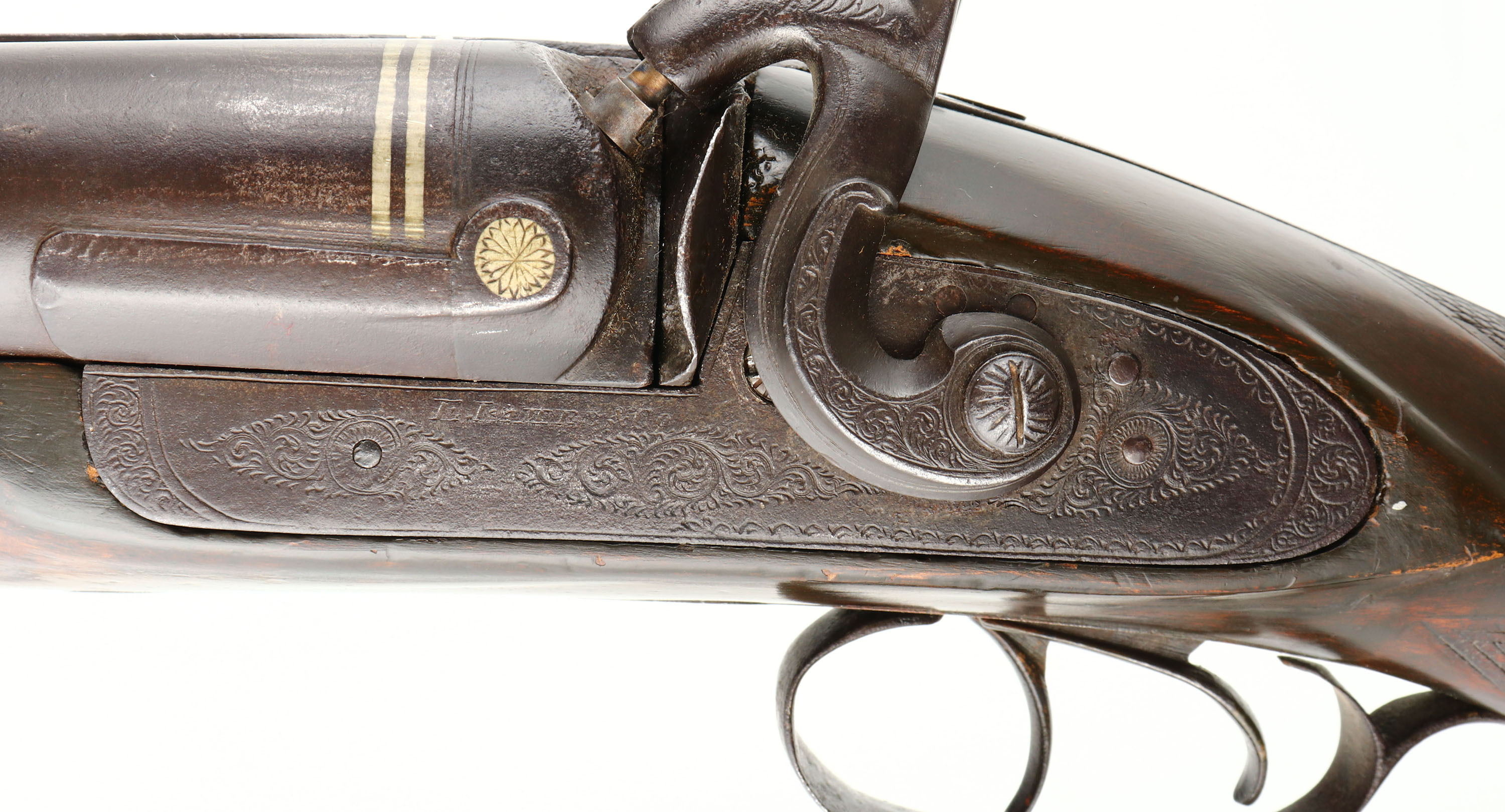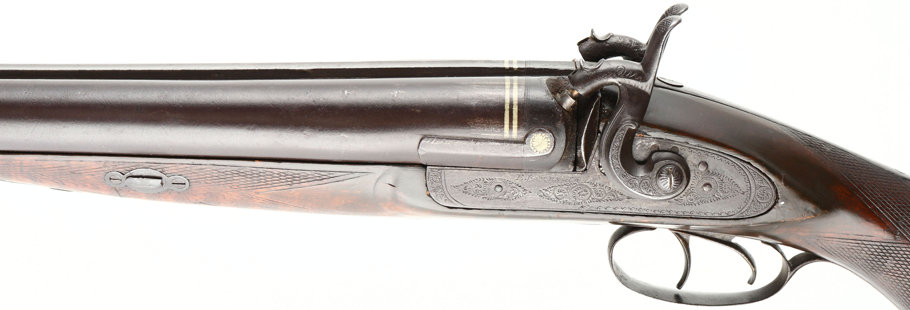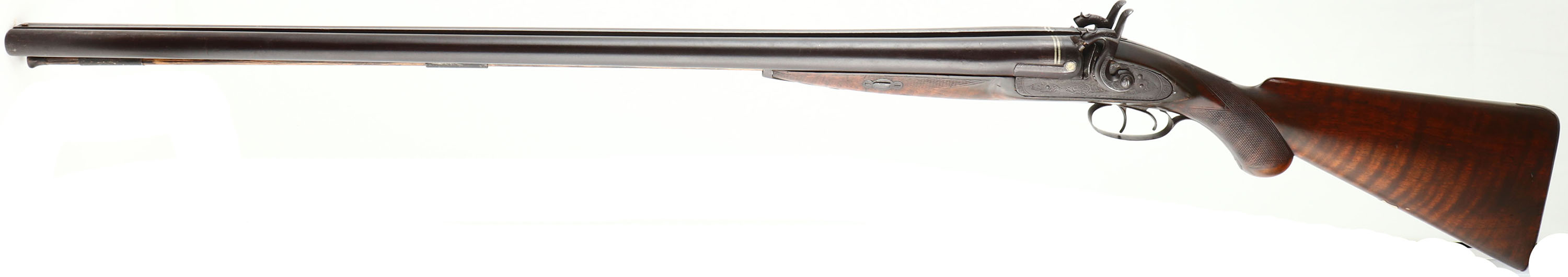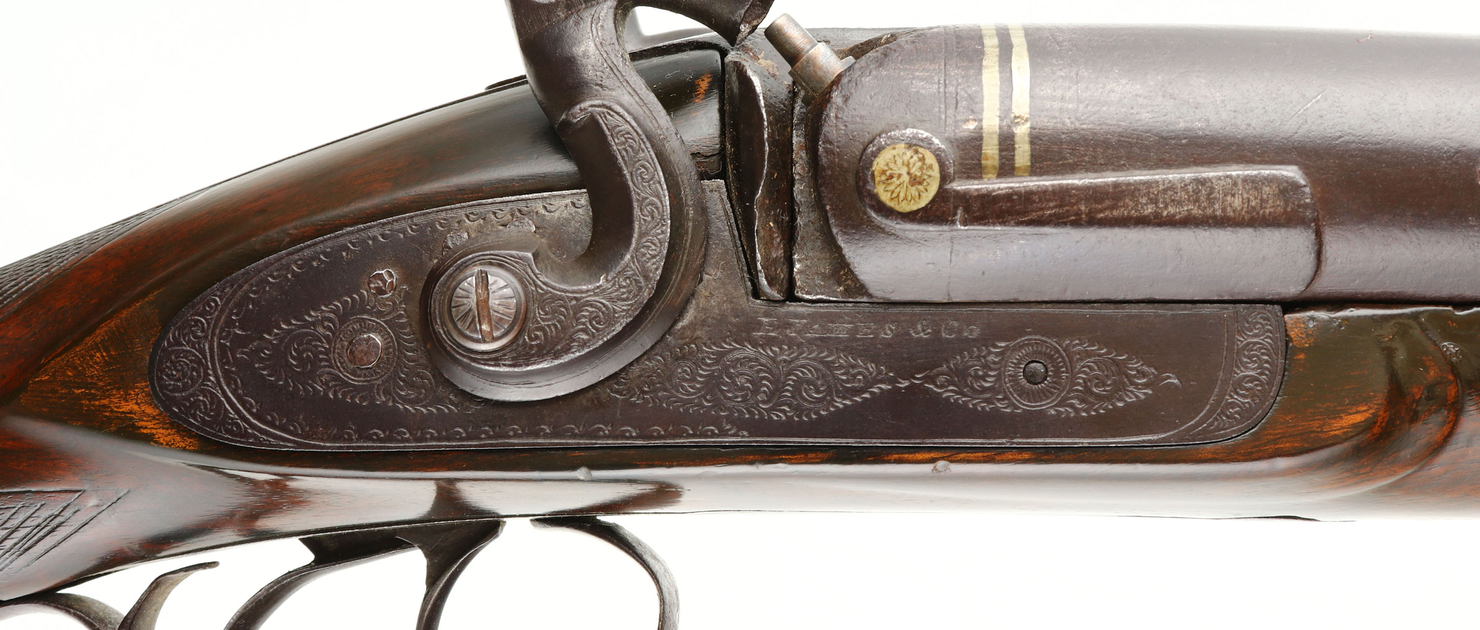 E. James & Co, Muzzleloader Shotgun, CAL: 10GA, MFG: 1880-89, SN: NSN, Percussion Muzzleloading SxS Shotgun, 33 1/4'' barrels. The rib is stamped '' E. JAMES & CO LOVEDAY ST BIRM''. The original, checkered round knob wood stock is very good, having been sanded & refinished. There is a crack repair on the left side of the wrist, below the sidelock, along with contusions & dings. There is also a blank silver shield name plate on the belly of the stock. The metal finish on the barrels has fully toned to a brown patina. The side locks, hammers & upper tang are all engraved in an ornamental scroll pattern. There are two small strips of silver inlay at the breech end of the barrels, as well as an engraved silver inlaid disc on the side of each barrel. Bores are good, rough with intermittent pitting. The solid rib holds a worn brass bead. Stock carries a smooth metal widows peak buttplate. Ram rod present. Replaced nipples. Black Powder Only. LOP: 14 1/8''. Antique, No FFL Req. - Value: 2000 to 4000