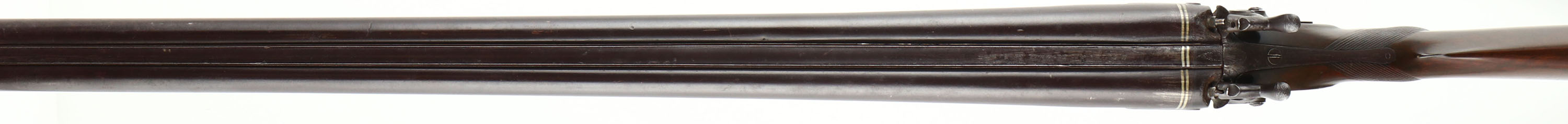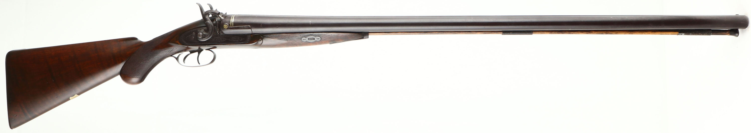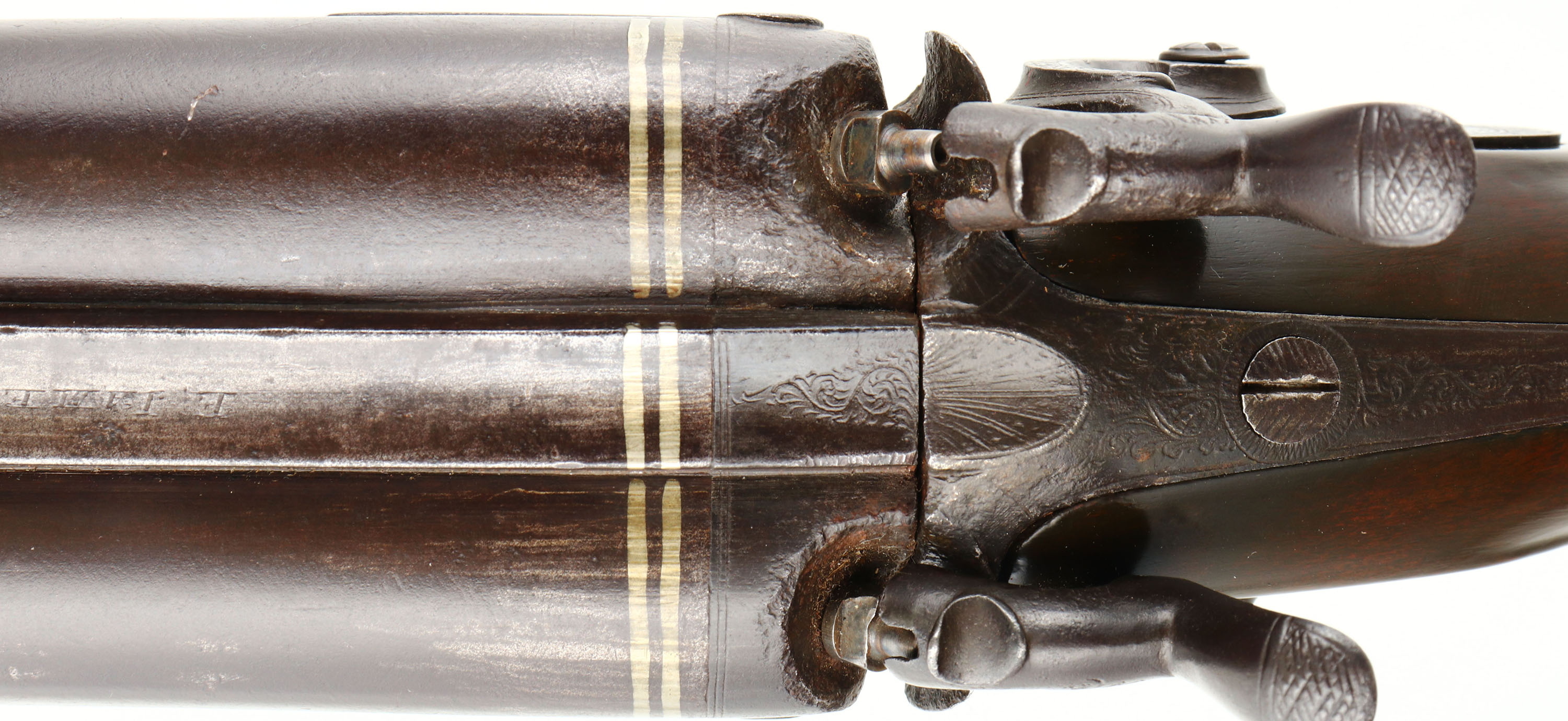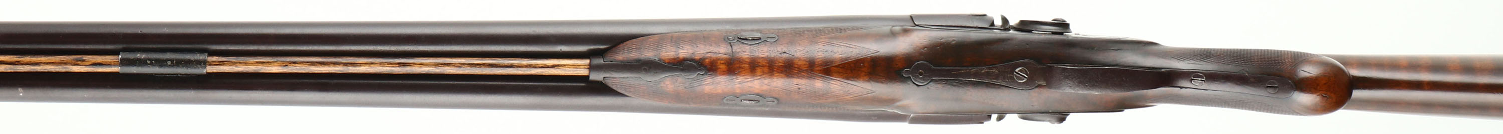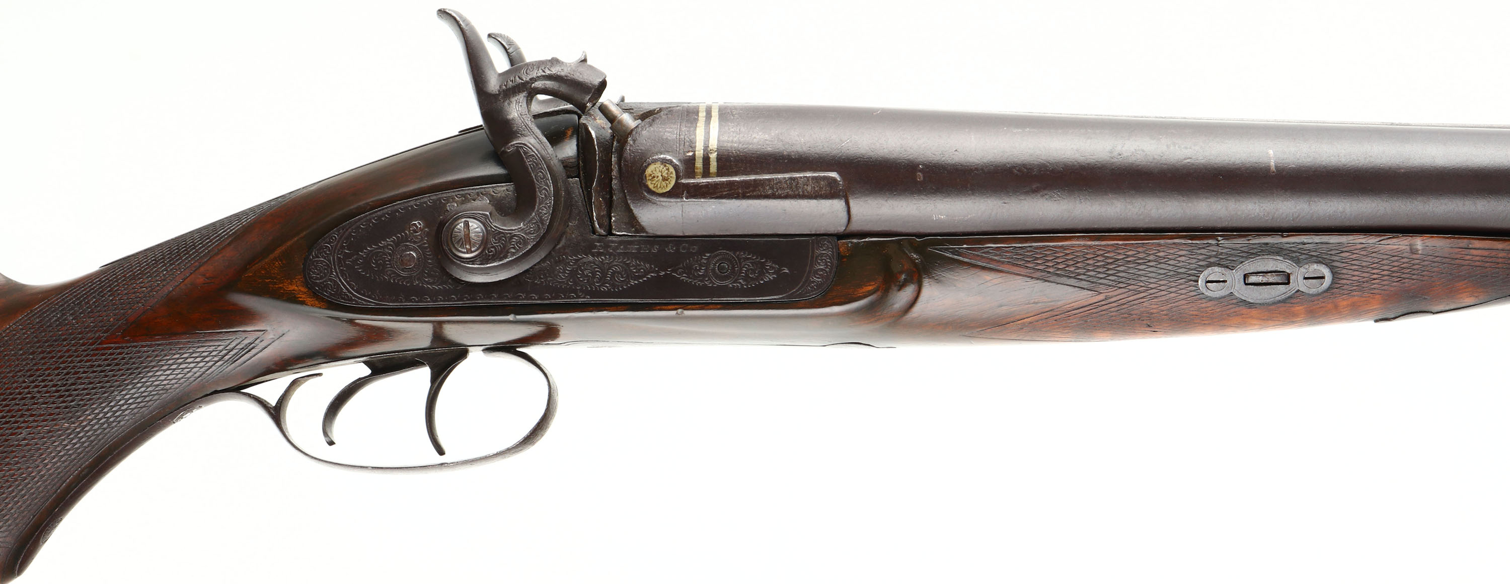 E. James & Co, Muzzleloader Shotgun, CAL: 10GA, MFG: 1880-89, SN: NSN, Percussion Muzzleloading SxS Shotgun, 33 1/4'' barrels. The rib is stamped '' E. JAMES & CO LOVEDAY ST BIRM''. The original, checkered round knob wood stock is very good, having been sanded & refinished. There is a crack repair on the left side of the wrist, below the sidelock, along with contusions & dings. There is also a blank silver shield name plate on the belly of the stock. The metal finish on the barrels has fully toned to a brown patina. The side locks, hammers & upper tang are all engraved in an ornamental scroll pattern. There are two small strips of silver inlay at the breech end of the barrels, as well as an engraved silver inlaid disc on the side of each barrel. Bores are good, rough with intermittent pitting. The solid rib holds a worn brass bead. Stock carries a smooth metal widows peak buttplate. Ram rod present. Replaced nipples. Black Powder Only. LOP: 14 1/8''. Antique, No FFL Req. - Value: 2000 to 4000