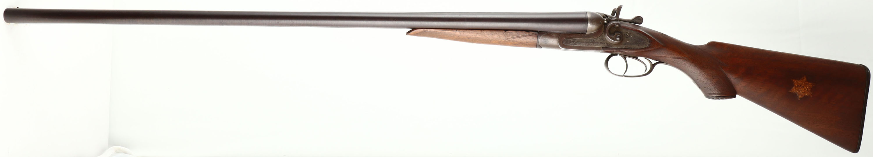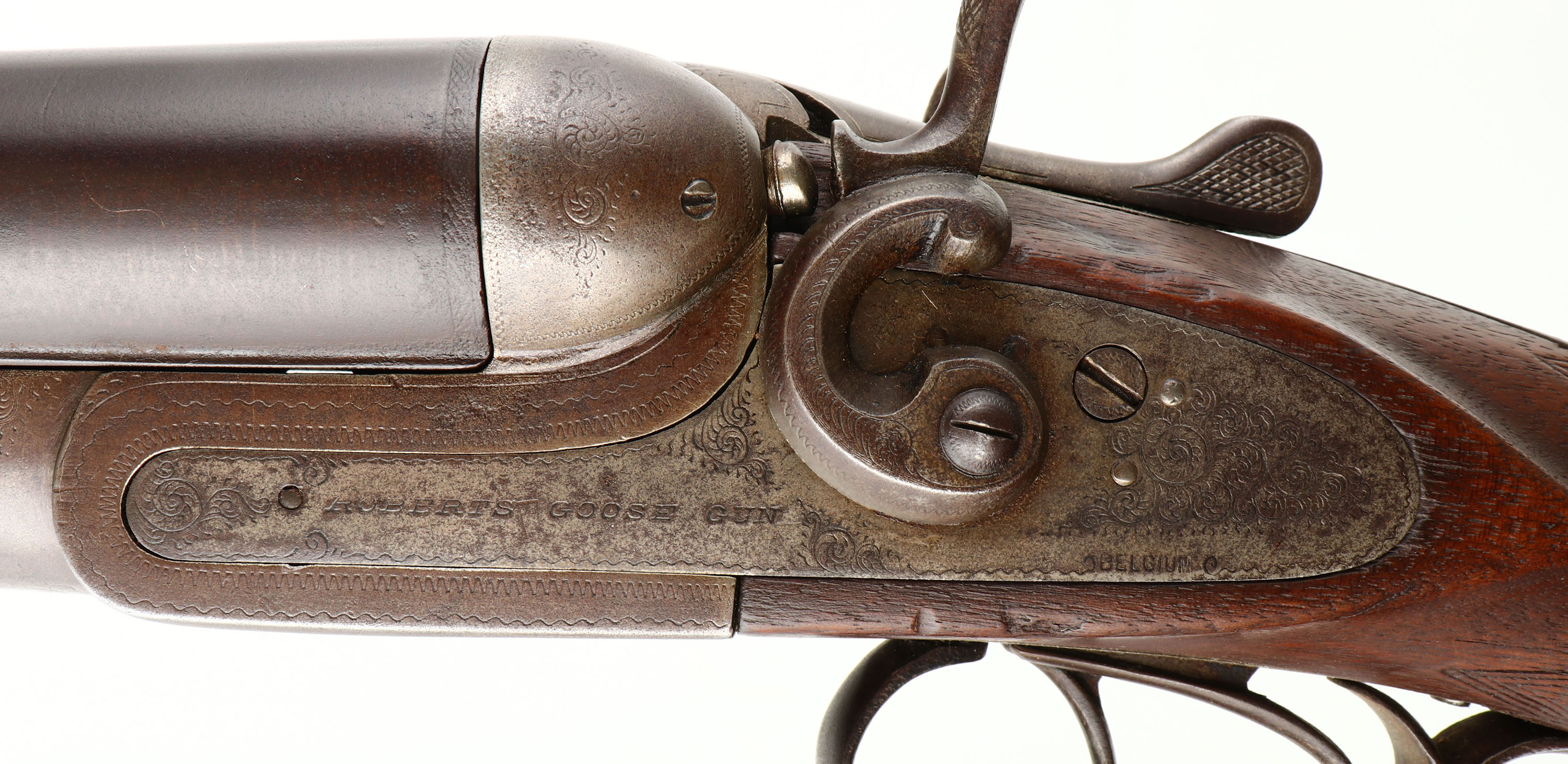 Roberts, Model: Goose Gun, Cal: 8 Ga, MFG: 1893-97, S/N: 2010, Break SxS Shotgun, 36'' damascus barrels. The checkered flat knob semi-pistol grip wood stock is very good with checkering wear, light nicks, dings, & wear from use/age, different color wood star embedded in left & right side of stock. The metal on the barrel has toned to a brown patina with remnants of the damascus pattern, the metal on the receiver has toned to a light brown patina with spots of gun metal gray. Left & right side of receiver is marked ''ROBERTS GOOSE GUN'', ''BELGIUM'', all side of the receiver is marked with nice ornamental engravings. Bores are very good, left bore has light roughness, right bore has roughness & light pitting. Barrel rib holds a bead front sight. Stock carries a grooved hard rubber buttplate. Lockup has a slight gap between barrels & recover & has small amount of play. LOP: 15'', DAH: 3 1/8'', DAC: 1 3/4''. Damascus barrels are not safe to shoot smokeless loads or steel shot out of. Antique No FFL Req. - Value: 2000 to 4000