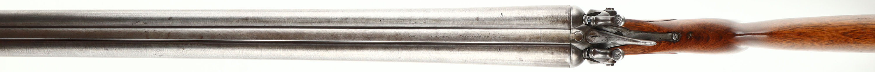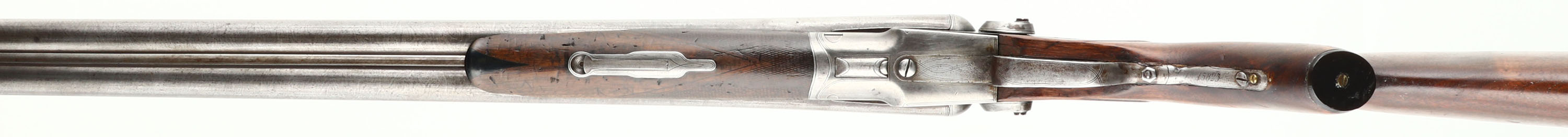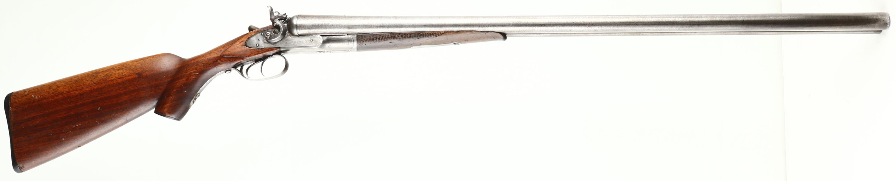 Colt, Model 1878, CAL: 10GA, MFG: 1883, SN: 15823, Break Action SxS Shotgun, Choke: N/A, 30'' Damascus barrels. The replaced & refinished flat pistol grip stock is good. The stock is slightly loose, has a repair screw behind the upper tang, contusions, scrapes, dings & a couple small edge chips at the toe. The original checkered forend with ebony tip is good. The right side has a 3'' sliver, smooth checkering & has multiple small nicks & dings. The damascus barrels have fully worn to metal gray, with areas of thin brown patina. The receiver has fully worn to metal gray, with buff lines. Bores are fair, with consistent pitting & roughness. The solid rib holds a single front bead. Stock carries a grooved plastic buttplate. Replacement screws on the lower tang. Notice: Damascus barrels are not safe to shoot smokeless powder or steel shot out of. LOP: 15''. Antique, No FFL Req. - Value: 500 to 1000