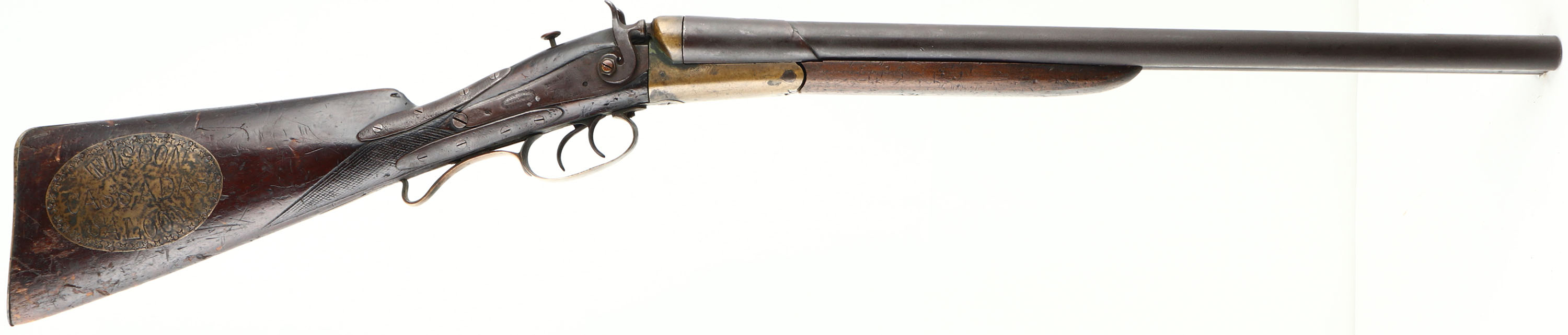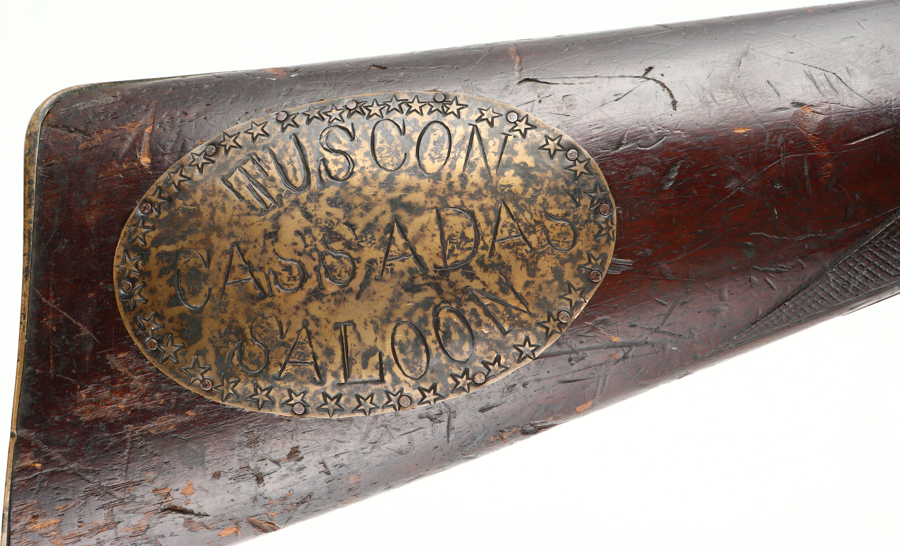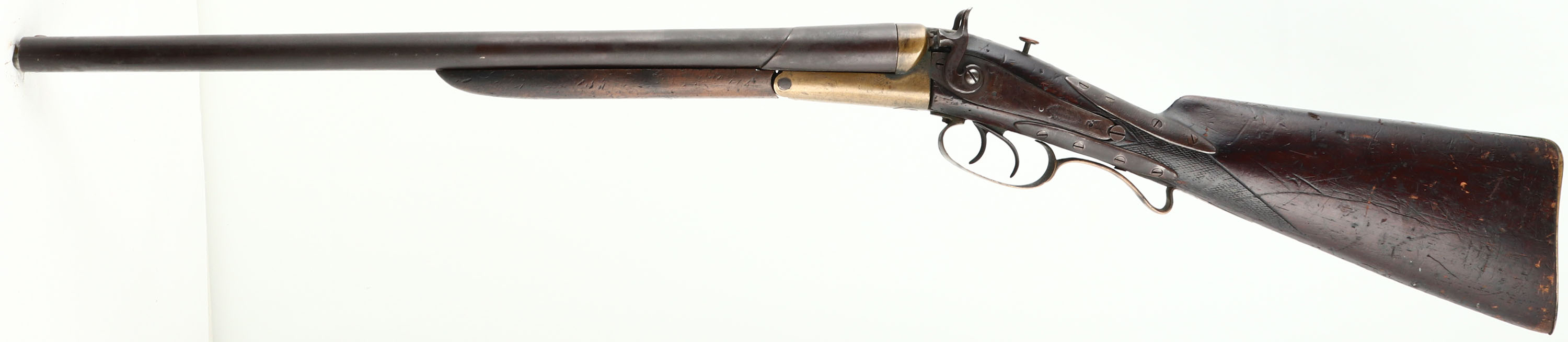 G.G. Julcher Hammer Double Shotgun, CAL: 12 GA, MFG: mid 1800's, SN: NSN, Break Action SxS Shotgun, 20 1/2'' barrels. The checkered straight grip stock is fair. The wrist was broken long ago & is held together by four nicely executed metal plates & screws. There are numerous contusions, scratches, nicks & dings. There is a brass plate on the right side of the stock that reads ''TUCSON CASSADAS SALOON''. The barrels & side plates have fully toned to a rust brown patina. There are simple game scene engravings on both sides. The very unique brass receiver, as well as the brass trigger guard & buttplate show wear, with aged patina. Bores are poor, dark & rough. Unique push button break mechanism. The solid rib has a screw head as a front sight. Left firing pin & one screw on upper tang are missing. The screws holding on the hammers are mis-matched. LOP: 14 1/4''. Overall, a well used old west frontier shotgun & cool ''wall hanger''. Antique, No FFL Req. - Value: 300 to 600
