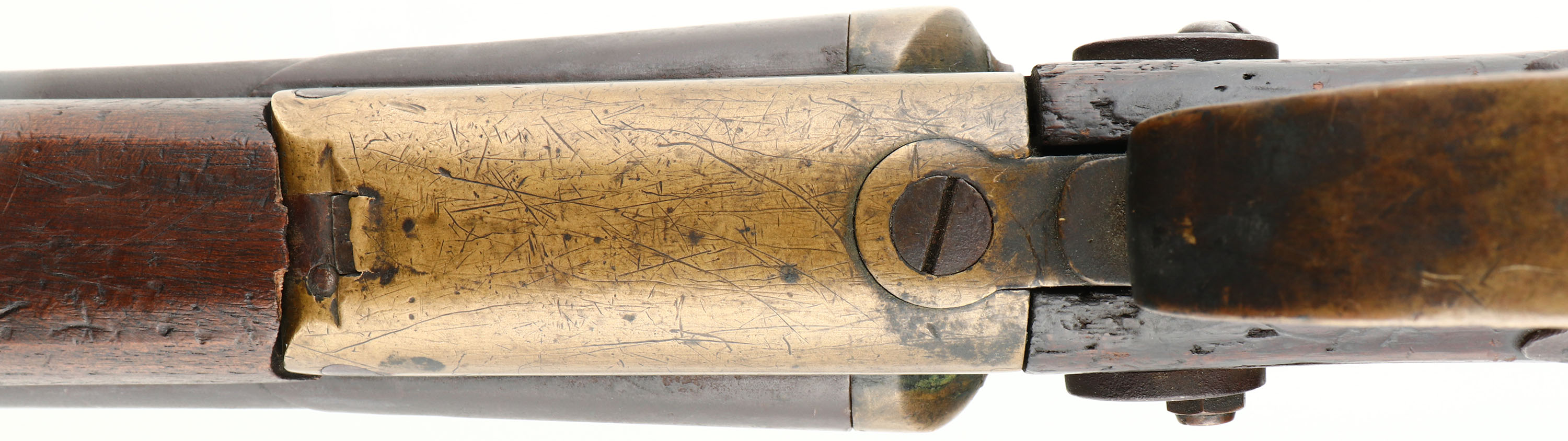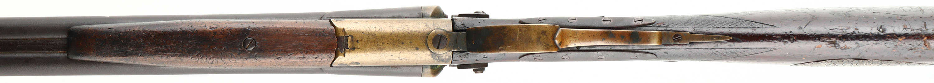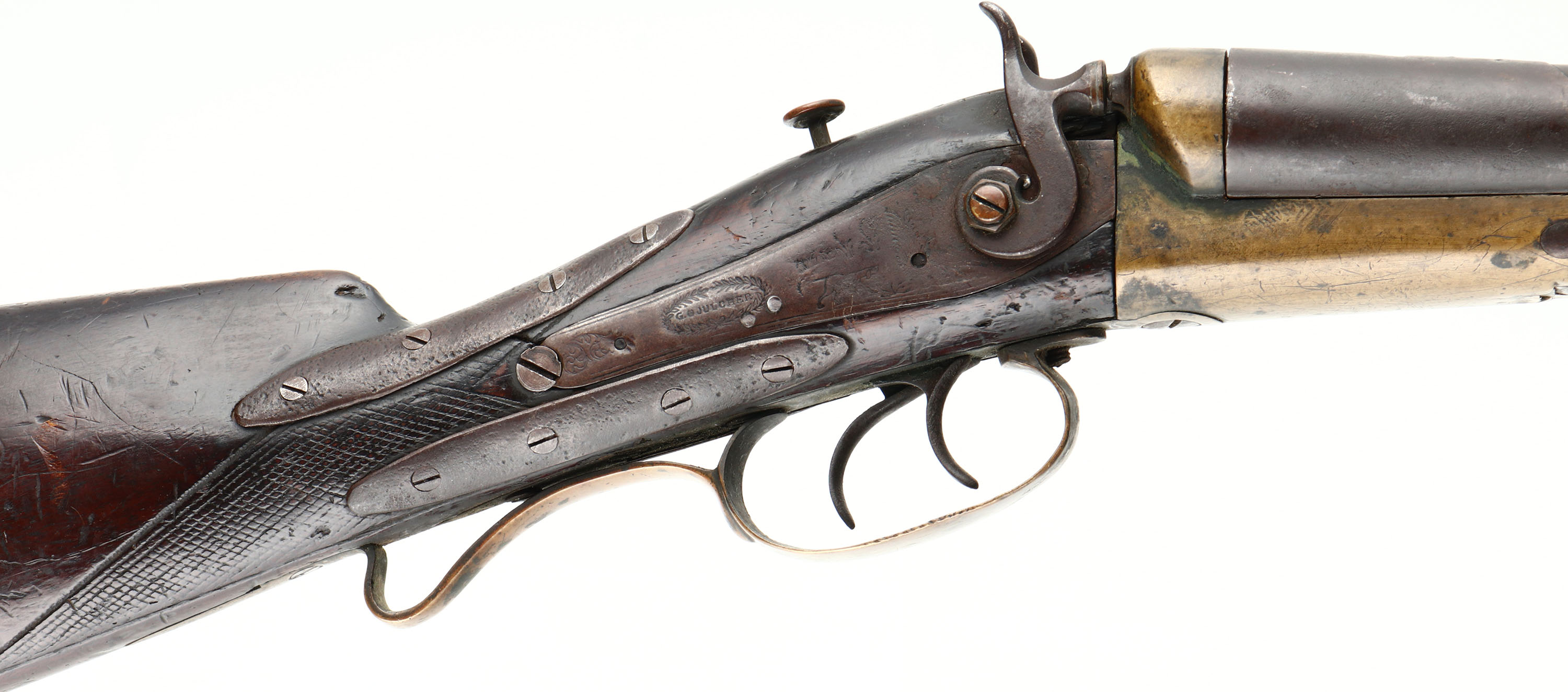 G.G. Julcher Hammer Double Shotgun, CAL: 12 GA, MFG: mid 1800's, SN: NSN, Break Action SxS Shotgun, 20 1/2'' barrels. The checkered straight grip stock is fair. The wrist was broken long ago & is held together by four nicely executed metal plates & screws. There are numerous contusions, scratches, nicks & dings. There is a brass plate on the right side of the stock that reads ''TUCSON CASSADAS SALOON''. The barrels & side plates have fully toned to a rust brown patina. There are simple game scene engravings on both sides. The very unique brass receiver, as well as the brass trigger guard & buttplate show wear, with aged patina. Bores are poor, dark & rough. Unique push button break mechanism. The solid rib has a screw head as a front sight. Left firing pin & one screw on upper tang are missing. The screws holding on the hammers are mis-matched. LOP: 14 1/4''. Overall, a well used old west frontier shotgun & cool ''wall hanger''. Antique, No FFL Req. - Value: 300 to 600