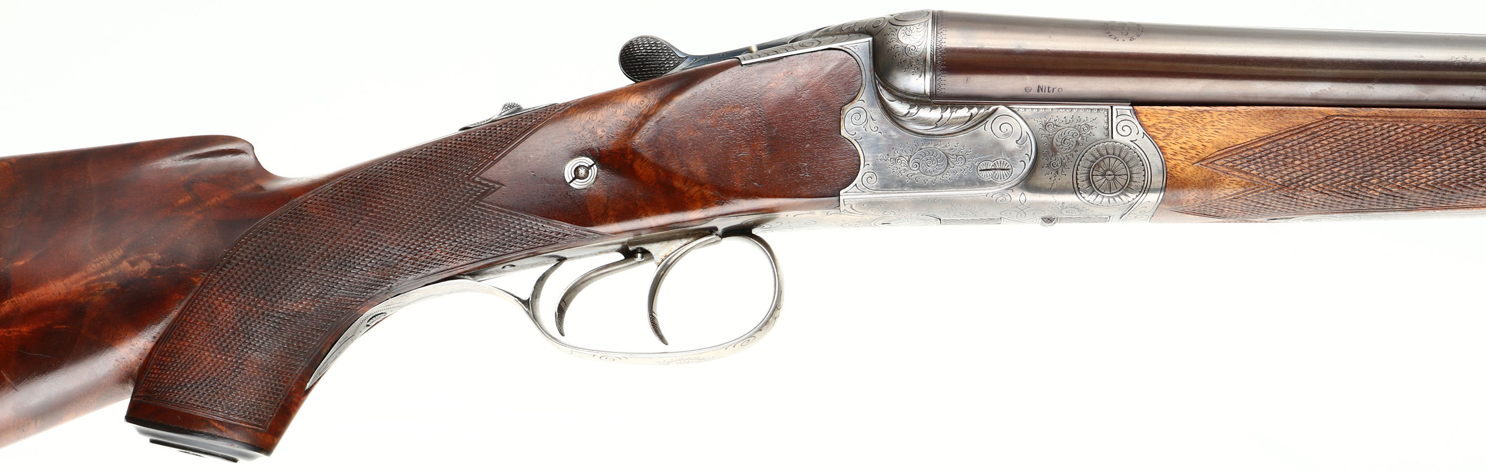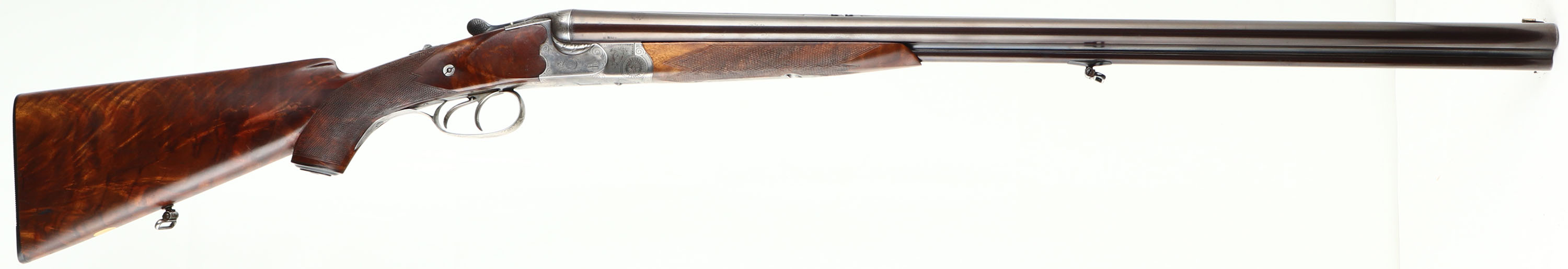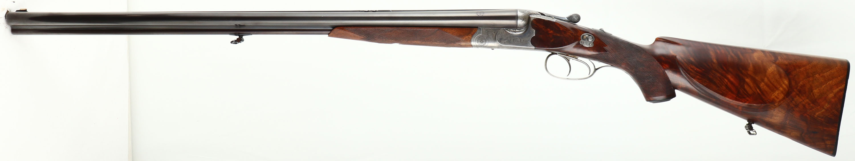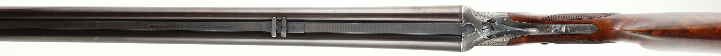 H. Barella, German 3-Barrel Drilling, CAL: 16x16x7mm, MFG: N/A, SN: 2033, Break Action Combo Gun, 26 3/4'' barrels. The tops of the barrels have a roll stamp that reads in a circular fashion ''KRUPP STAHL'', with an accent design in the middle. The sides of the barrels next to the receiver are marked ''NITRO'', with proof marks. The original fancy checkered & capped pistol grip stock with beaded cheek & pointed forend are excellent. There are handling marks to the finish & a small chip fill at the toe. The stock has beautiful figure, with feathered & rippled grain patterns. There is a blank small gold oval nameplate behind the rear sling loop. The metal blue finish on the barrels rates 95%, slightly toned plum. The receiver, break lever, trigger guard, forend break lever & screws all display simple ornamental & accent pattern engraving. The receiver is case-hardened, mostly worn to metal gray, but retains faint case-colors in protected areas. Bores are excellent, with visible light wear. The matted barrel rib holds a pair of folding leaf rear sights & a brass blade front sight. The first flip-up sight can be utilized by pushing the lever forward on the upper tang & the second rear sight has to be manually flipped. Factory sling loops present. Stock carries a grooved plastic buttplate. A beautiful hand crafted high condition German Drilling. LOP: 14'' to front trigger, DAH: 2'', DAC: 1 1/4''.* FFL or C&R Req. - Value: 2000 to 3000
