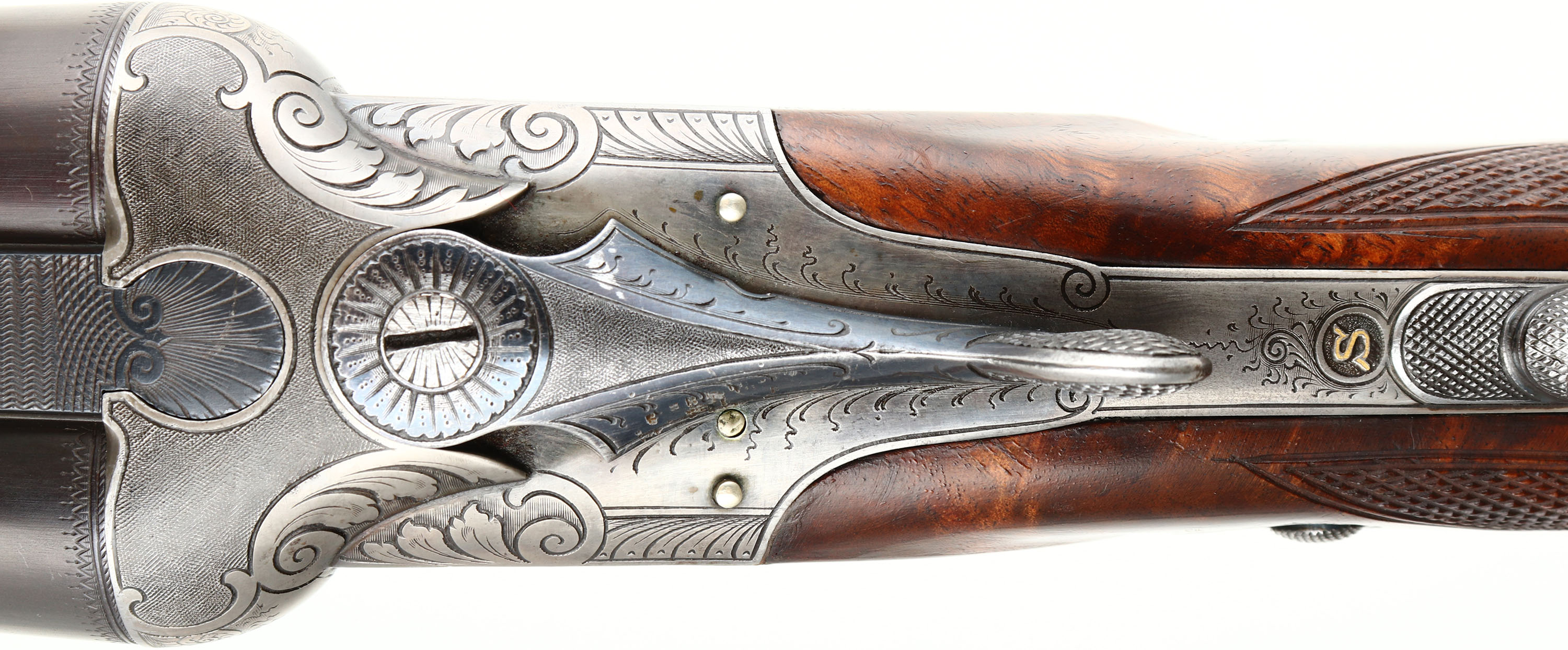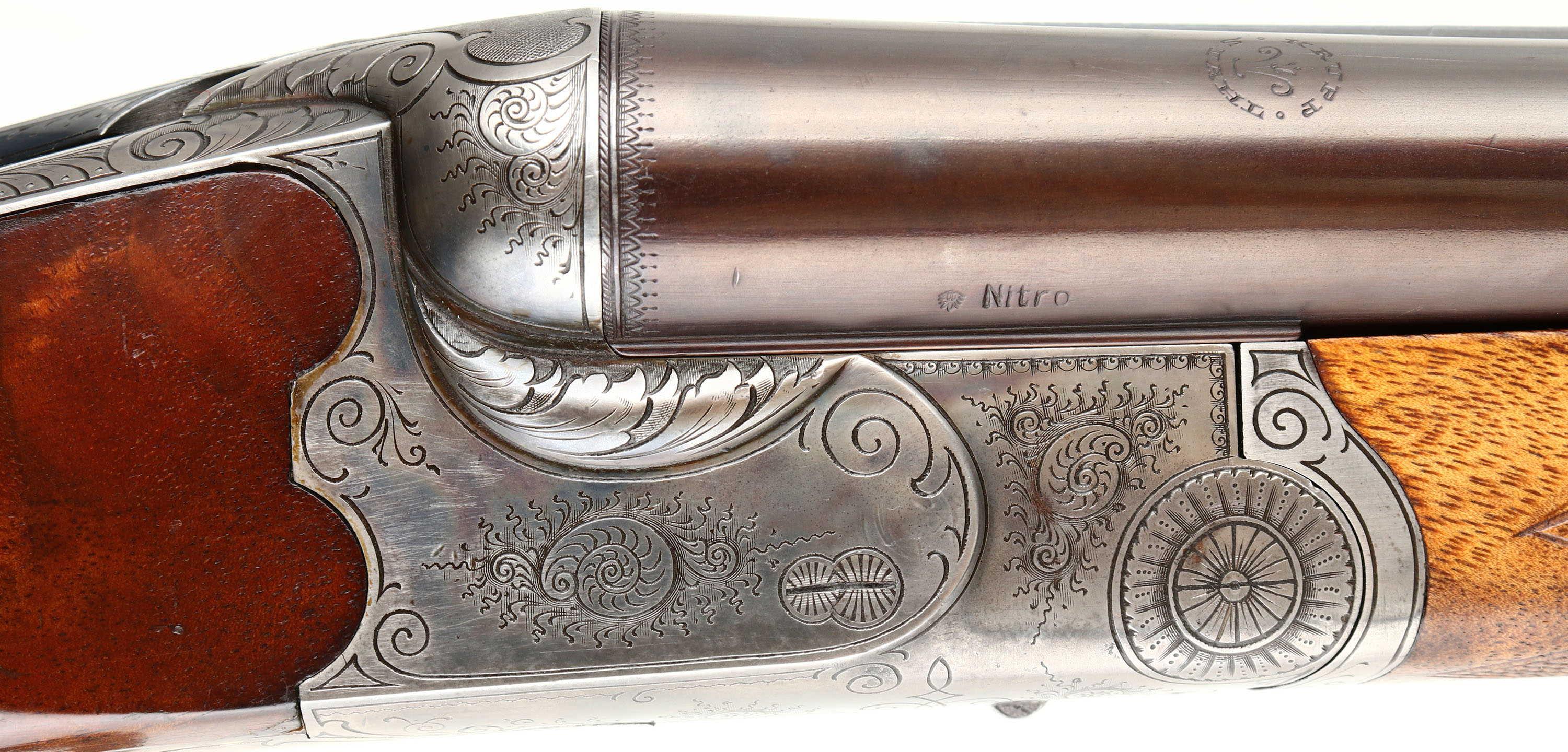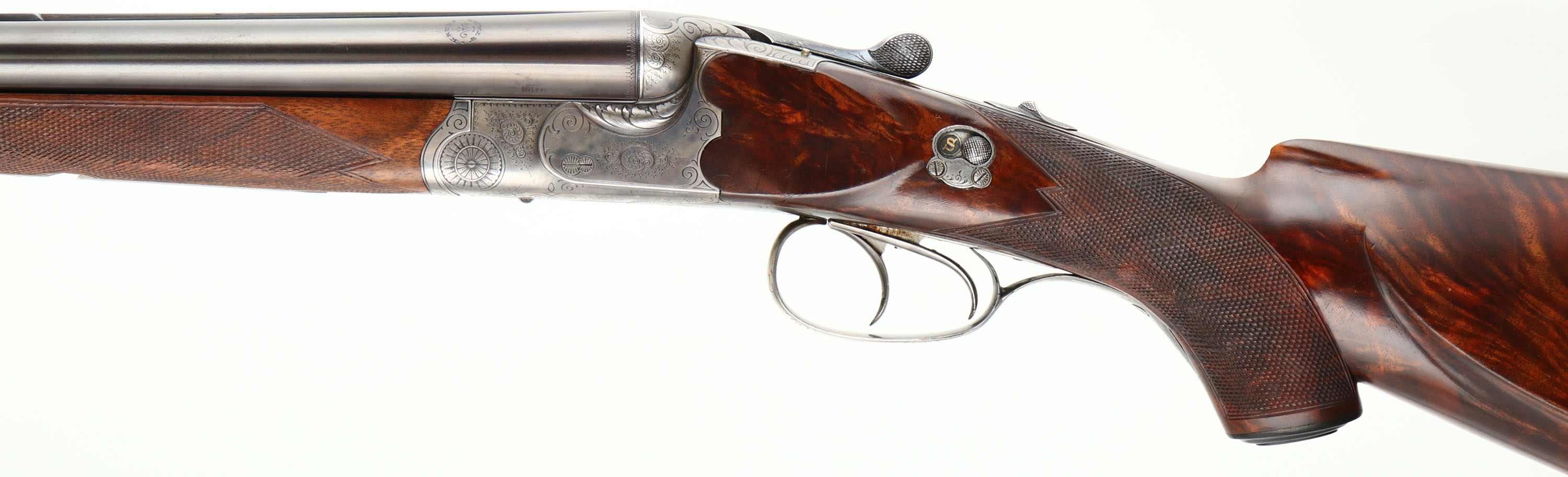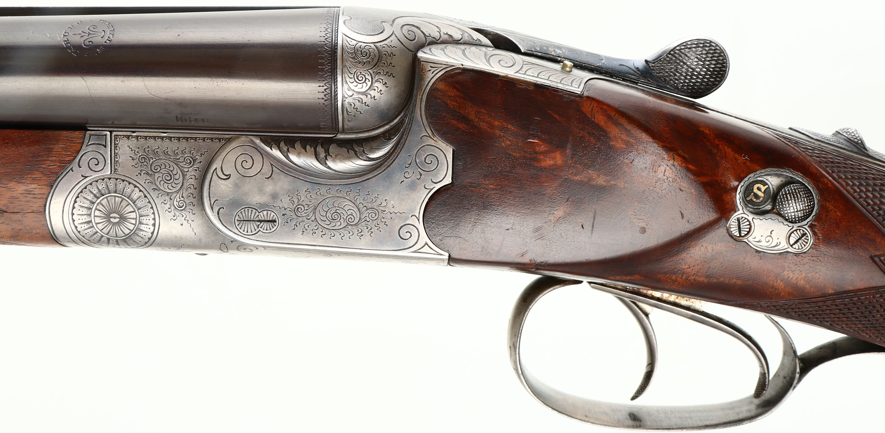H. Barella, German 3-Barrel Drilling, CAL: 16x16x7mm, MFG: N/A, SN: 2033, Break Action Combo Gun, 26 3/4'' barrels. The tops of the barrels have a roll stamp that reads in a circular fashion ''KRUPP STAHL'', with an accent design in the middle. The sides of the barrels next to the receiver are marked ''NITRO'', with proof marks. The original fancy checkered & capped pistol grip stock with beaded cheek & pointed forend are excellent. There are handling marks to the finish & a small chip fill at the toe. The stock has beautiful figure, with feathered & rippled grain patterns. There is a blank small gold oval nameplate behind the rear sling loop. The metal blue finish on the barrels rates 95%, slightly toned plum. The receiver, break lever, trigger guard, forend break lever & screws all display simple ornamental & accent pattern engraving. The receiver is case-hardened, mostly worn to metal gray, but retains faint case-colors in protected areas. Bores are excellent, with visible light wear. The matted barrel rib holds a pair of folding leaf rear sights & a brass blade front sight. The first flip-up sight can be utilized by pushing the lever forward on the upper tang & the second rear sight has to be manually flipped. Factory sling loops present. Stock carries a grooved plastic buttplate. A beautiful hand crafted high condition German Drilling. LOP: 14'' to front trigger, DAH: 2'', DAC: 1 1/4''.* FFL or C&R Req. - Value: 2000 to 3000