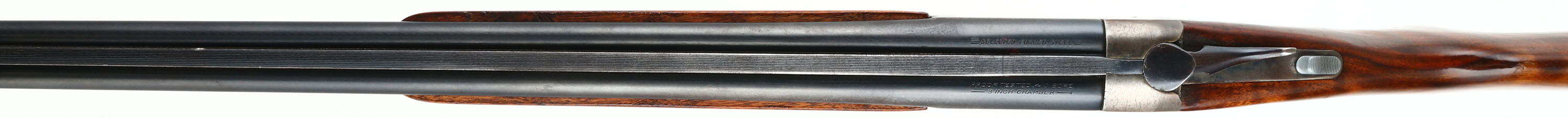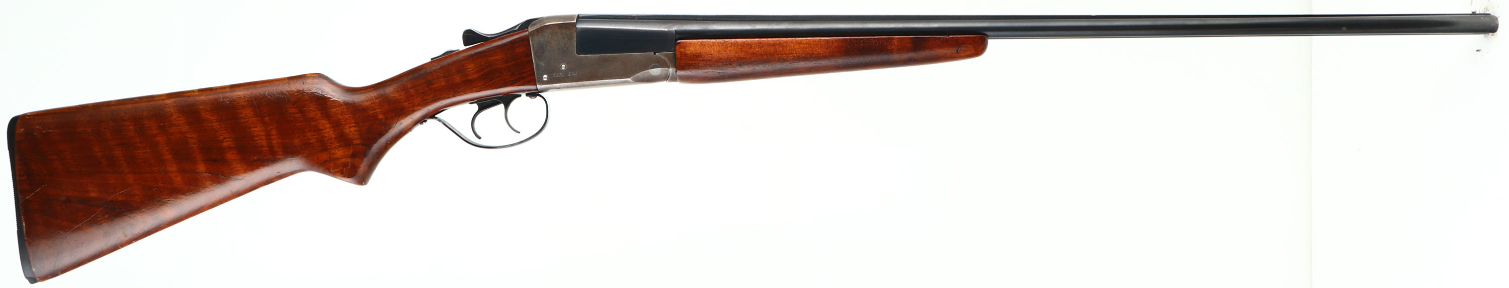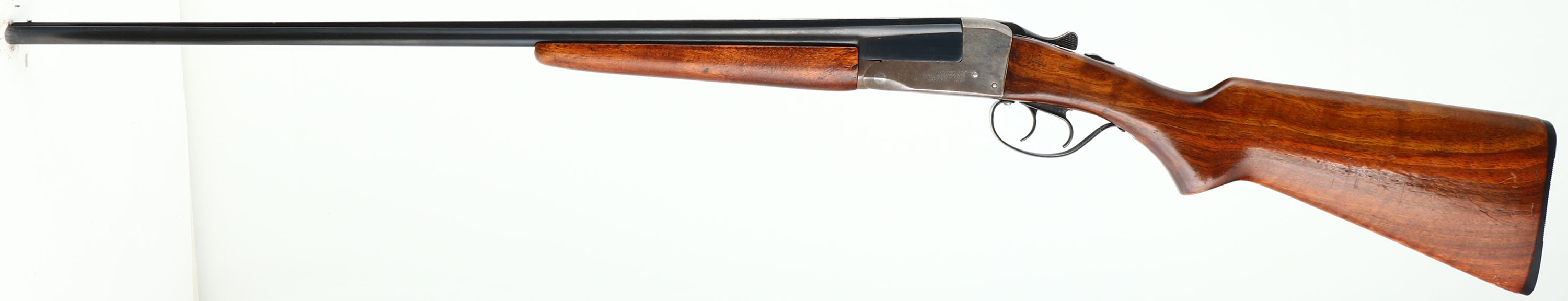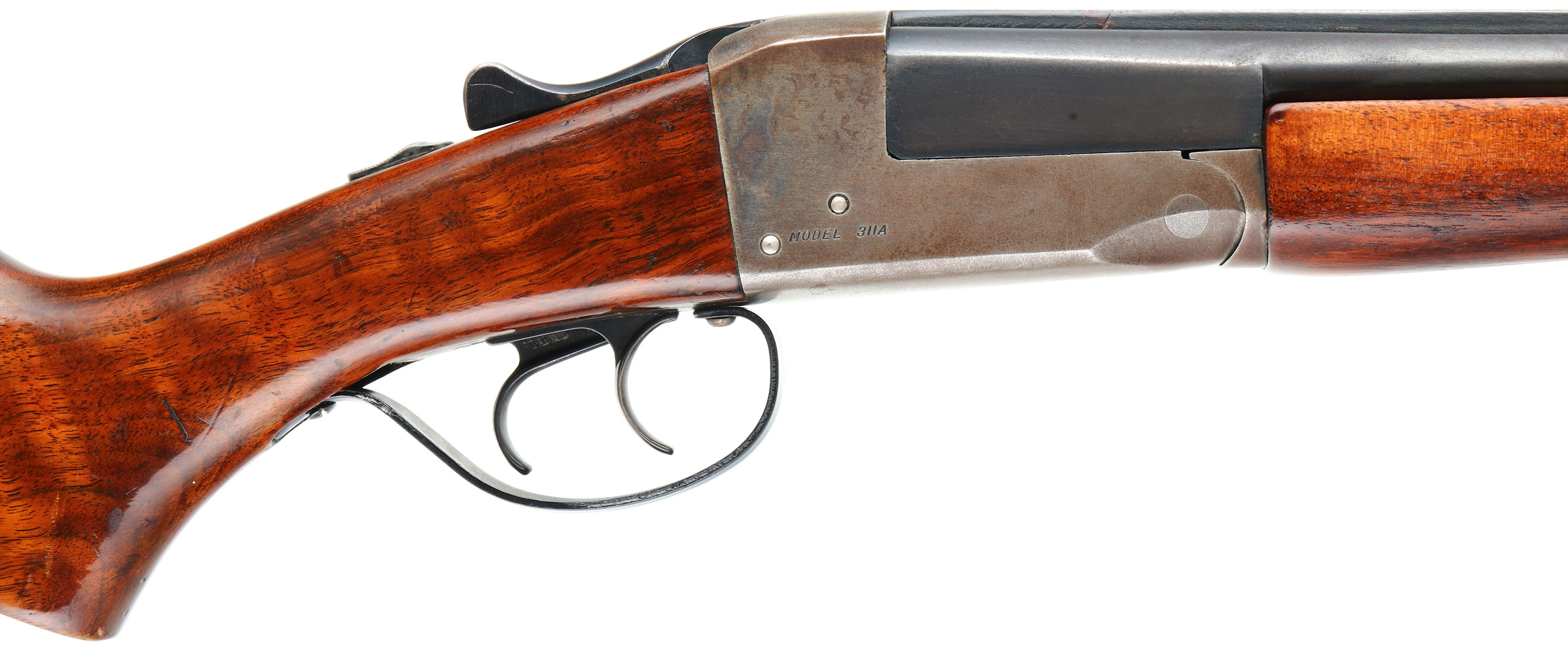 Stevens, Model 311A, CAL: 410GA, MFG: 1949-65, SN: N/A, Break Action SxS Shotgun, Choke: N/A, 3'' Chamber, 26'' barrels. The original flat pistol grip wood stock is very good, having been refinished. There are contusions, dings, scratches & scrapes to the added finish. The metal blue finish on the barrels rates 80%, with areas thinning to metal gray, slightly toned to a brown patina. The receiver is case-hardened, mostly worn to metal gray & toned to a brown patina with remnants of case-colors in protected areas. Bores are excellent. The solid, matted rib holds a single front bead. Stock carries a grooved plastic buttplate, with a small chip at the toe. Trigger guard replacement screw. LOP: 14 1/4''. FFL or C&R Req. - Value: 400 to 800