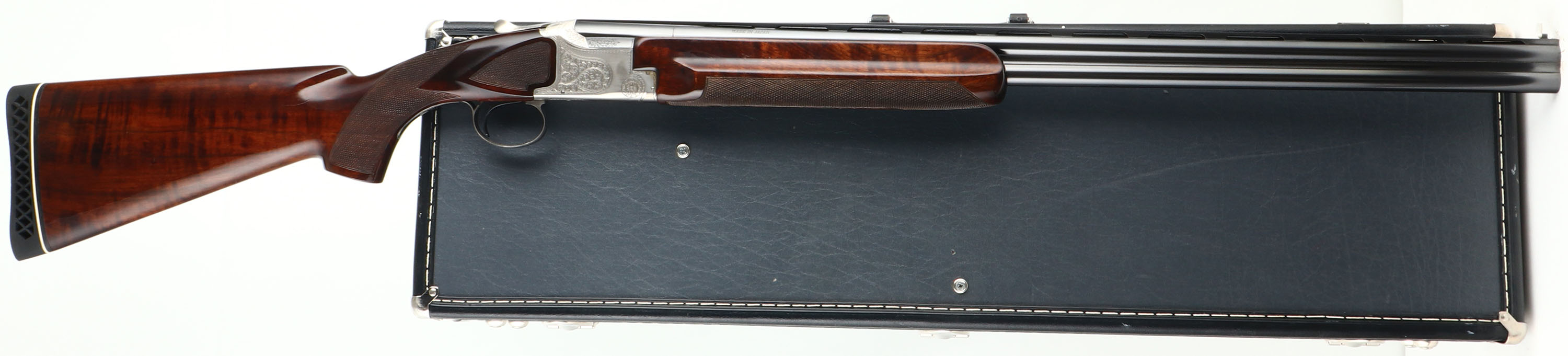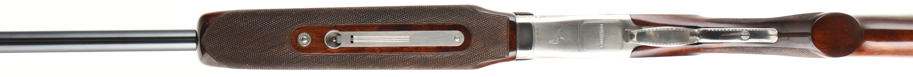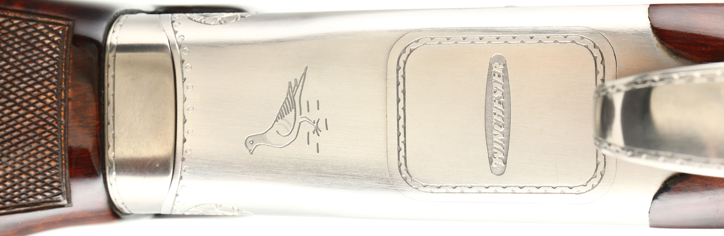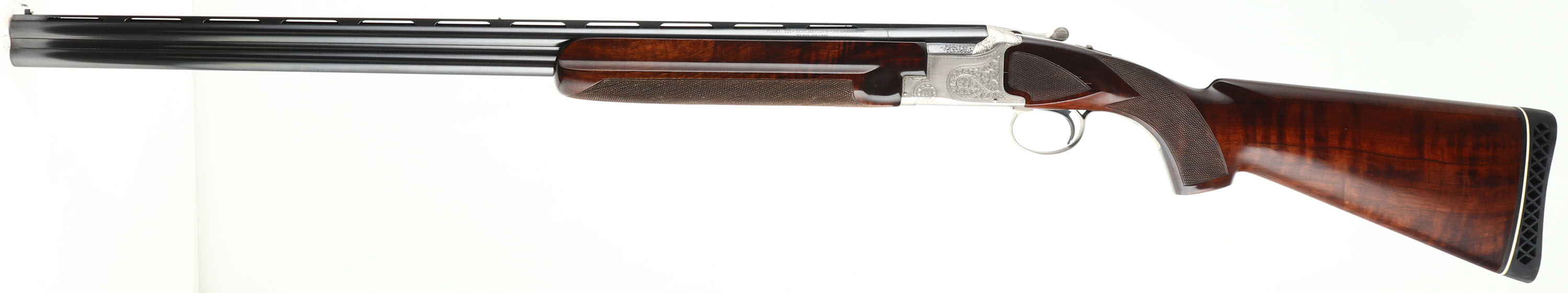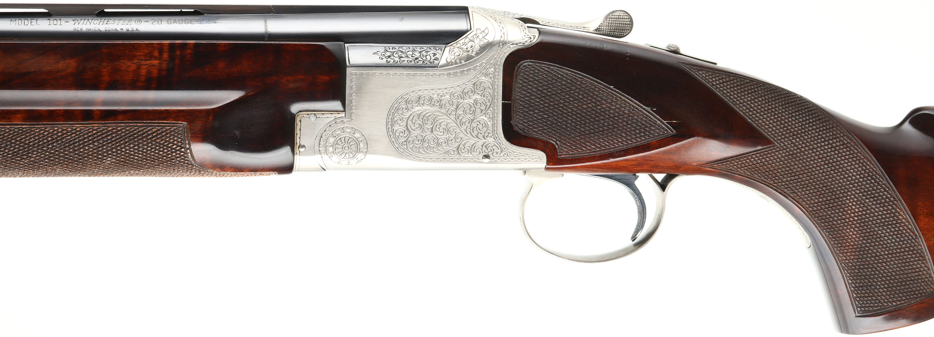 FANTASTIC, Winchester, Model 101, PIGEON GRADE, 20 ga, MFG. 1963-87, SN: PK25707, Over & Under Shotgun, 32'' Matted Ventilated barrels, with two white beads, F/M. The model 101 started production in 1963 with the 12 ga. The 20 ga enter production in 1966 & the 28 ga & .410 bore were first introduced in 1968. Serialization records do not exist beyond 1971 when SN's for the 20 ga., 28 ga. & .410 bore was at 228,500. Production continued between 1971 & 87. It is likely this example's SN places it in the mid 70's. The original checkered & flat knob wood stocks are excellent, with very few tiny handling marks to the high gloss original finish. The original metal blue finish is 98% on barrels, with excellent silver tone finish on the scroll engraved receiver. Belly of receiver carries an engraved pigeon. The matted rib is stamped ''PIGEON GRADE'' & carries white mid & front beads. Bores are excellent. Original Winchester ventilated buttpad. LOP 14 5/8'' over pad. DAC 1 1/4'' & DAH 1 3/4''. Comes in a gray/blue hard case, with warranty card, booklet & sticker. An excellent, original condition & highly collectible Pigeon grade 101. FFL Req. - Value: 2000 to 4000