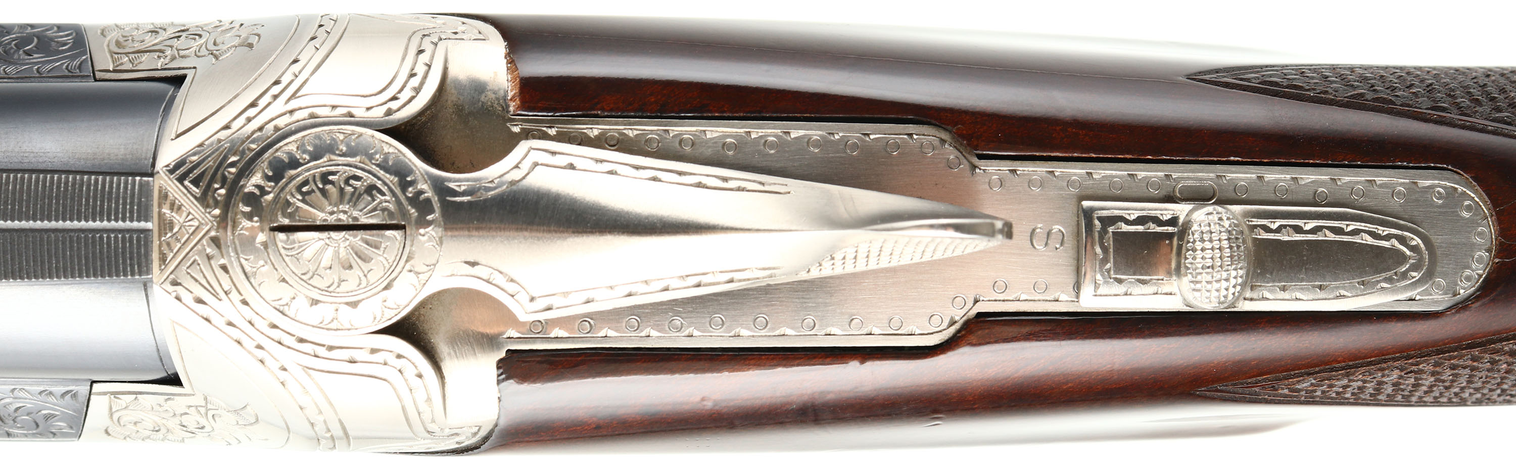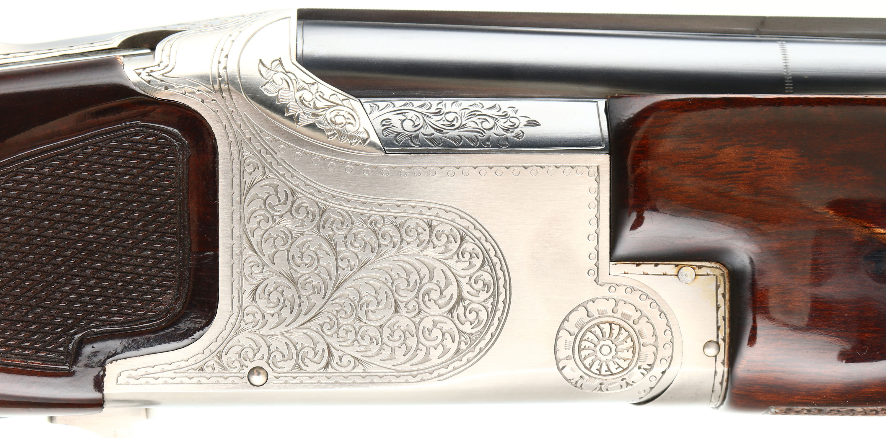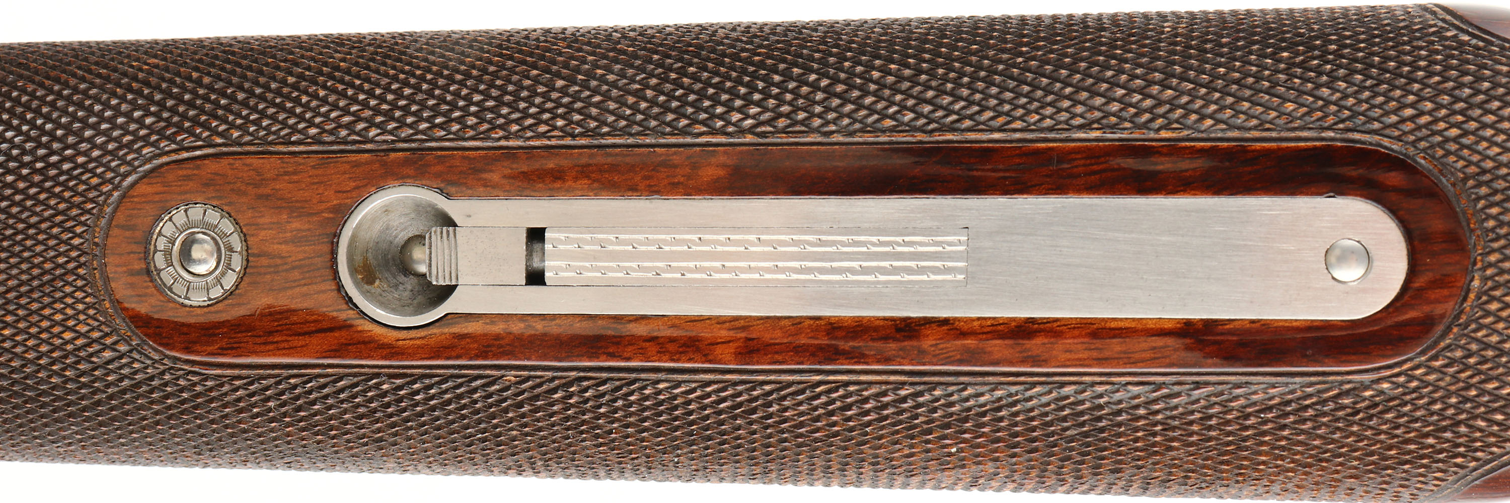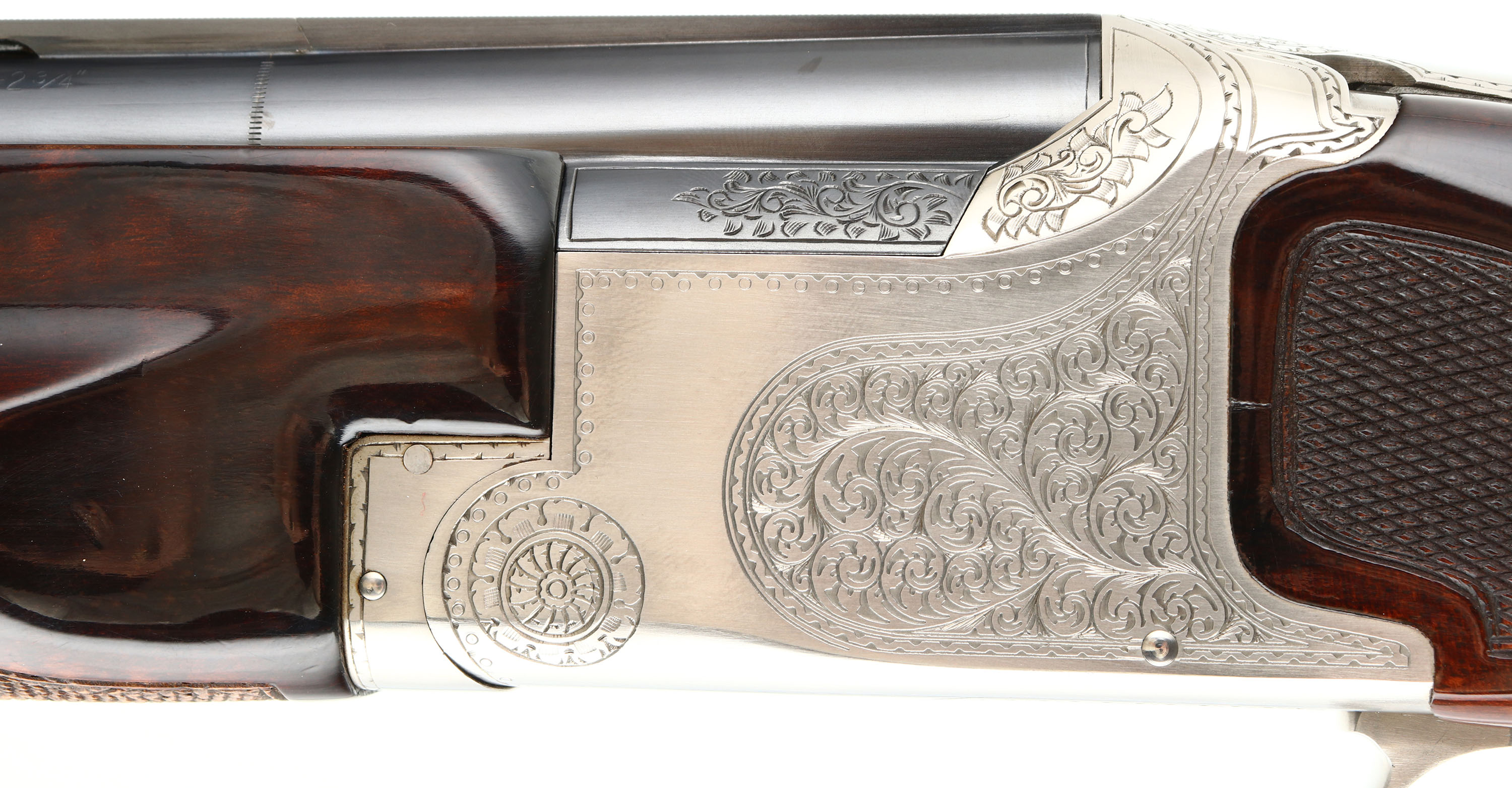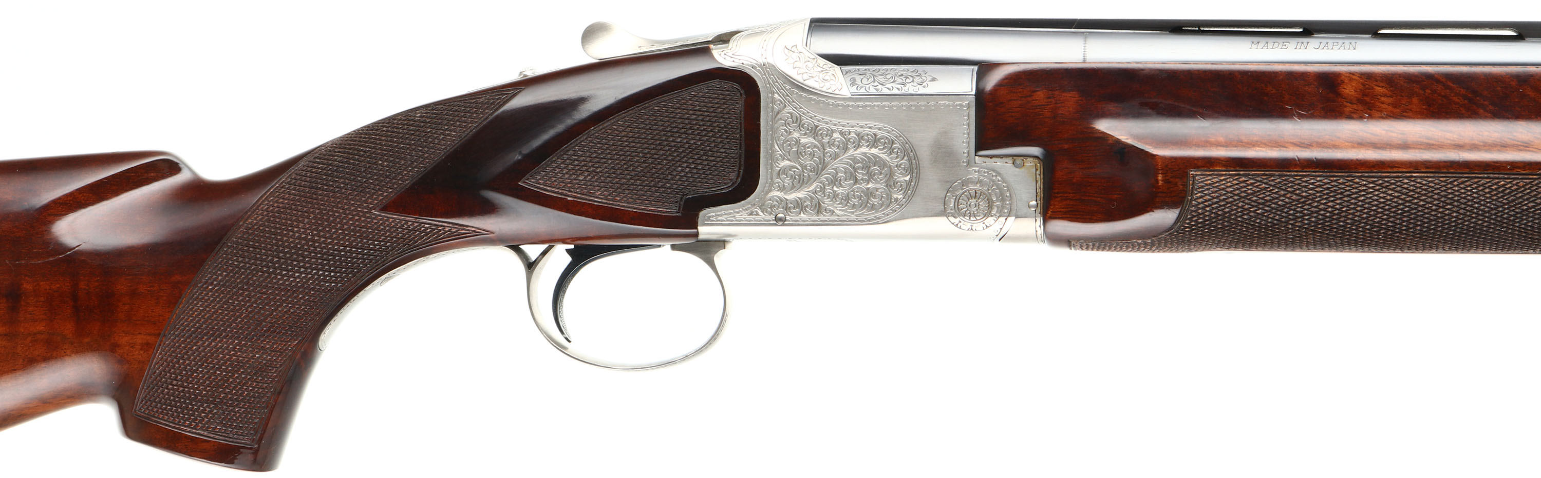 FANTASTIC, Winchester, Model 101, PIGEON GRADE, 20 ga, MFG. 1963-87, SN: PK25707, Over & Under Shotgun, 32'' Matted Ventilated barrels, with two white beads, F/M. The model 101 started production in 1963 with the 12 ga. The 20 ga enter production in 1966 & the 28 ga & .410 bore were first introduced in 1968. Serialization records do not exist beyond 1971 when SN's for the 20 ga., 28 ga. & .410 bore was at 228,500. Production continued between 1971 & 87. It is likely this example's SN places it in the mid 70's. The original checkered & flat knob wood stocks are excellent, with very few tiny handling marks to the high gloss original finish. The original metal blue finish is 98% on barrels, with excellent silver tone finish on the scroll engraved receiver. Belly of receiver carries an engraved pigeon. The matted rib is stamped ''PIGEON GRADE'' & carries white mid & front beads. Bores are excellent. Original Winchester ventilated buttpad. LOP 14 5/8'' over pad. DAC 1 1/4'' & DAH 1 3/4''. Comes in a gray/blue hard case, with warranty card, booklet & sticker. An excellent, original condition & highly collectible Pigeon grade 101. FFL Req. - Value: 2000 to 4000