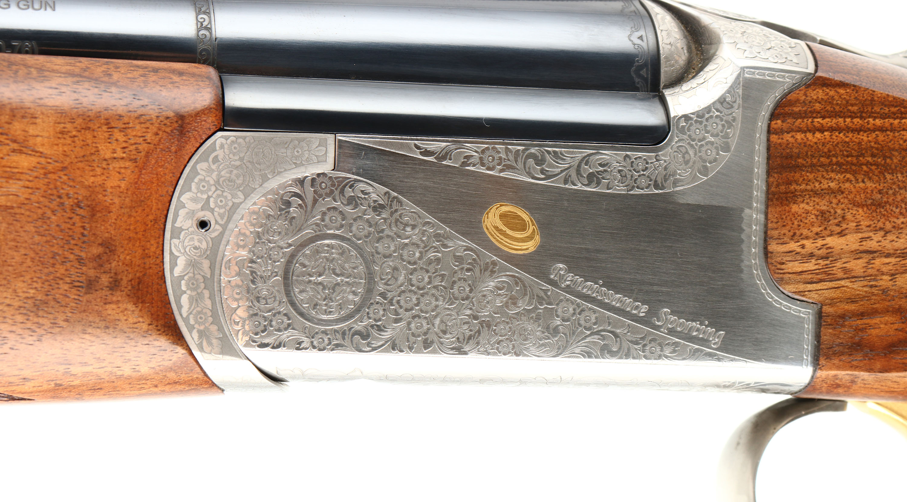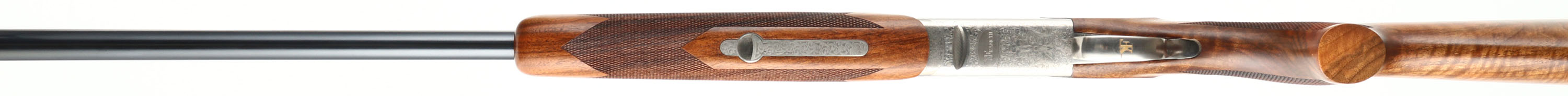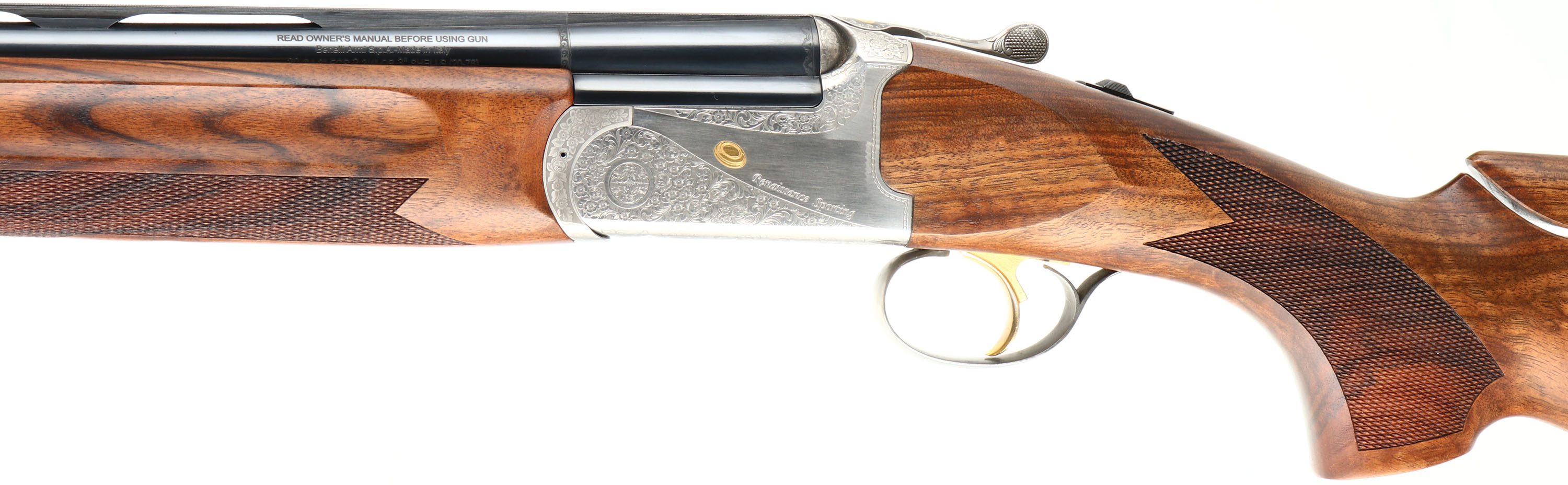 CASED Franchi (Benelli), Model Renaissance Sporting, CAL: 20 GA, MFG: Modern, SN: TB00085, Break Action O/U shotgun, 30'' ported barrels with extended, knurled choke tubes for easy fitting & removal. Franchi marketed this shotgun by saying: Its balance & swing blend in a way that makes the Renaissance Sporting an appealing over & under for clay target shooters at every level. The Renaissance Sporting combines the tradition & technology of Franchi shotguns. The receiver is enhanced with scroll engraving and gold embellishments. The stock, cut from highly figured select walnut and featuring cut checkering, sports a traditional oil finish to complement the beautiful grain pattern of the wood. The stock is further enhanced with an adjustable comb & Franchi's patented, recoil-reducing Twin Shock Absorber system. The original checkered & flat pistol grip wood stocks are excellent, as is the original finish. There is a bit of haze on the right side of stock due to storage. The metal blue finish rates 99% overall. The satin silver finish on receiver is excellent. Bores are excellent. The ventilated & matted rib holds a fiber optic front rail. Weighing in at 8 pounds, this Franchi shotgun uses an extra-strong, stainless steel box-lock action capable of handling a steady diet of high-brass target loads. Gold trigger. Comes in its original hard plastic case, with extra choke, choke tool, booklet & hang tags. An excellent overall & fantastic quality sporting shotgun. LOP: 14 1/2'' overpad, DAH: 1 7/8'', DAC: 1 3/8''. FFL Req. - Value: 1000 to 1800