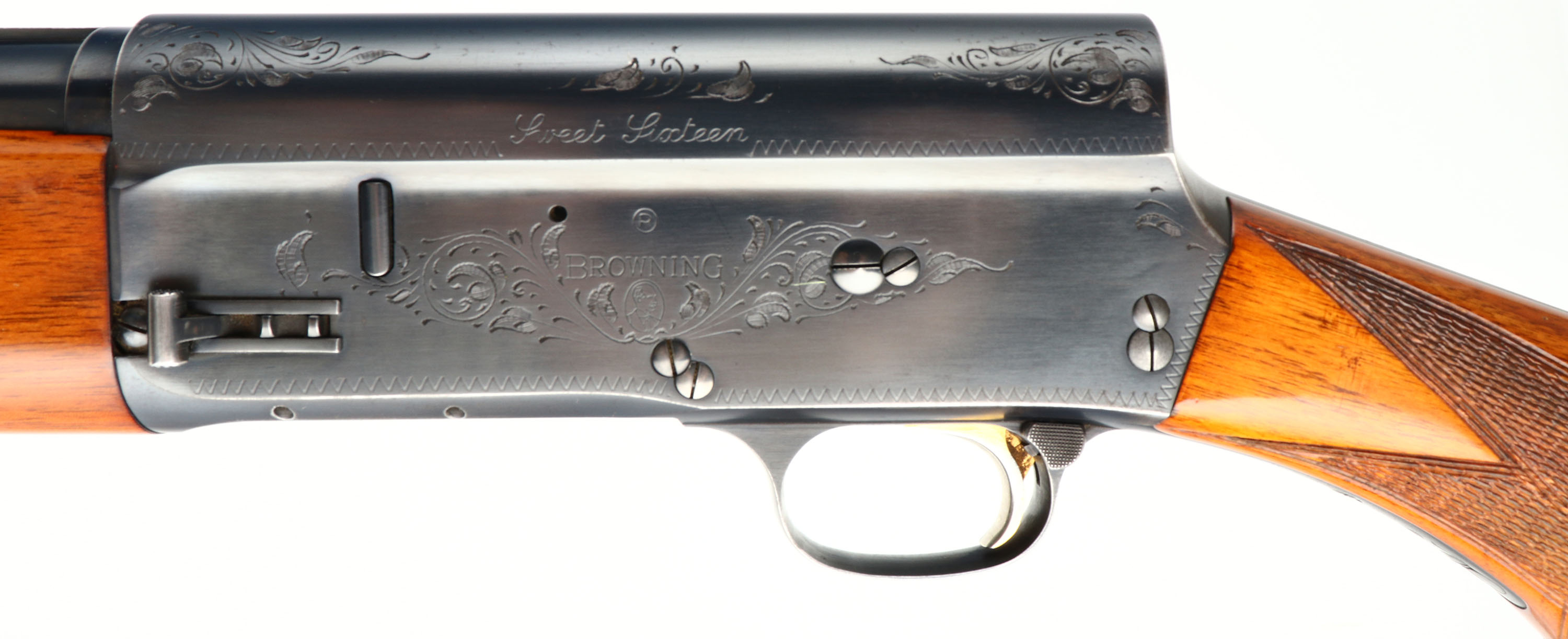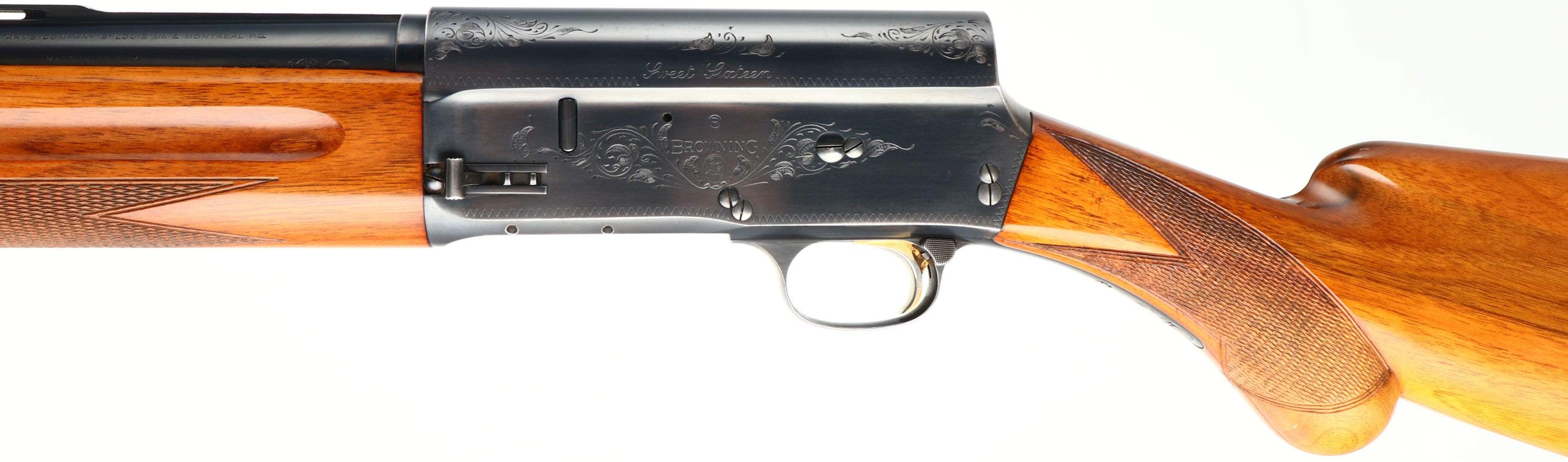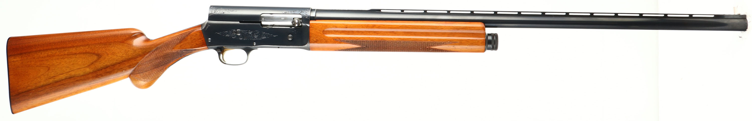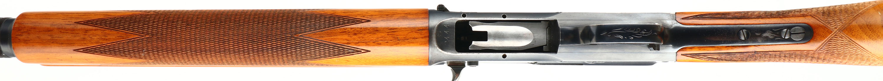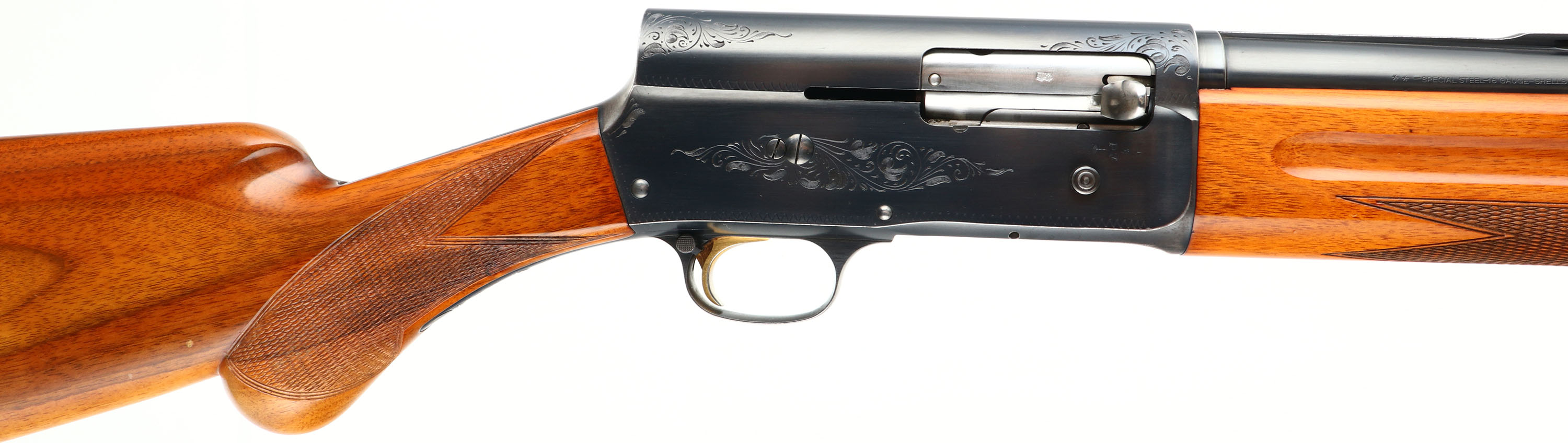Browning, Model A-5 Sweet Sixteen, FN made in Belgium, 16 GA., MFG. 1963, SN: 3S-2444, Semi-Auto Shotgun, 2 3/4'', Marked ** or MOD choke, 25 5/8'' Ventilated rib ''Special Steel'' barrel. Barrel marked 77551. The original checkered, round knob pistol grip wood stocks are excellent, with excellent high gloss finish. There are a few tiny contusions or small scratches. The original metal blue finish is 95% overall. Barrel carries the Part # H25502. Bore is excellent. FN Browning factory buttplate. Gold trigger. Single front bead. There are a couple of ding/gouges along the left edge of the rib near the bead. Gold trigger. 14 1/4'' LOP. Overall, a high condition & collectible, Belgium made Sweet Sixteen. FFL or C&R Req. - Value: 1000 to 2000