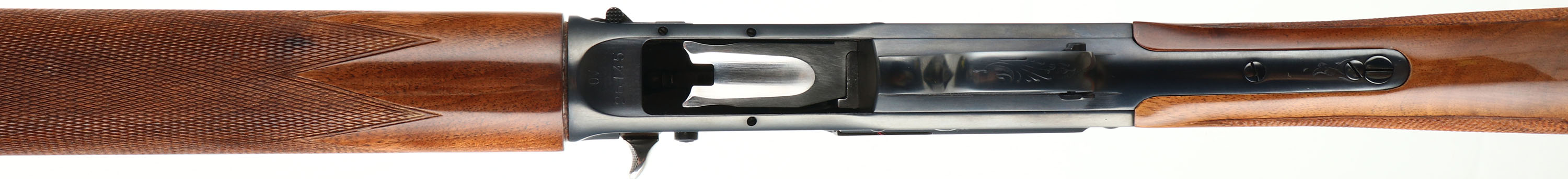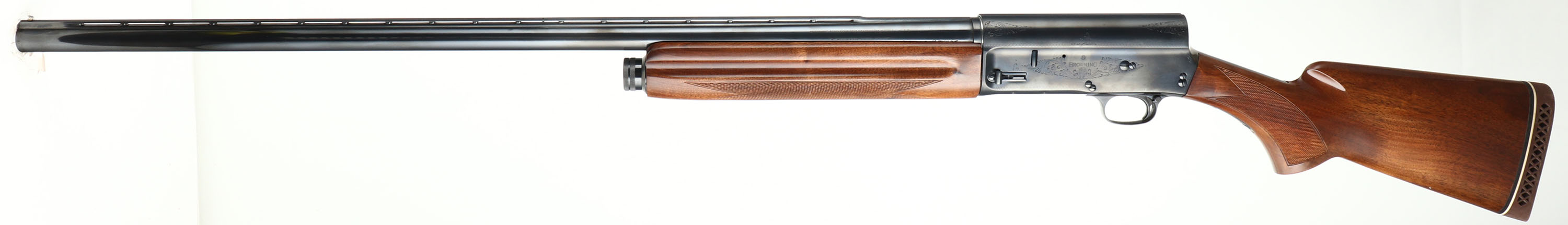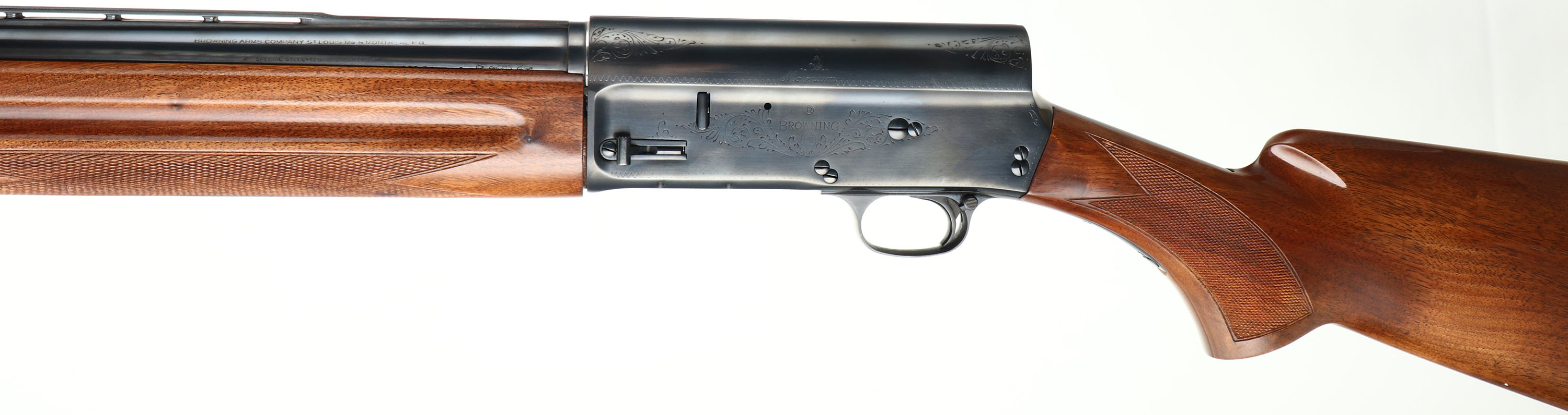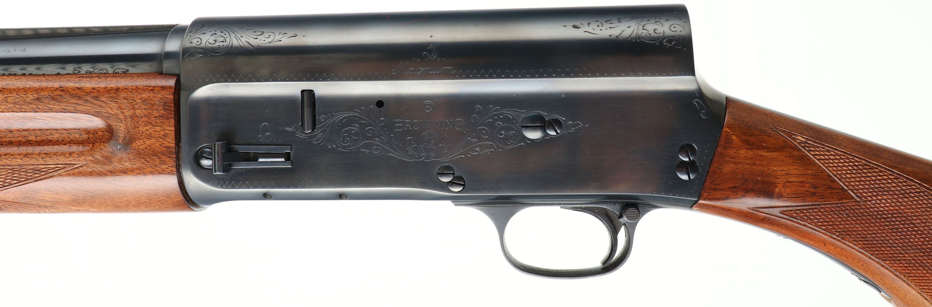 Browning, Model A5 Magnum Twelve, CAL: 12 GA, MFG: 1960, SN: 0V26145, Semi Auto Shotgun, 3'' chamber, 31 1/2'' Ventilated barrel. The checkered & flat pistol grip wood stocks are excellent, as later production replacements. There are very few light finish level handling marks to the original finish. The restored metal blue finish rates 99% overall, with some thinning of the engraving & stamping during bluing prep. The receiver displays simple scroll, vine & border engravings. Bore is excellent & bright. The ventilated rib missing the mid bead, & therefore has a single front bead. Buttstock carries a ventilated Browning recoil pad. 14 1/4'' LOP over pad. The bolt is a little sticky. May need to be cleaned & oiled. A nice looking Magnum & a great duck or goose gun. FFL or C&R Req. - Value: 400 to 800